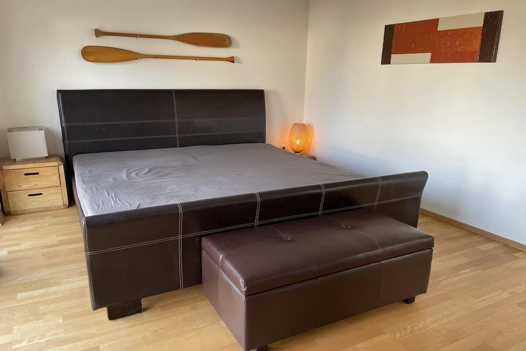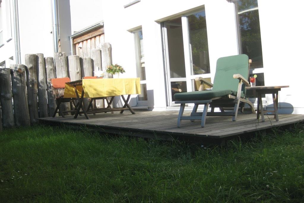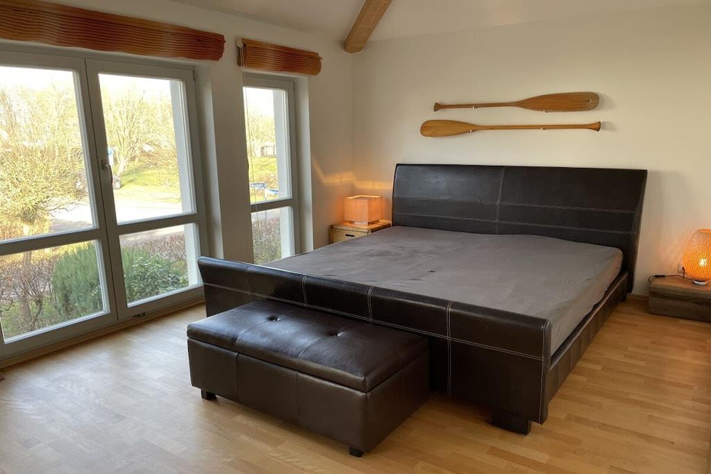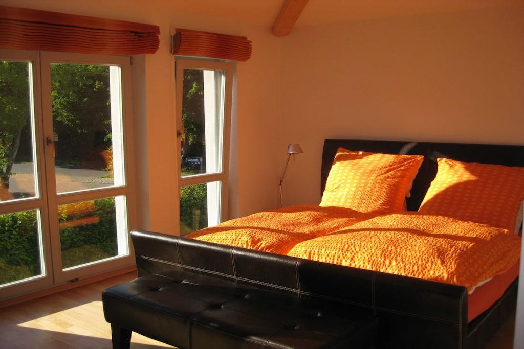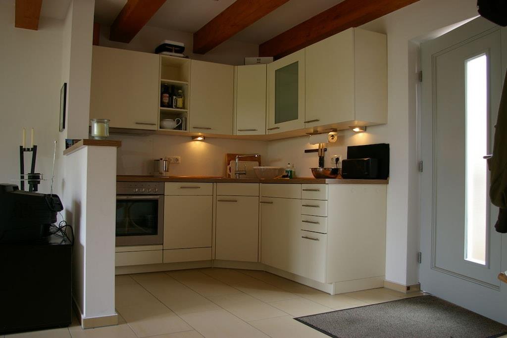 Im Erdgeschoss befindet sich das Wohnzimmer, die Einbauküche und das Badezimmer mit angeschlossener Sauna. Das Obergeschoss verfügt über ein Schlafzimmer und ein weiteres kleines Zimmer, welches als Kinderzimmer oder zweites Schlafzimmer genutzt werden kann. Vom Wohnzimmer abgehend gibt es eine sonnige Terrasse mit Westausrichtung hinter einer geschützten Buchenhecke, die im Sommer zum Grillen oder Sonnenbaden einlädt. Durch die vorteilhafte Himmelsausrichtung und die bodentiefen Fenster im Wohn- und Schlafbereich ist das Ferienhaus lichtdurchflutet. Die komplett eingerichtete Küche bietet alles, um sich seine Mahlzeiten selbst zuzubereiten; die kleine Spülmaschine erledigt dann geschwind den Abwasch.