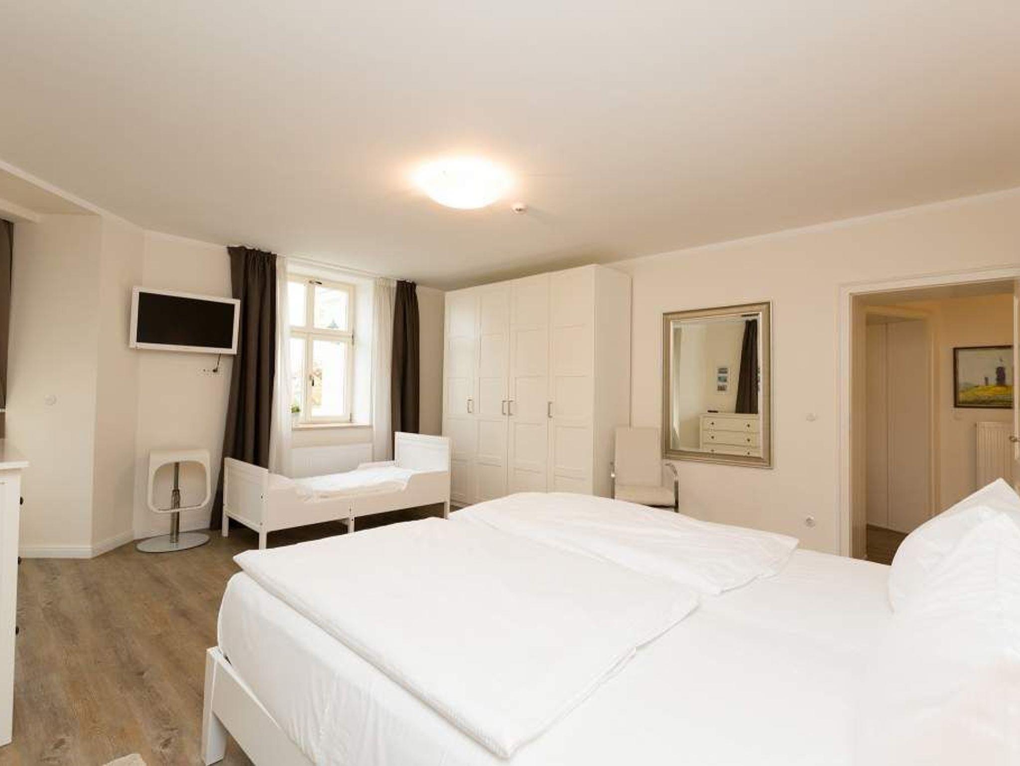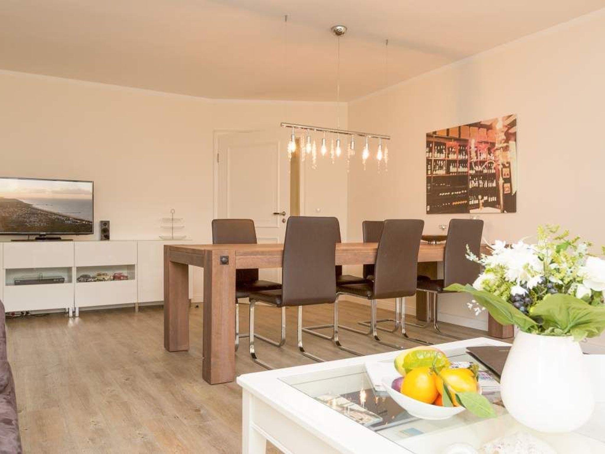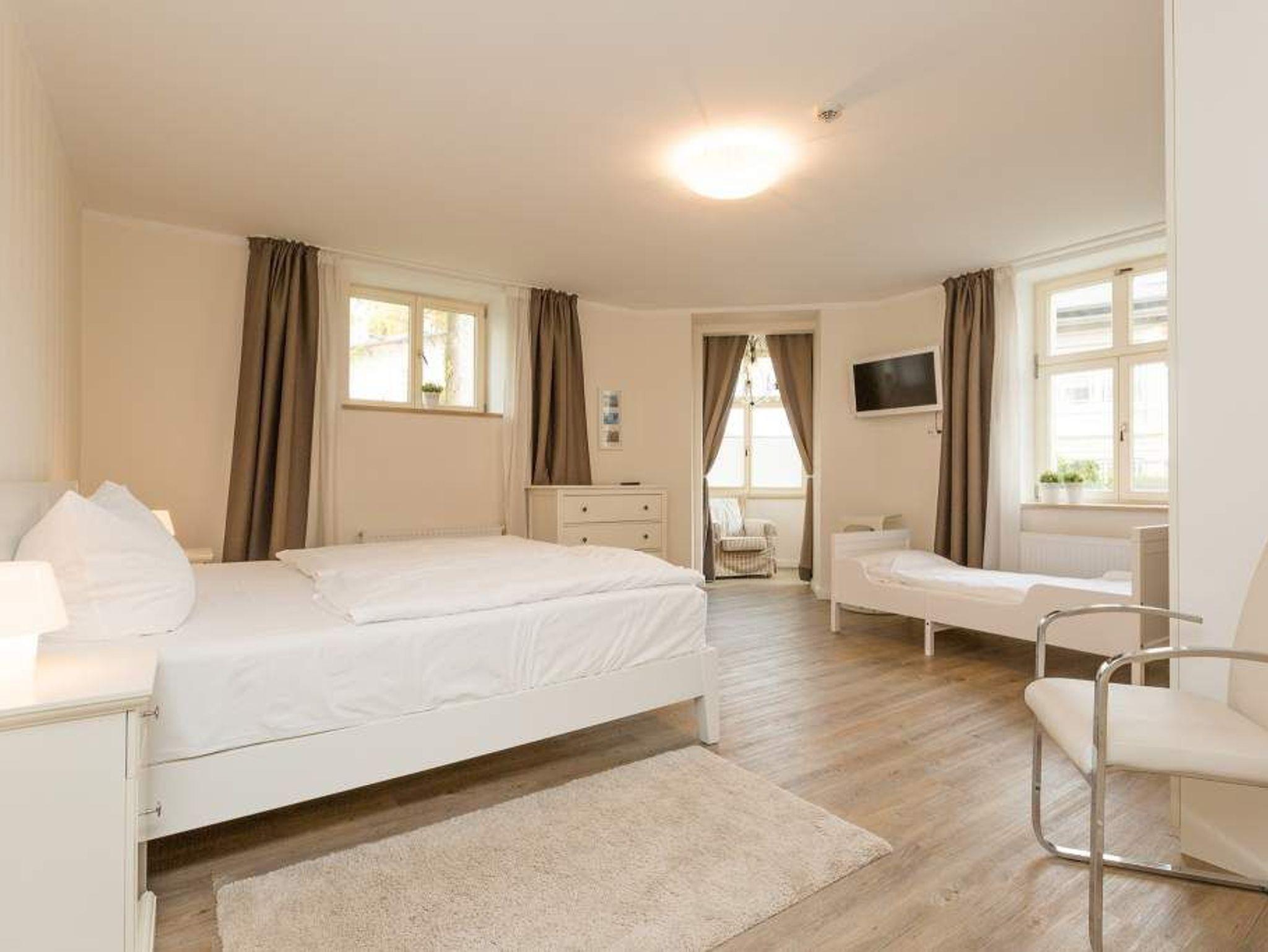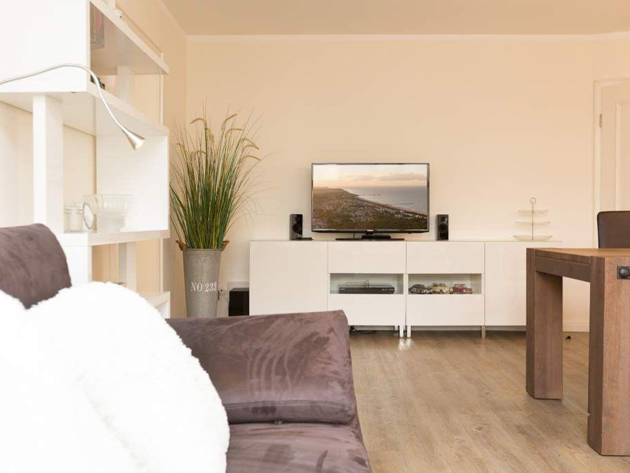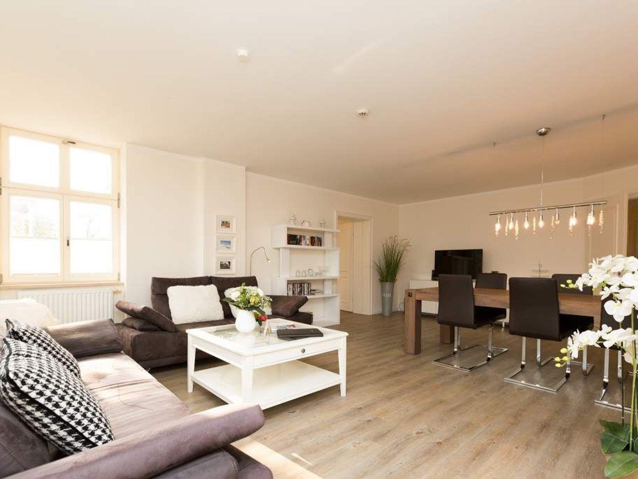 Diese großzügige 3-Raum-Ferienwohnung im Erdgeschoss bietet mit rund 100 Quadratmetern viel Platz für entspannte Urlaubstage. Ideal geeignet ist sie für zwei bis vier Erwachsene sowie ein Kind bis zwölf Jahre (keine Kleinkinder). Der helle Wohnraum bildet den Mittelpunkt der Wohnung. Eine komfortable Sitzgruppe lädt zum Verweilen ein, am großen Esstisch ist ausreichend Platz für gemeinsame Mahlzeiten oder einen Spieleabend. Die separate Küche ist praktisch geschnitten und ermöglicht ungestörtes Kochen. Zwei Schlafzimmer sorgen für erholsamen Schlaf. In einem Zimmer stehen ein Doppelbett, ein zusätzliches Jugendbett sowie ein Fernseher zur Verfügung. Das zweite Schlafzimmer ist ebenfalls mit einem Doppelbett ausgestattet, das auf Wunsch getrennt gestellt werden kann, auch hier gehört ein TV zur Ausstattung. Das moderne Bad überzeugt mit einer großzügigen Regenwalddusche und WC. Auf der Terrasse können Sie den Tag an der frischen Luft beginnen oder entspannt ausklingen lassen. Gartenmöbel stehen bereit. Ein PKW-Stellplatz befindet sich direkt am Haus. Für einen angenehmen Start in den Urlaub sind die Betten bei Ihrer Anreise bereits bezogen, Handtücher liegen als Erstausstattung für Sie bereit. WLAN nutzen Sie kostenfrei. Eine Wohnung, die Komfort, Platz und Ruhe auf angenehme Weise verbindet.