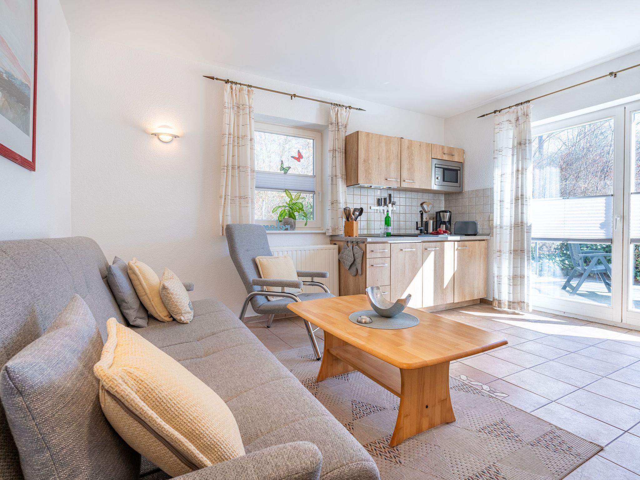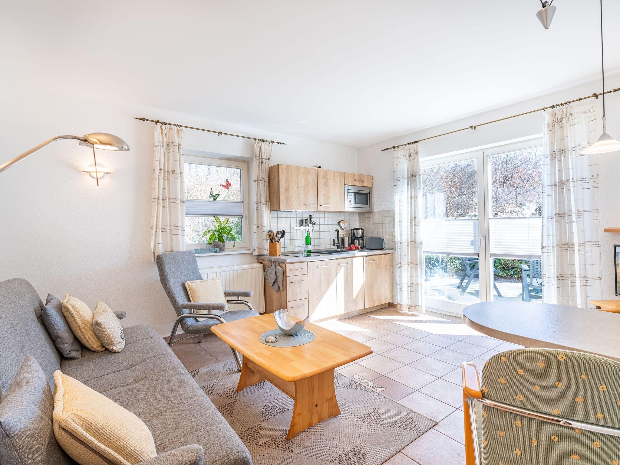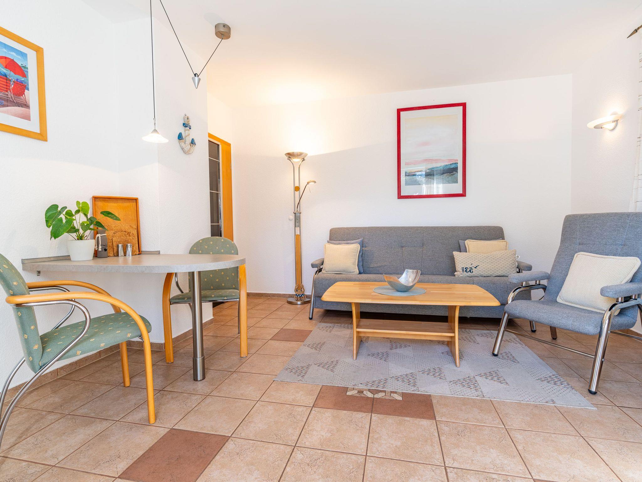 Das Zwei-Zimmer-Appartement befindet sich ebenerdig und bietet mit seinen 40 Quadratmetern ausreichend Platz für einen erholsamen Urlaub zu zweit oder auch zu dritt. Der Wohnbereich verfügt über eine integrierte moderne Küchenzeile (inkl. Geschirrspüler, Induktionskochfeld, Mikrowelle m. Grillfunktion, Kühlschrank mit Gefrierfach, Wasserkocher, Toaster, Kaffeemaschine und Eierkocher) mit Esstisch für drei Personen sowie über ein gemütliches Sofa, auf dem Sie nach einem erholsamen Urlaubstag die Seele baumeln lassen können. Ein moderner Flat TV macht es möglich, dass Sie auch im Urlaub auf keine Ihrer Lieblingsserien verzichten müssen.