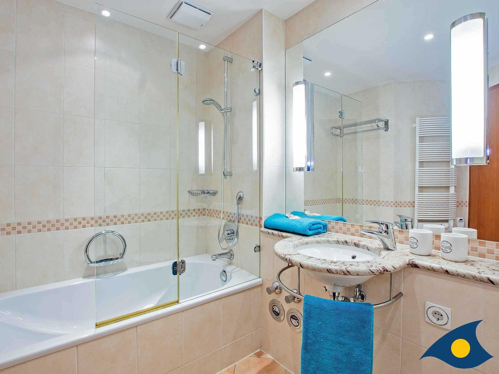 Auch im Korridor finden Sie ausreichend Ablageflächen für Ihre Garderobe, Schuhe und Strandsachen. In dem geschmackvoll gestalteten Badezimmer finden Sie eine Badewanne mit einer integrierten Dusche.