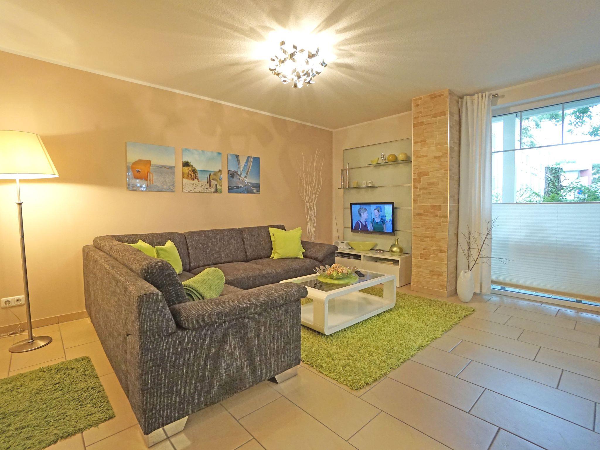 Die helle, harmonische und modern eingerichtete Ferienwohnung liegt im Erdgeschoss/Hochpaterre des Hauses. Ein großzügiges Wohnzimmer mit integrierter gut ausgestatteter Küchenzeile (4-Platten-Cerankochfeld, Mikrowelle, Spülmaschine, Kühlschrank mit Gefrierfach, Kaffeemaschine etc.), Essplatz mit 4 Stühlen, ein großes Ecksofa mit Schlaffunktion (für 2 Personen), LCD-SAT-TV, DVD-Player, Stereo, kostenfreies W-Lan. Vom Wohnzimmer gelangen Sie auf die beiden großen Balkone zur Nord/Ostseite (Morgensonne) und zur Süd/Westseite.