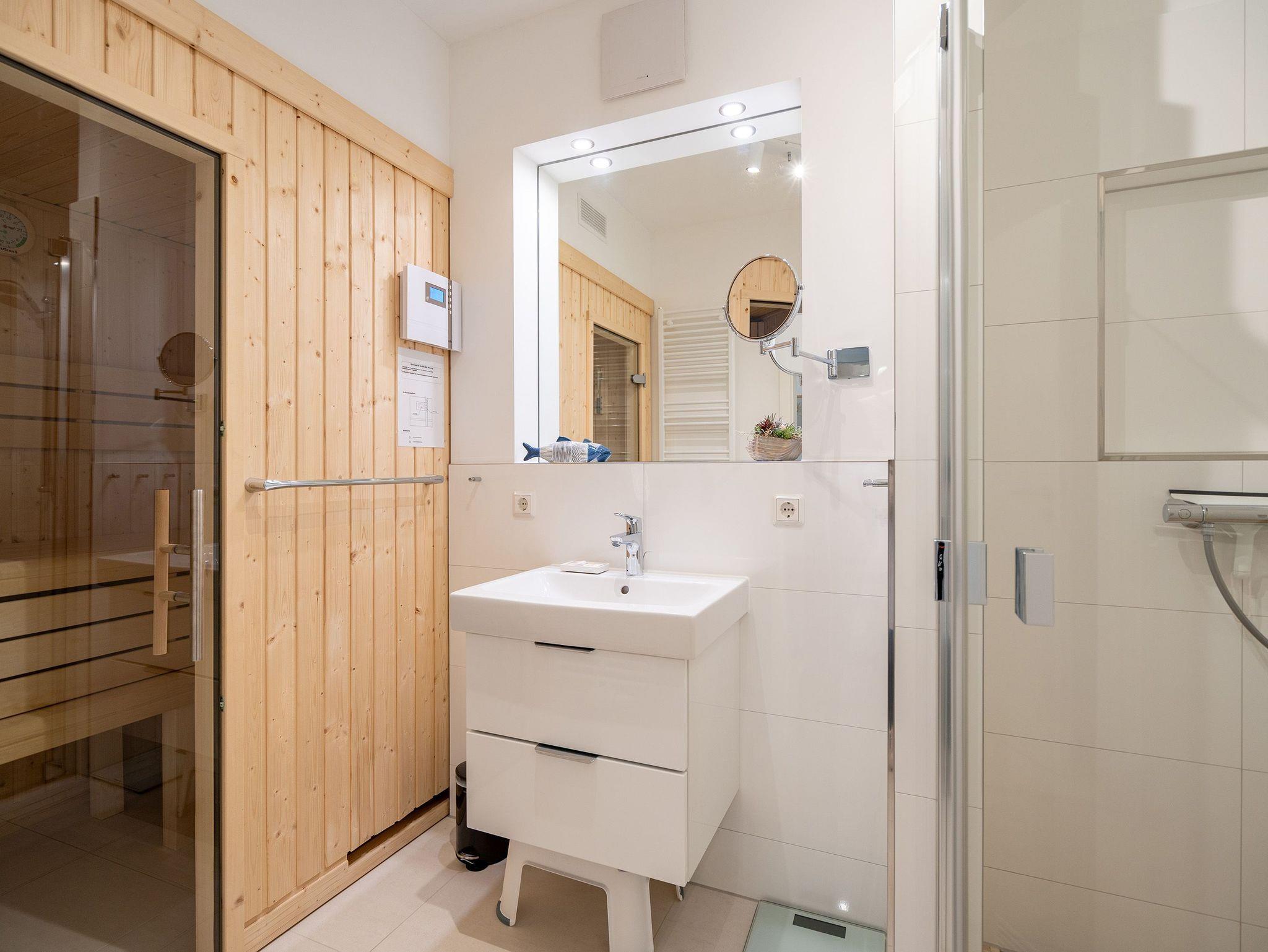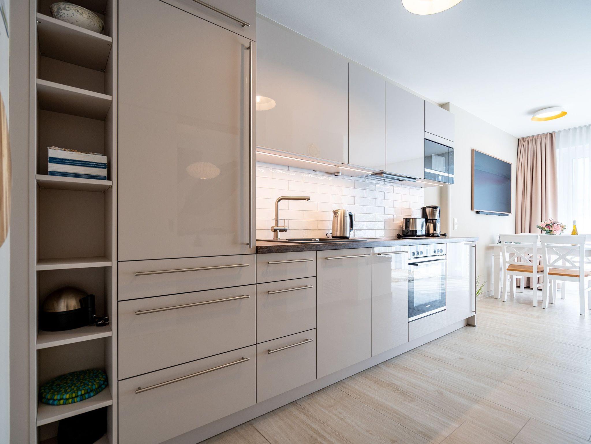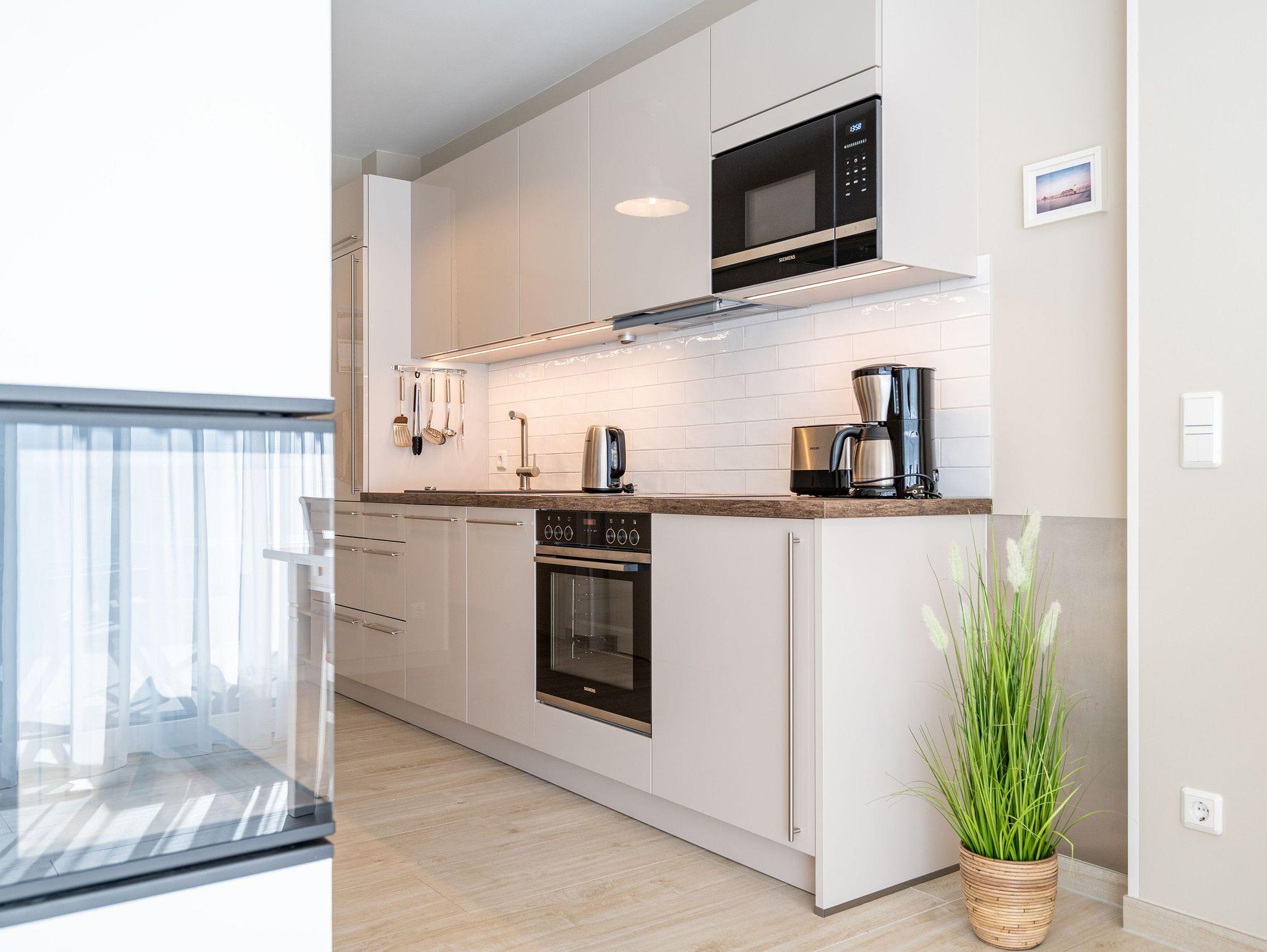 Sie reisen zu zweit oder als kleine Familie ans Meer? Dann verbringen Sie Ihren Urlaub im neuen Quartier am Strand in Seebad Heringsdorf. Das im Juni 2023 fertiggestellte 51 Quadratmeter große 2-Raum-Appartement bietet alles, was Sie für einen erholsamen Urlaub für zwei Erwachsene und ein Kind (bis 15 Jahre) benötigen. Ideal gelegen zwischen Ostsee (100m entfernt) und Ortskern (1.000m) können Sie tagsüber zwischen Sonnenbad und Stadtbummel entscheiden. Auf der 15 Quadratmeter großen Südwest-Terrasse lässt es sich tagsüber auf der Sonnenliege oder am Tisch mit drei Stühlen aushalten. Am Abend warten im Wohnbereich eine Sitzgruppe, die auch als Aufbettungsmöglichkeit für eine dritte Person dient, sowie ein 65-Zoll Flat-TV und ein Kamin darauf, es Ihnen gemütlich zu machen. Der offene Koch-und Essbereich ist umfangreich ausgestattet (Backofen, Induktionskochfeld, Mikrowelle, Spülmaschine, Kühlschrank mit Gefrierfach und Kleinküchengeräte) und bietet jeglichen Komfort beim Zubereiten Ihrer Speisen. Gemeinsame Mahlzeiten lassen sich am Esstisch für vier Personen einnehmen. Verzichten Sie auch im Urlaub nicht auf Ihren erholsamen Schlaf und machen Sie es sich im bequemen Boxspringbett (1,80m x 2,00m) gemütlich. Ein Flat-TV und Stauraum für Ihre Urlaubsgarderobe runden den innenliegenden Schlafbereich ab. Das Highlight bildet die Finnische Sauna, die in das Duschbad mit Waschtisch und WC integriert ist und auch an kühleren Tagen für wohlige Wärme sorgt. Für Ihren PKW steht ein Stellplatz in der hauseigenen Tiefgarage bereit. Bei Ihrer Anreise sind außerdem die Betten bereits bezogen und Handtücher liegen für Sie parat. Kostenfreies W-Lan sowie ein wohnungseigener Abstellraum direkt hinter Ihrem PKW-Stellplatz erleichtern das Abstellen Ihrer Fahrräder. Für den Tag am Strand steht Ihnen in der Zeit von Mitte Mai bis September (je nach Witterung) ein Strandkorb zur Verfügung.