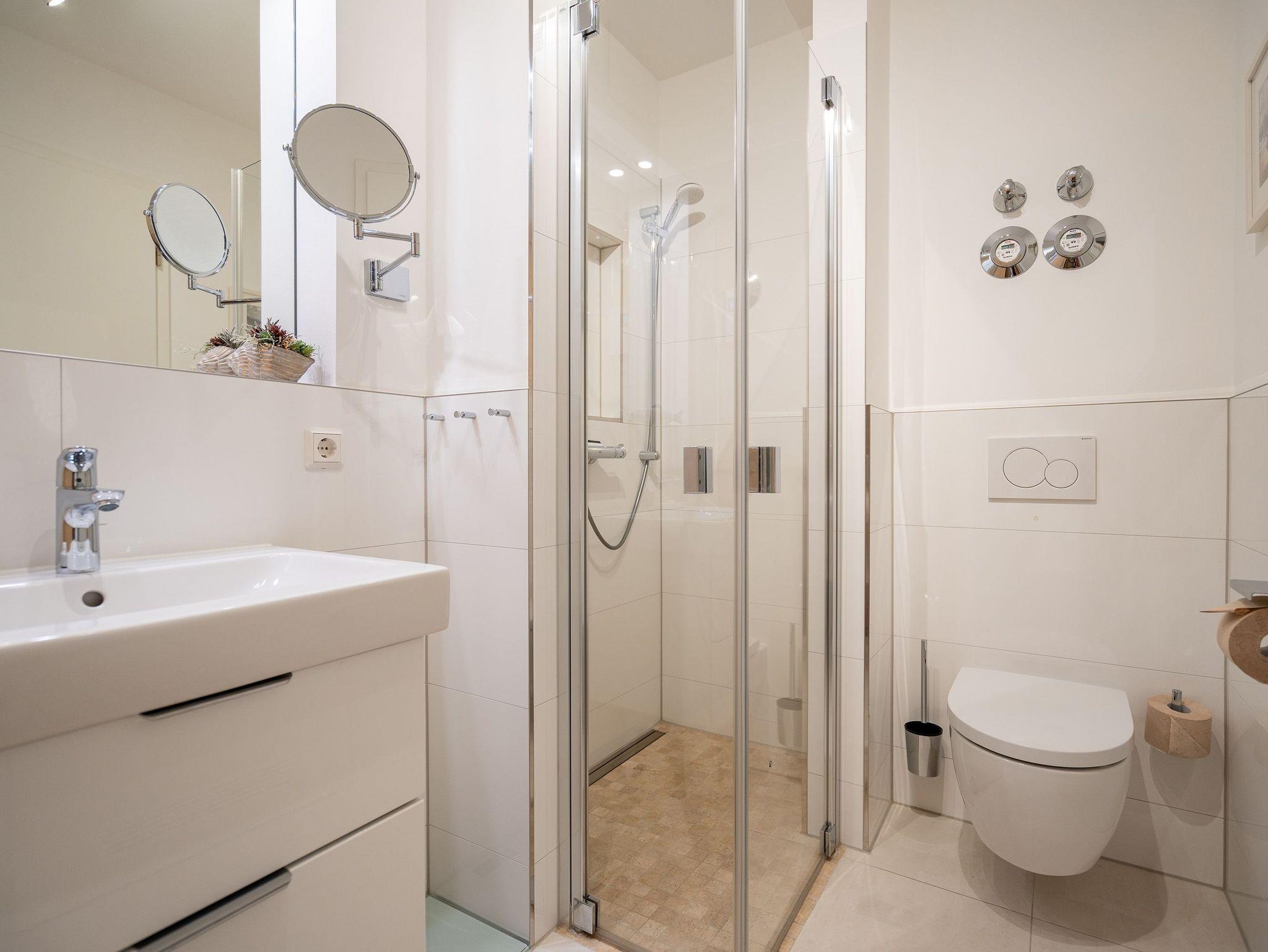 Nur 50m vom Strand entfernt und in einer kleinen Nebenstraße gelegen, empfängt Sie unser neues Domizil Quartier am Strand. Als zweites Objekt am Platz direkt an der schönen Strandpromenade gelegen, fügt sich die Anlage stilvoll zwischen Bäderstilvillen und Strandumgebung ein. Die insgesamt 9 Appartements und 2 Penthouses verfügen über helle und modern eingerichtete 2 bis 3 Zimmer. An kühleren Tagen sorgen Saunen und Kamin, die zu jedem Appartement gehören, für Entspannung in Ihrem Urlaub. Dem Klang der Wellen können Sie bequem von den Terrassen, Balkonen und Dachterrassen aus zuhören, denn jedes Appartement besitzt einen separaten Außenbereich. Der Blick auf die Ostsee ist Ihnen aus einigen Appartements möglich, aus den Penthouses garantiert. Offene Wohnbereiche und voll ausgestattete Küchen komplettieren das neue Objekt Quartier am Strand. Zudem gibt es eine hauseigene Tiefgarage (Einfahrthöhe 2,05 m) sowie einen Außenstellplatz (für Appartement 3), so dass ein eigener PKW-Stellplatz garantiert ist. Zu den weiteren Annehmlichkeiten des Objektes zählt ein Fahrstuhl, der Sie von der Tiefgarage bequem bis in die Etage Ihres Urlaubsdomizils leitet. Kostenfreies W-Lan rundet das Domizil ab. Wir wünschen Ihnen einen schönen Urlaub!