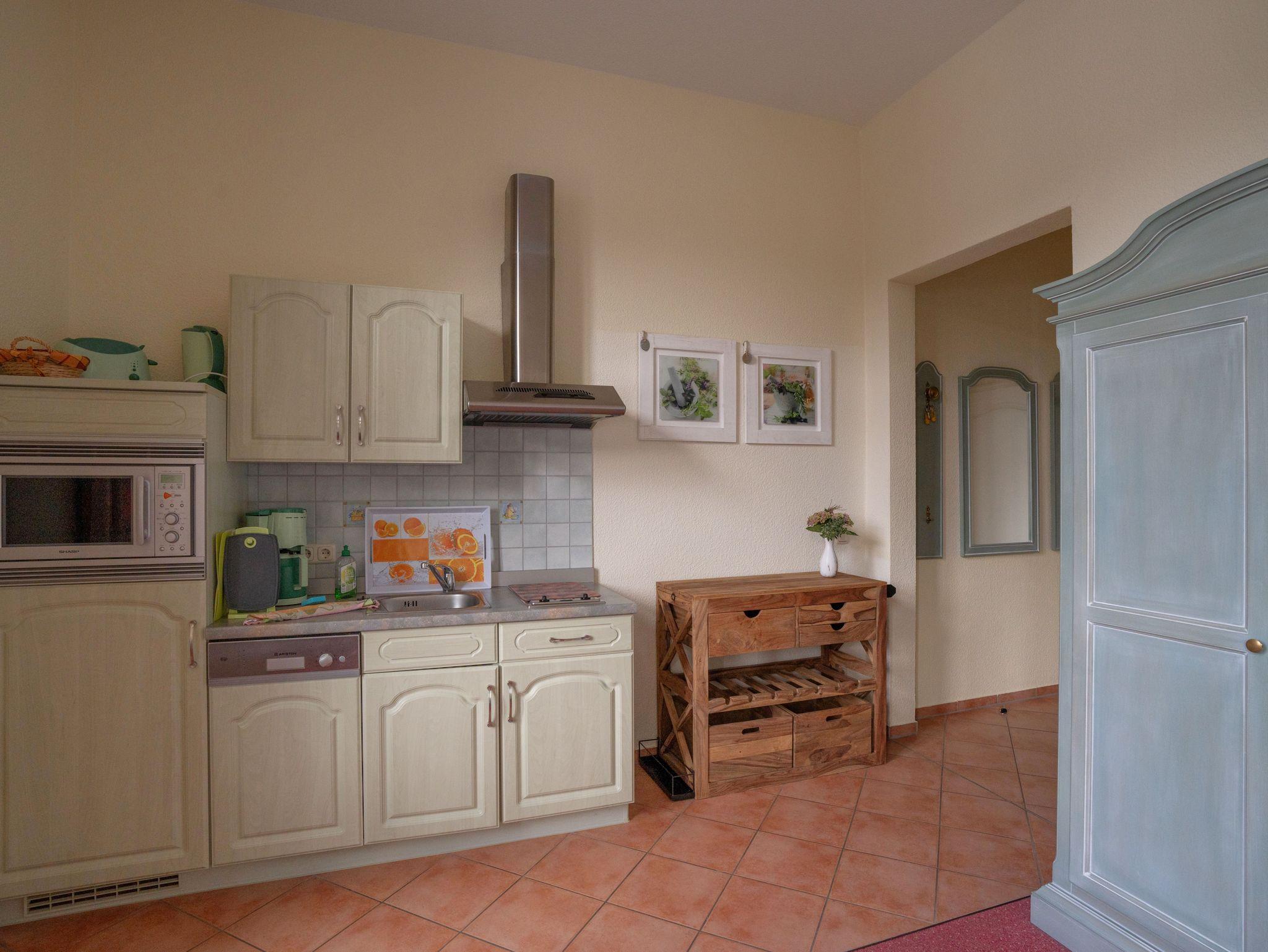 Ceranfeld und Mikrowelle. Bad mit Dusche und WC.