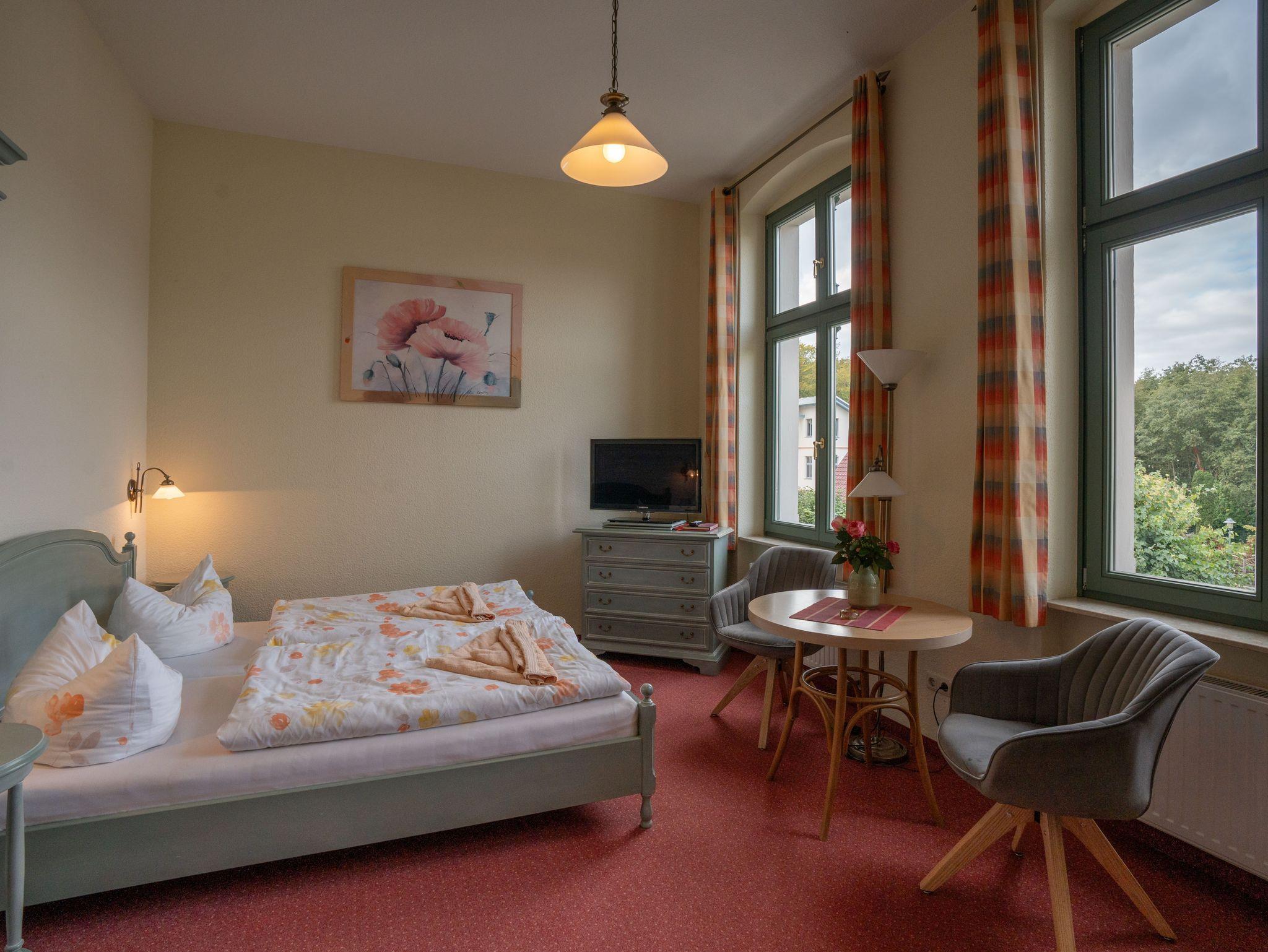 Das 28 qm große Einraumappartement im Obergeschoss verfügt über ein Doppelbett, Sitzgelegenheit, TV und Radio sowie eine Küchenzeile mit Geschirrspüler,