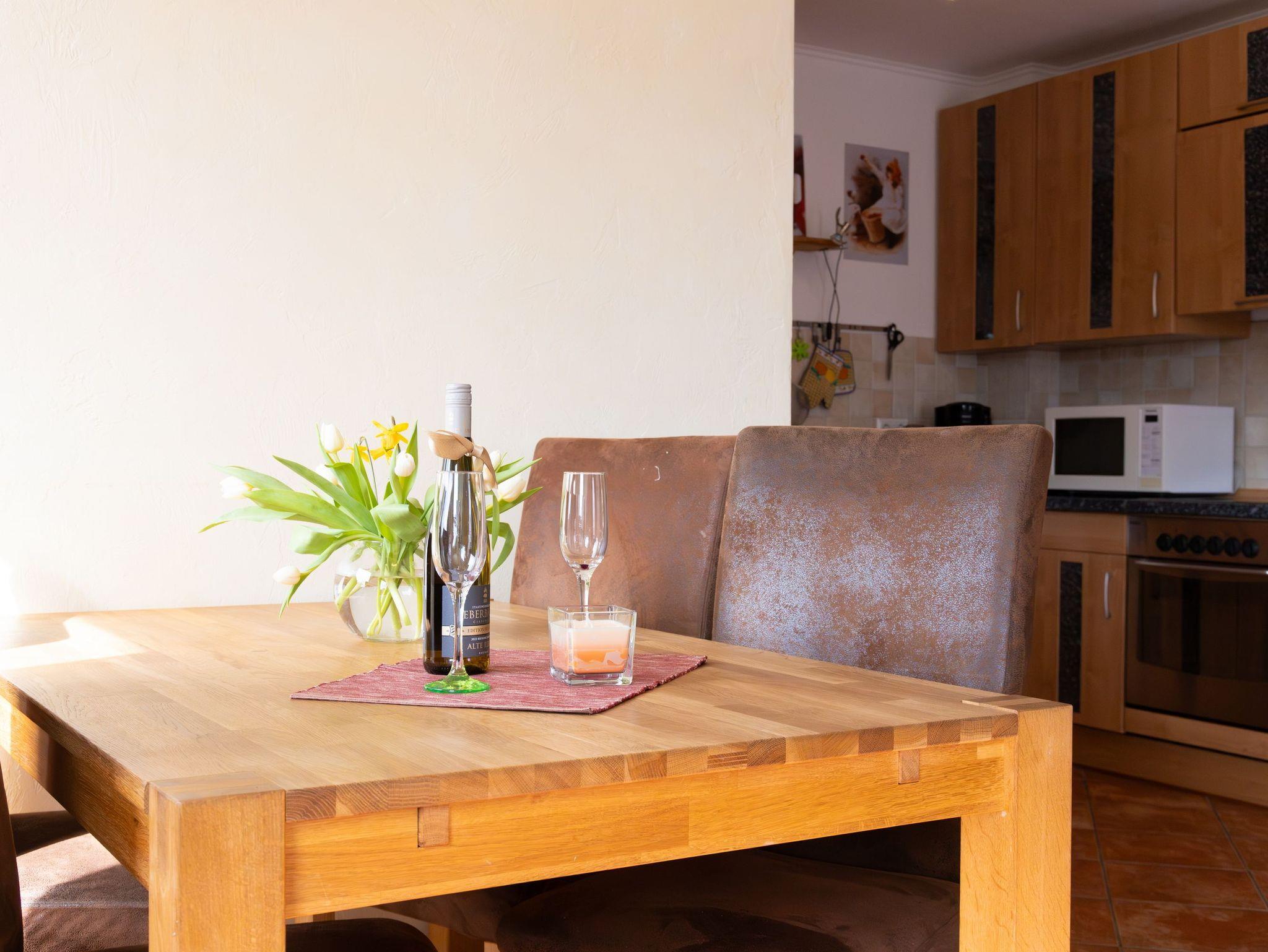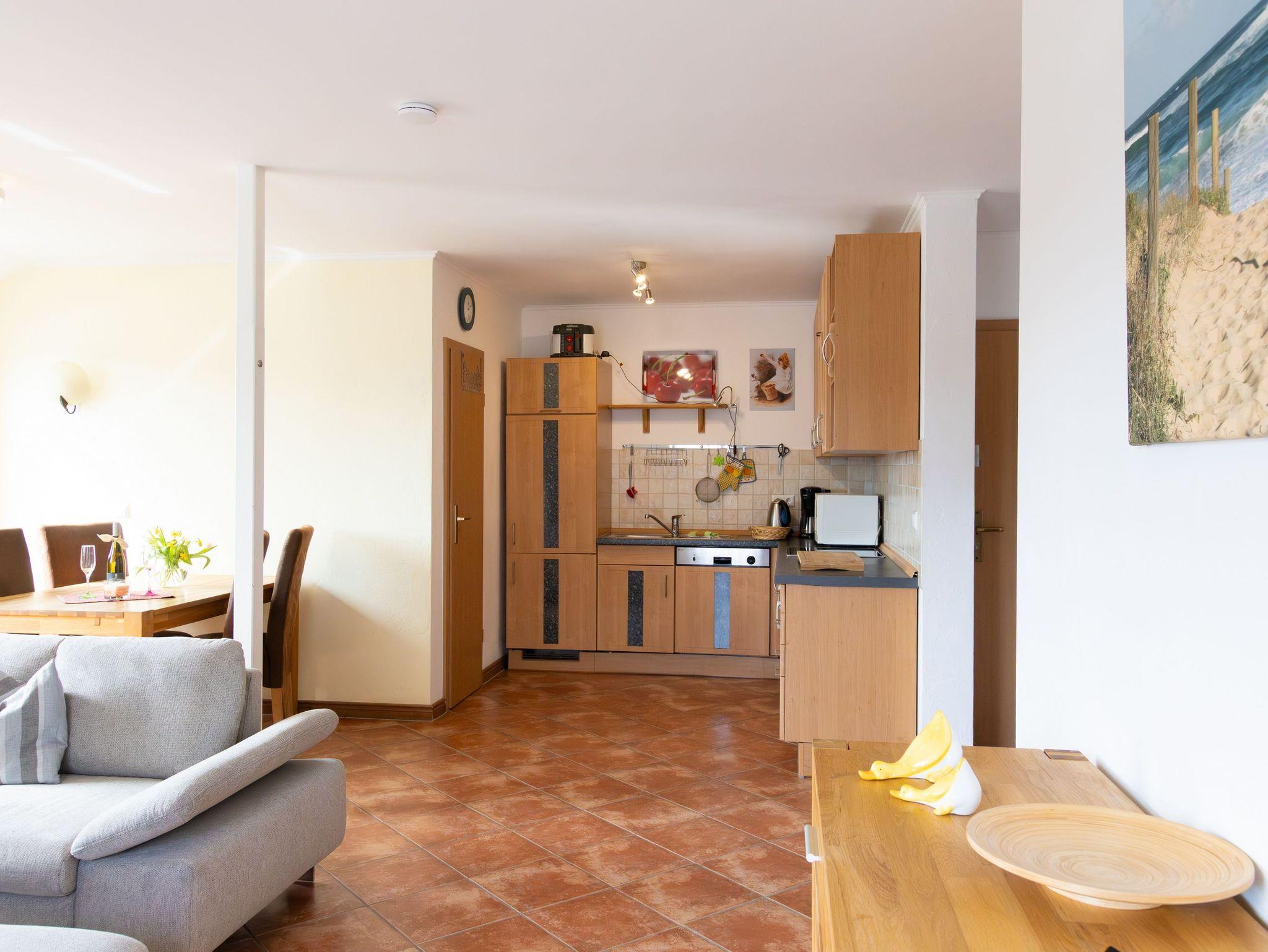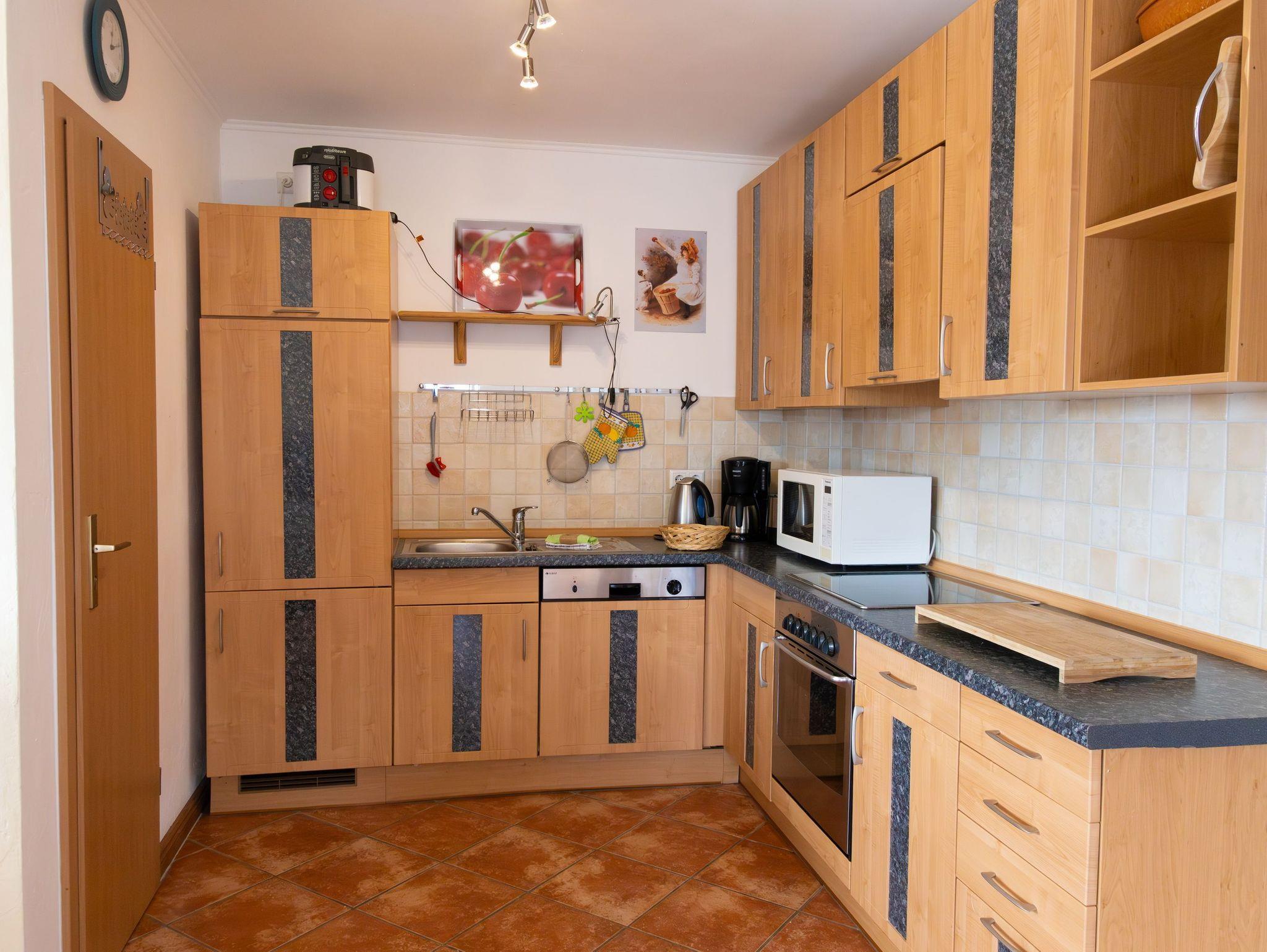 Im unteren Bereich der Wohnung bietet eine vollausgestatte Küchenzeile mit Backofen, Kühlschrank mit Gefrierfach, Geschirrspüler, Mikrowelle, Wasserkocher, Toaster, Kaffeemaschine jeglichen Komfort. Der Essplatz lädt zum Beisammensein zu den Mahlzeiten mit bis zu vier Personen ein.
