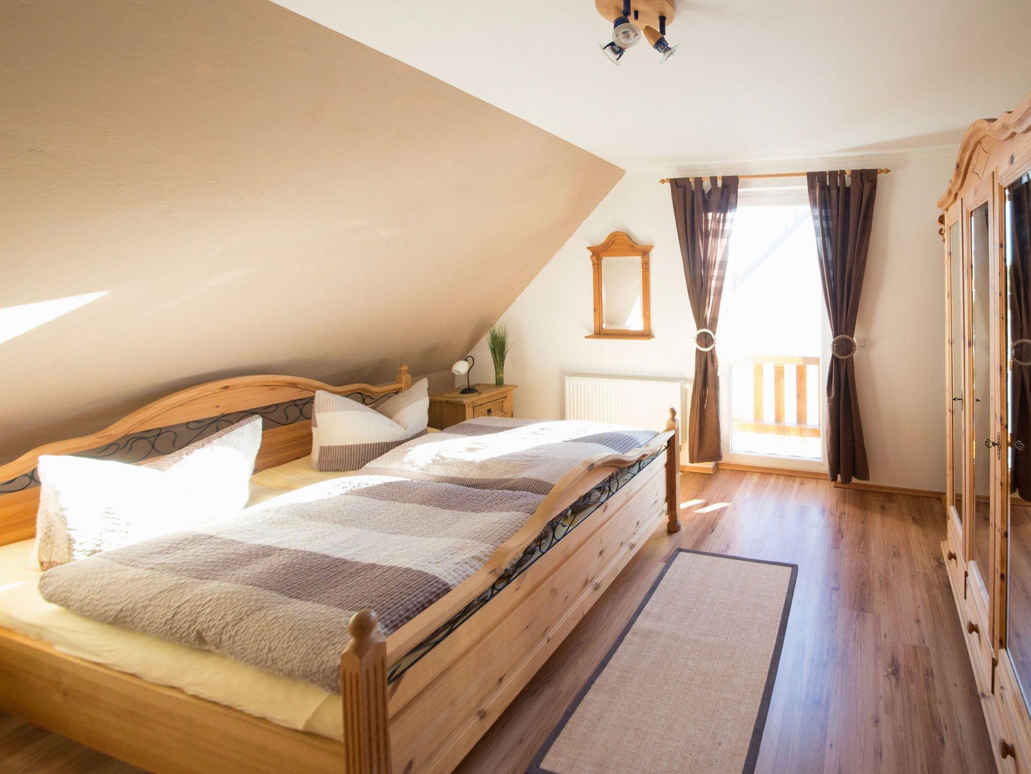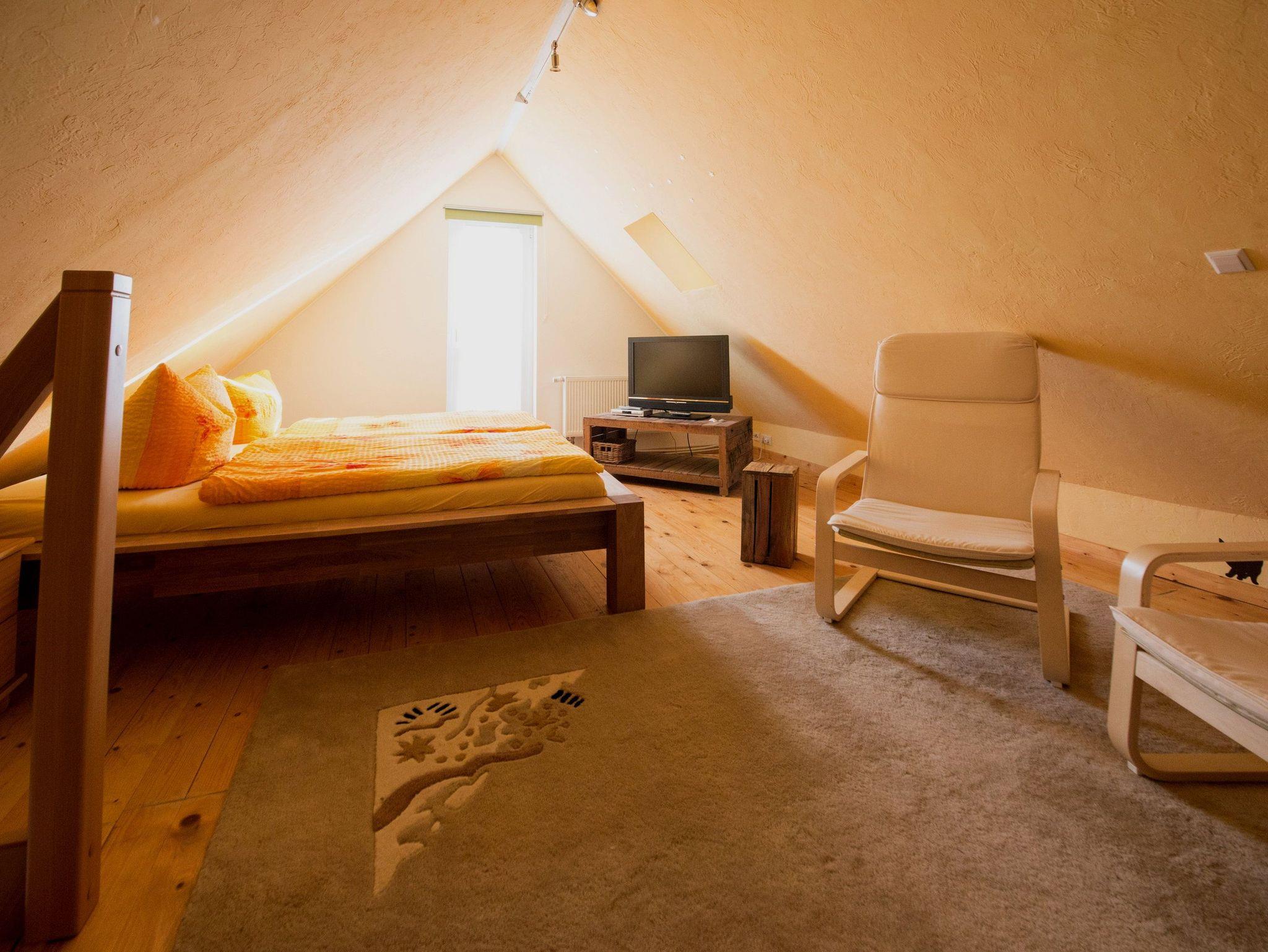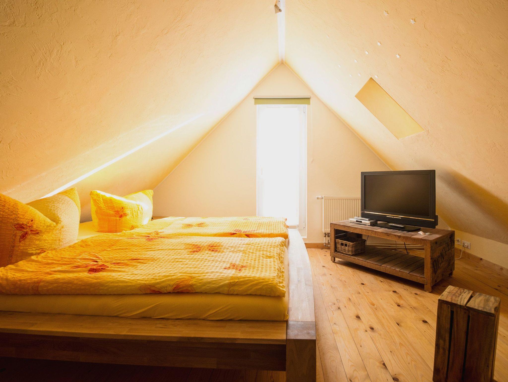 Der Wohnbereich mit gemütlicher Sitzecke, Flachbildfernseher und DVD-Player laden zum Entspannen und Ausklingen des Urlaubstages ein. Der angrenzende Südostbalkon rundet den Urlaubskomfort dieses Appartements ab. Zur Nachtruhe oder auch für ein Mittagsschläfchen zwischendurch lassen Sie sich einfach in das bequeme Doppelbett (180 x 200cm / zwei getrennte Matratzen) im Schlafzimmer fallen. Über die freie Treppe erreichen Sie das zweite Schlafzimmer mit Doppelbett (180 x 200cm / zwei getrennte Matratzen) und FlatTV, welches sich im Dachgeschoss des Hauses befindet (zwischen den beiden Schlafräumen befindet sich keine Tür).