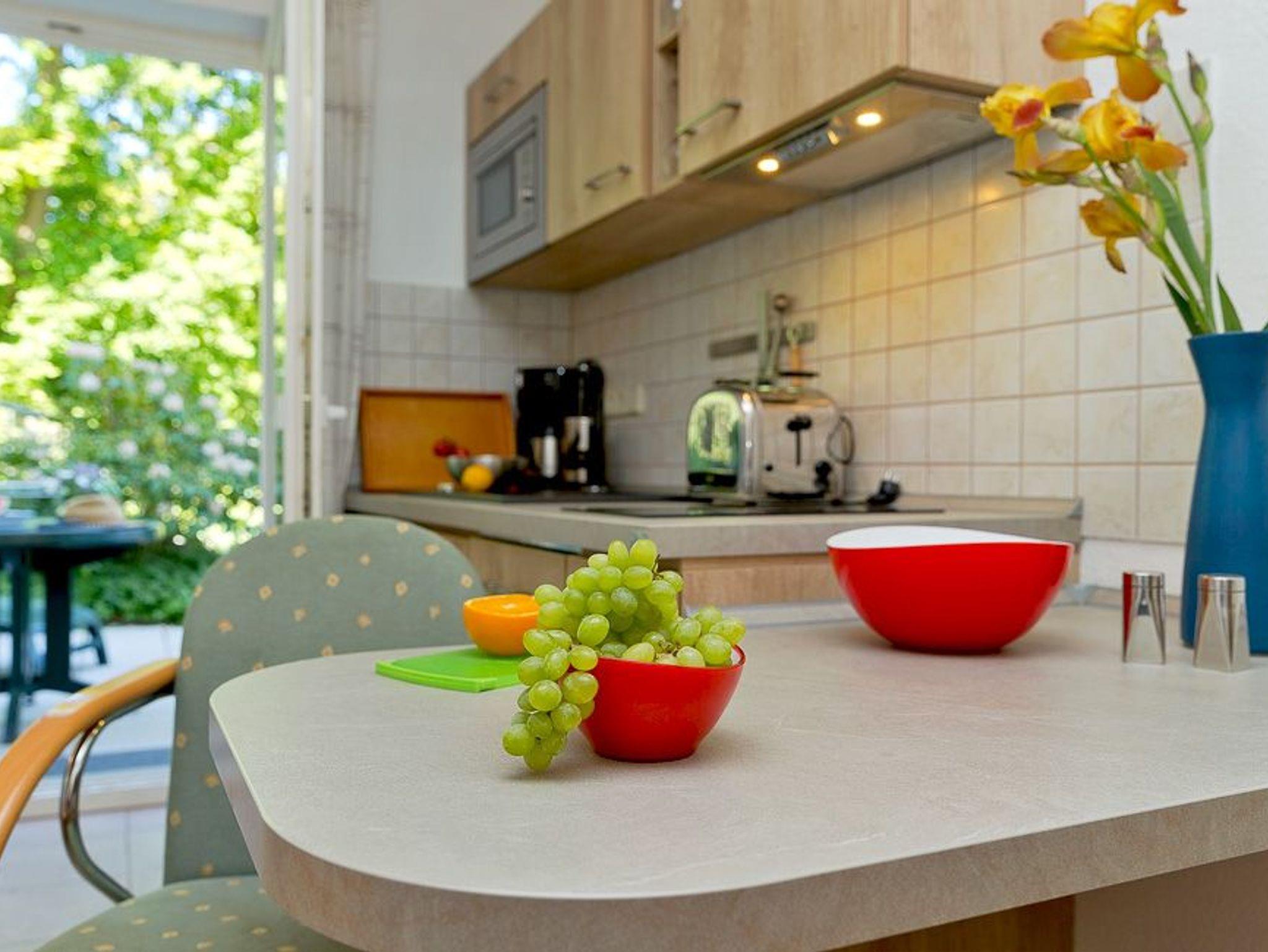 Das Zwei-Zimmer-Appartement befindet sich ebenerdig und bietet mit seinen 35 Quadratmetern ausreichend Platz für einen erholsamen Urlaub zu zweit. Der Wohnbereich verfügt über eine moderne Küchenzeile (inkl. Geschirrspüler, Induktionskochfeld, Mikrowelle m. Grillfunktion, Kühlschrank mit Gefrierfach, Wasserkocher, Toaster, Kaffeemaschine und Eierkocher) sowie einem Esstisch für zwei Personen. Die Couch im Wohnzimmer bietet erstklassigen Sitzkomfort - der Flachbildfernseher sorgt für die unterhalsame Untermalung Ihres Aufenthaltes.