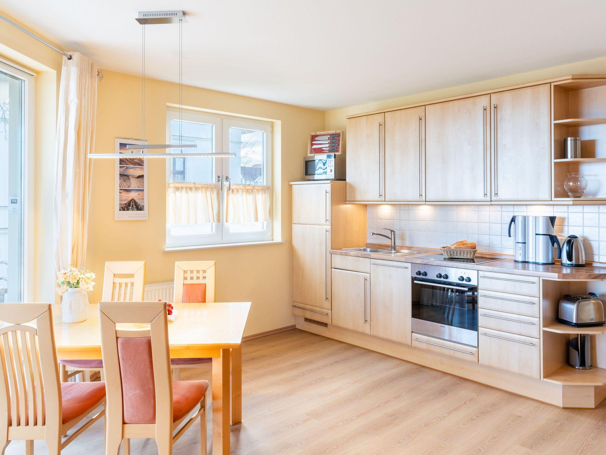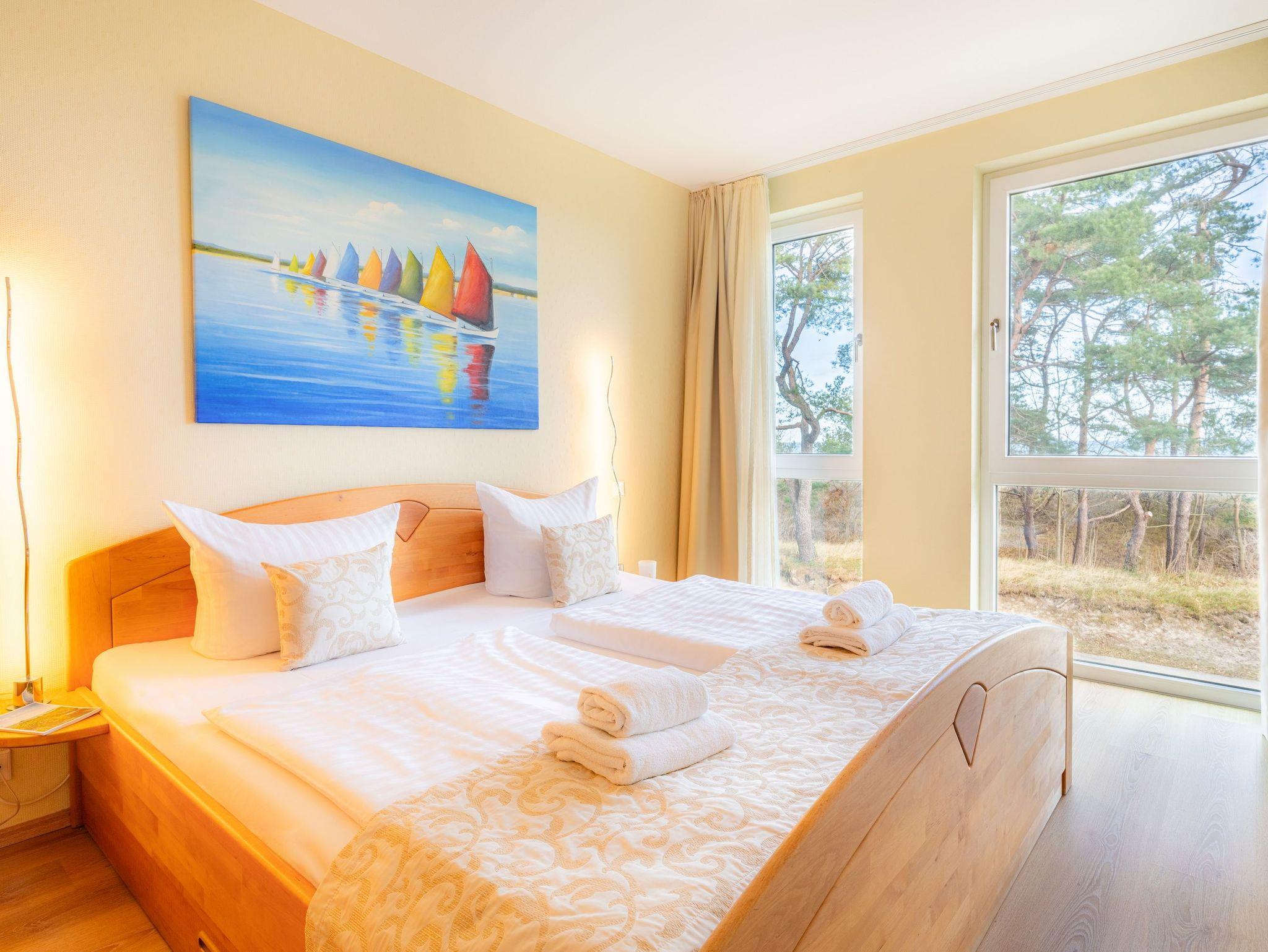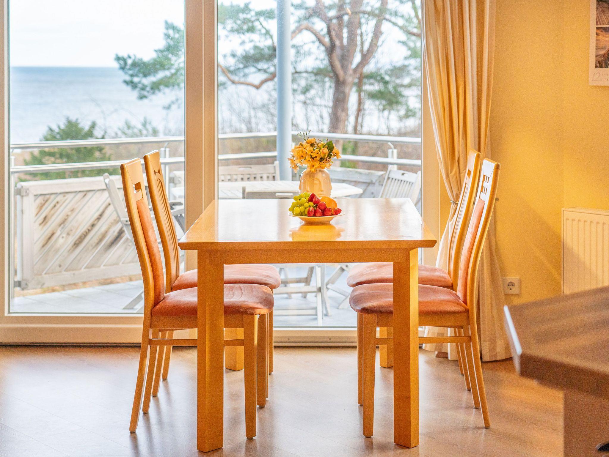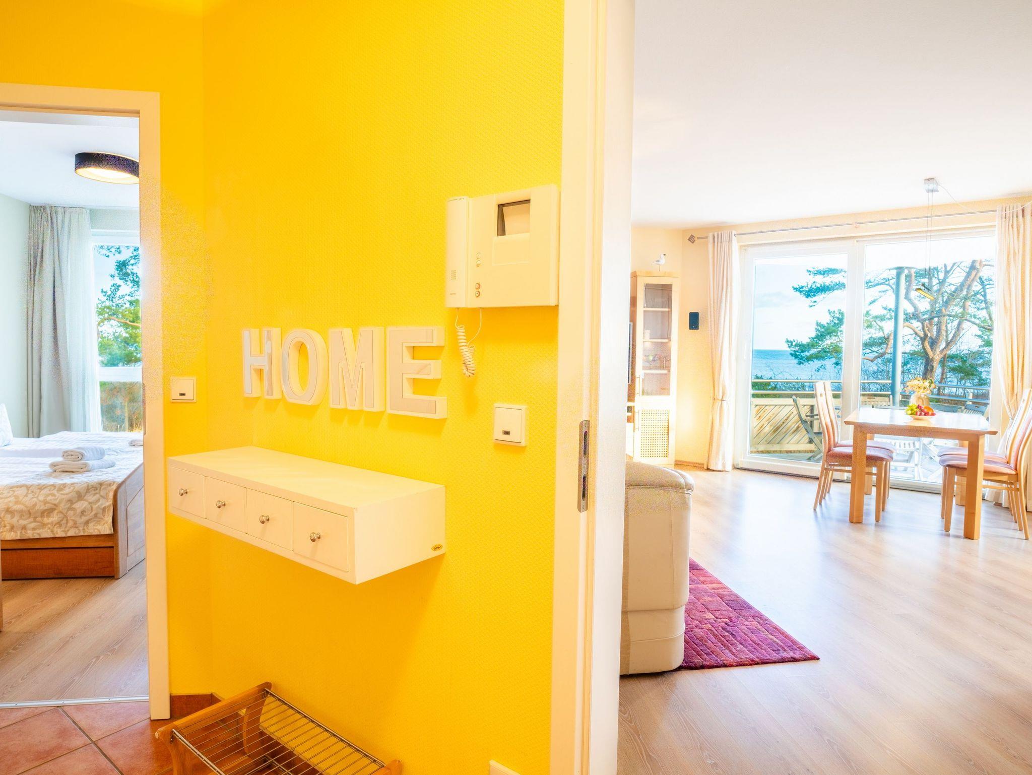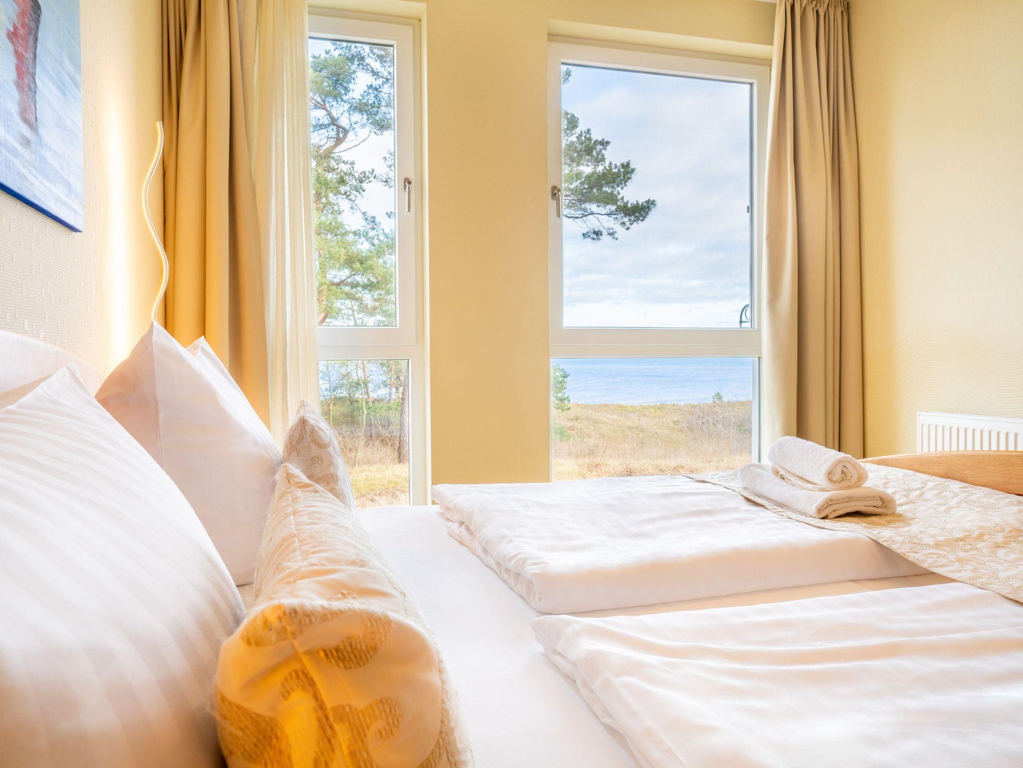 Auf 67 Quadratmetern erstreckt sich die Wohnfläche und lädt Dank dieser Großzügigkeit bis zu vier Personen zu einem erholsamen Urlaub in idealer Strandlage ein. Modern und gemütlich zugleich - auf Ihrem Balkon können Sie bereits beim morgendlichen Kaffee den Wellen der Ostsee lauschen. Der stilvolle Wohnbereich verfügt über ein komfortables, großzügiges Sofa und Flat-TV. Die einladende Küchenzeile rundum mit allem ausgestattet, was für Ihre Lieblingsspeisen nötig ist (inkl. Ceranfeld, Backofen, Mikrowelle, Kühlschrank, Gefrierschrank, Geschirrspüler, Wasserkocher, Toaster und Kaffeemaschine). An dem großzügigem Essplatz kann die ganze Familie in geselliger Runde die zubereiteten Speisen genießen. Vom Wohnzimmer aus erreichen Sie Ihren Balkon mit Meerblick, der zum Sonnenbaden oder zur abendlichen Spielrunde einlädt. Das Schlafzimmer ist mit einem bequemen Doppelbett (200x200cm) ausgestattet. Für zwei weitere Urlaubsgäste kann die Schlafcouch im Wohnbereich für eine erholsame Nachtruhe und einen guten Start in den neuen Urlaubstag ausgezogen und als komfortable Schlafstätte genutzt werden. Damit Sie Ihre wohlverdiente Urlaubszeit bereits am Anreisetag in vollen Zügen genießen können - haben wir das Bett für Sie und das für Ihre lieben Mitreisenden bereits bezogen und ein Duschtuch sowie ein kleines Handtuch bereitgelegt.