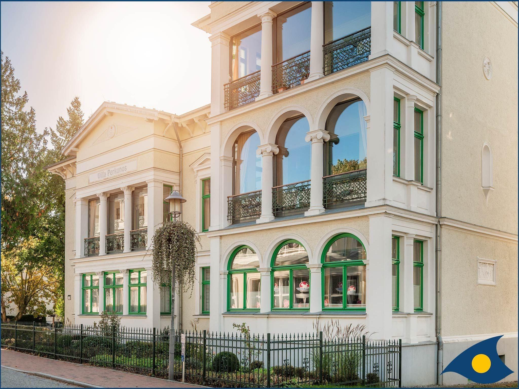 Die Villa Perkunos befindet sich im Seebad Heringsdorf in zentraler Ortslage. Die Villa präsentiert sich im Bäderstil der Gründerzeit und wurde hochwertig renoviert. Alle Geschäfte des täglichen Bedarfs, weitere Einkaufsmöglichkeiten im mondänen Seebad, Restaurants sowie die Seebrücke und der feine Ostseestrand sind in wenigen Gehminuten zu erreichen.
