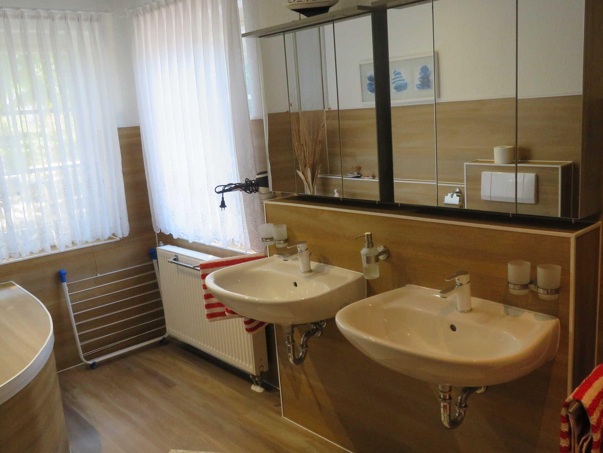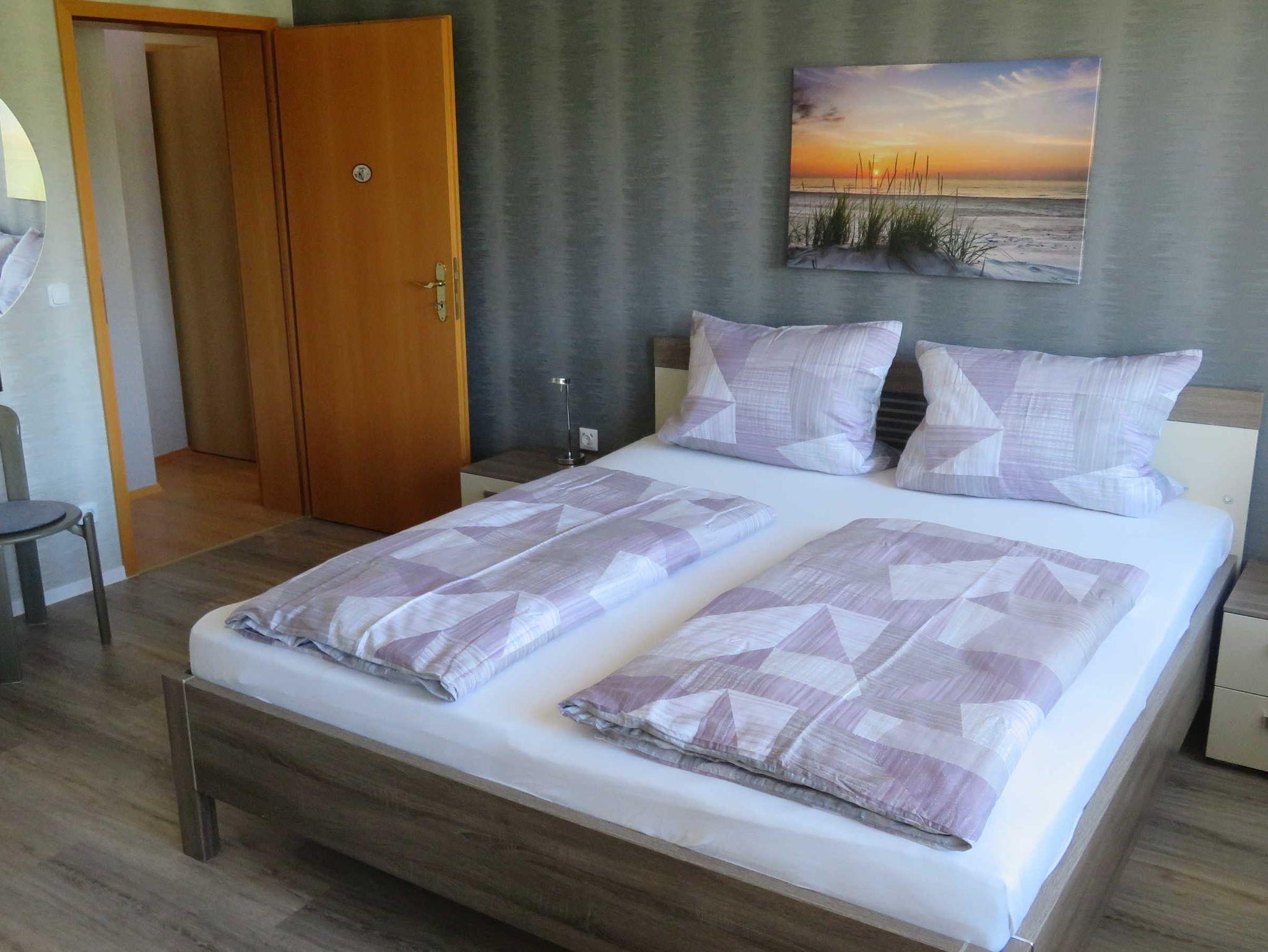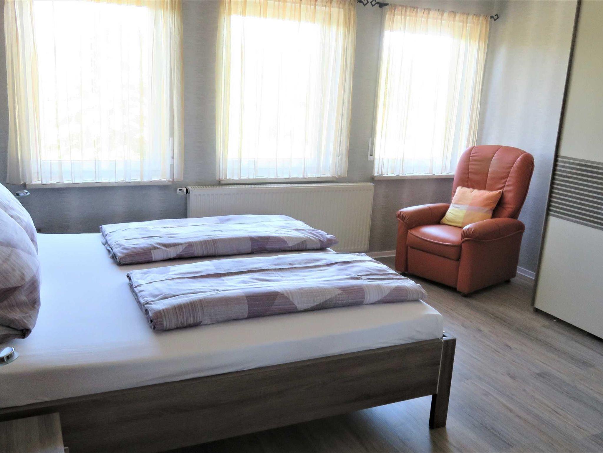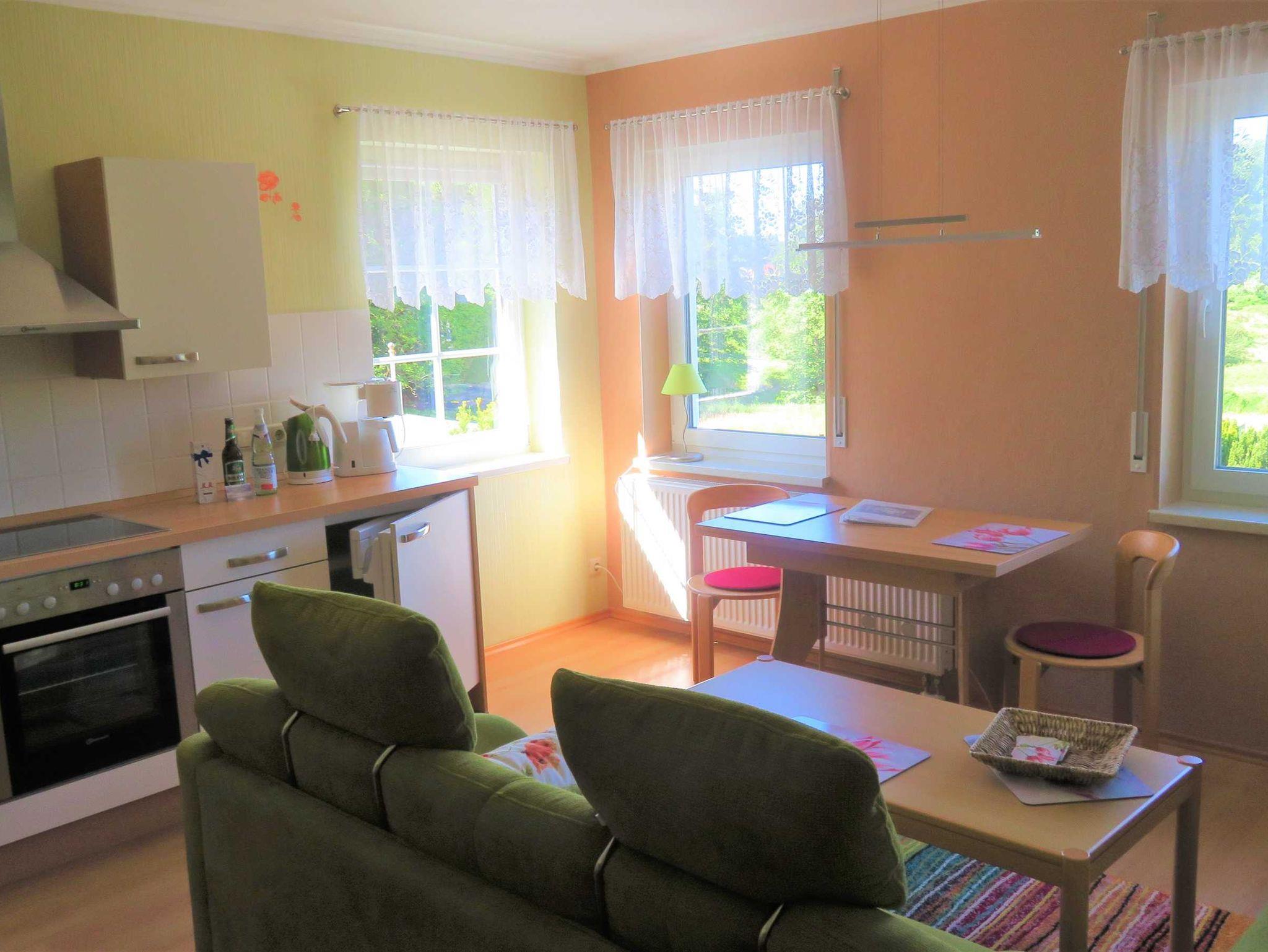 Die ca. 50qm große, modern eingerichtete Nichtraucherferienwohnung befindet sich in ruhiger Lage mit Gartenblick im 1. OG, in südlicher Ausrichtung. Der Wohnbereich mit offener Küche ist ausgestattet mit Essecke, Schlafsofa sowie einem FLAT-TV und Radio. In der offenen Küche finden Sie einen Backofen, ein Kochfeld, eine Spülmaschine, einen Kühlschrank mit Gefriermöglichkeit, sowie Wasserkocher, Toaster und Kaffeemaschine. Das Bad verfügt über eine Badewanne und eine Dusche, sowie ein WC und zwei Waschbecken. Einen Pkw-Stellplatz im Carport finden Sie auf dem abgeschlossenen Grundstück hinter dem Haus.