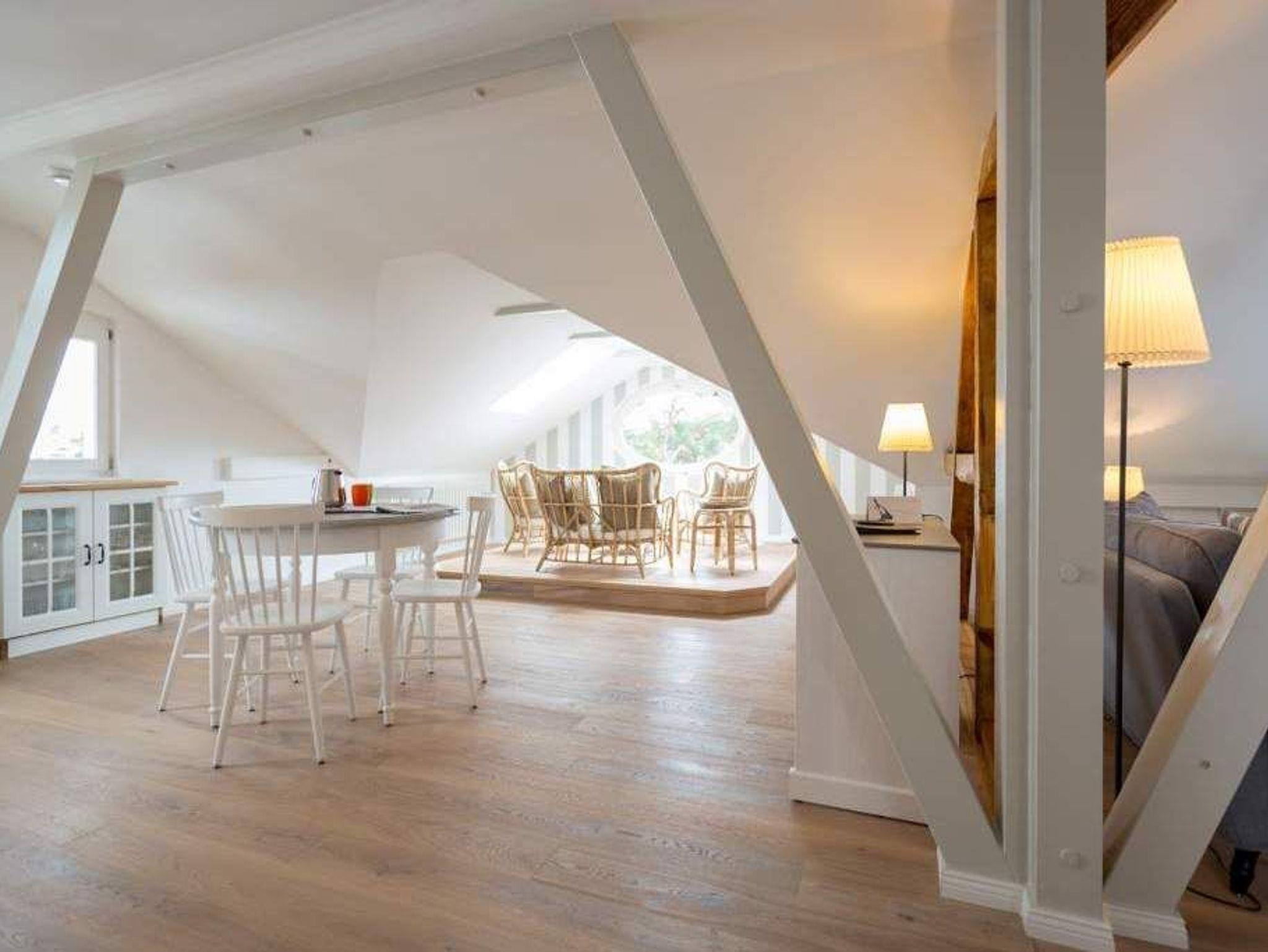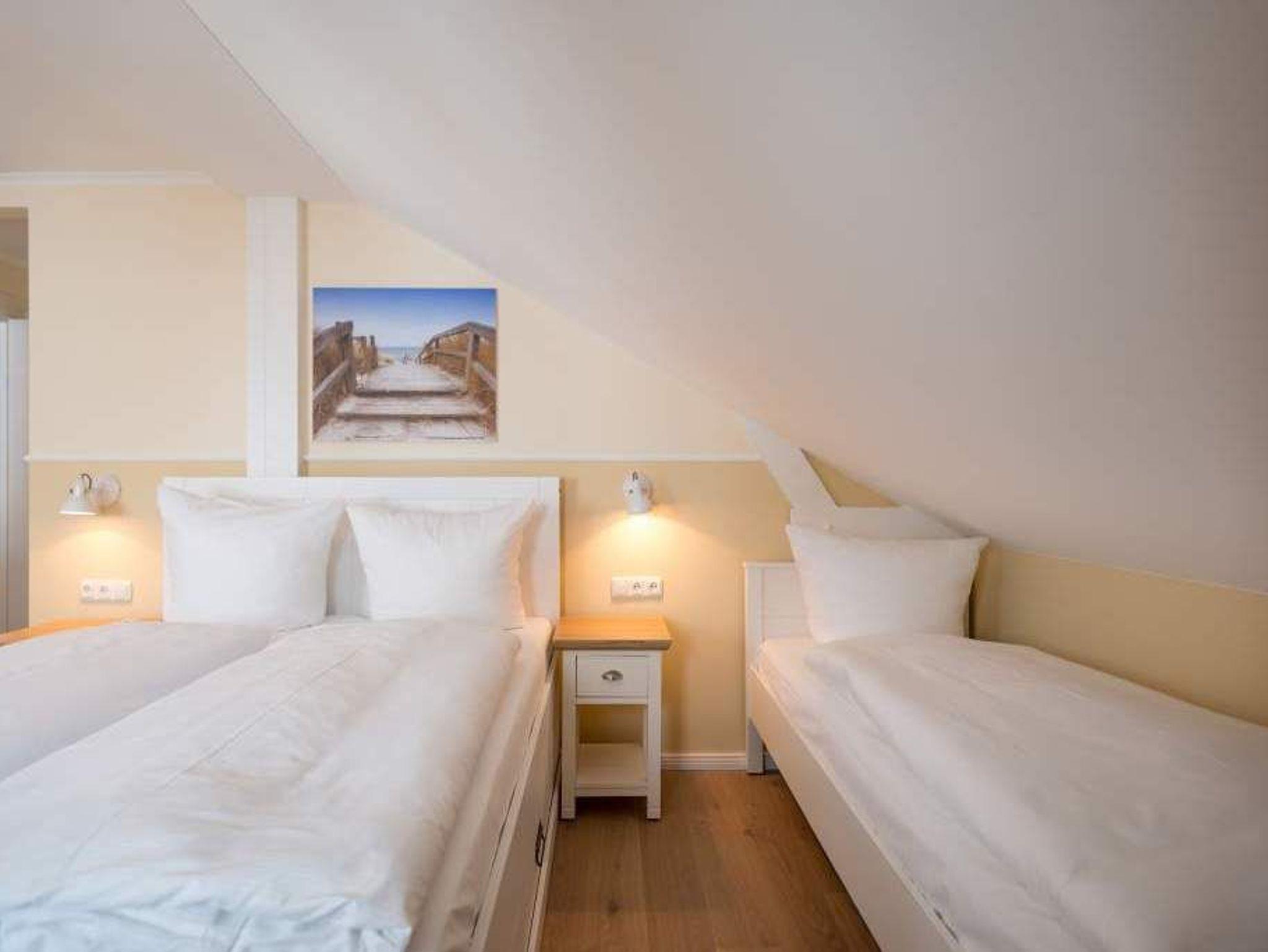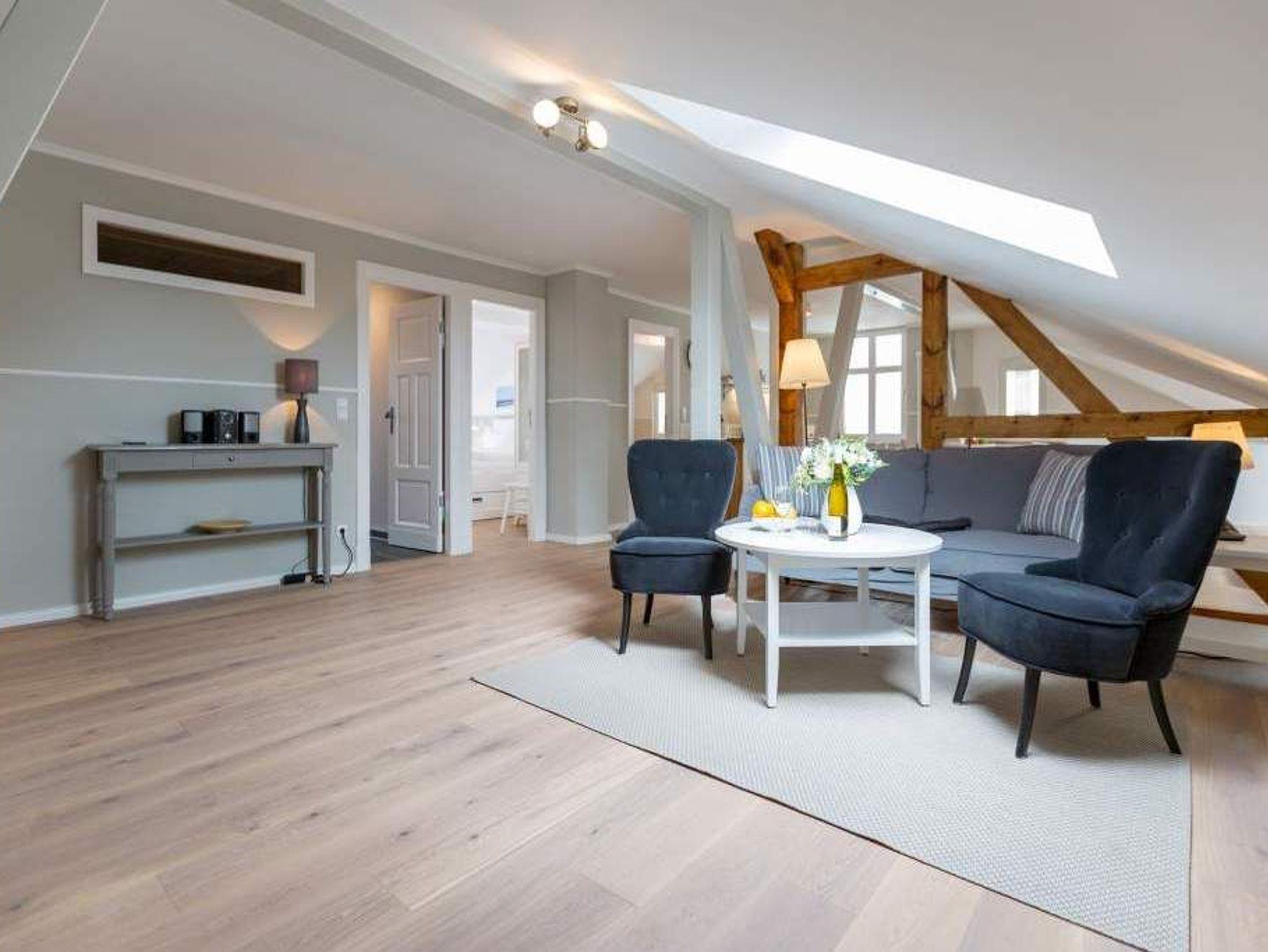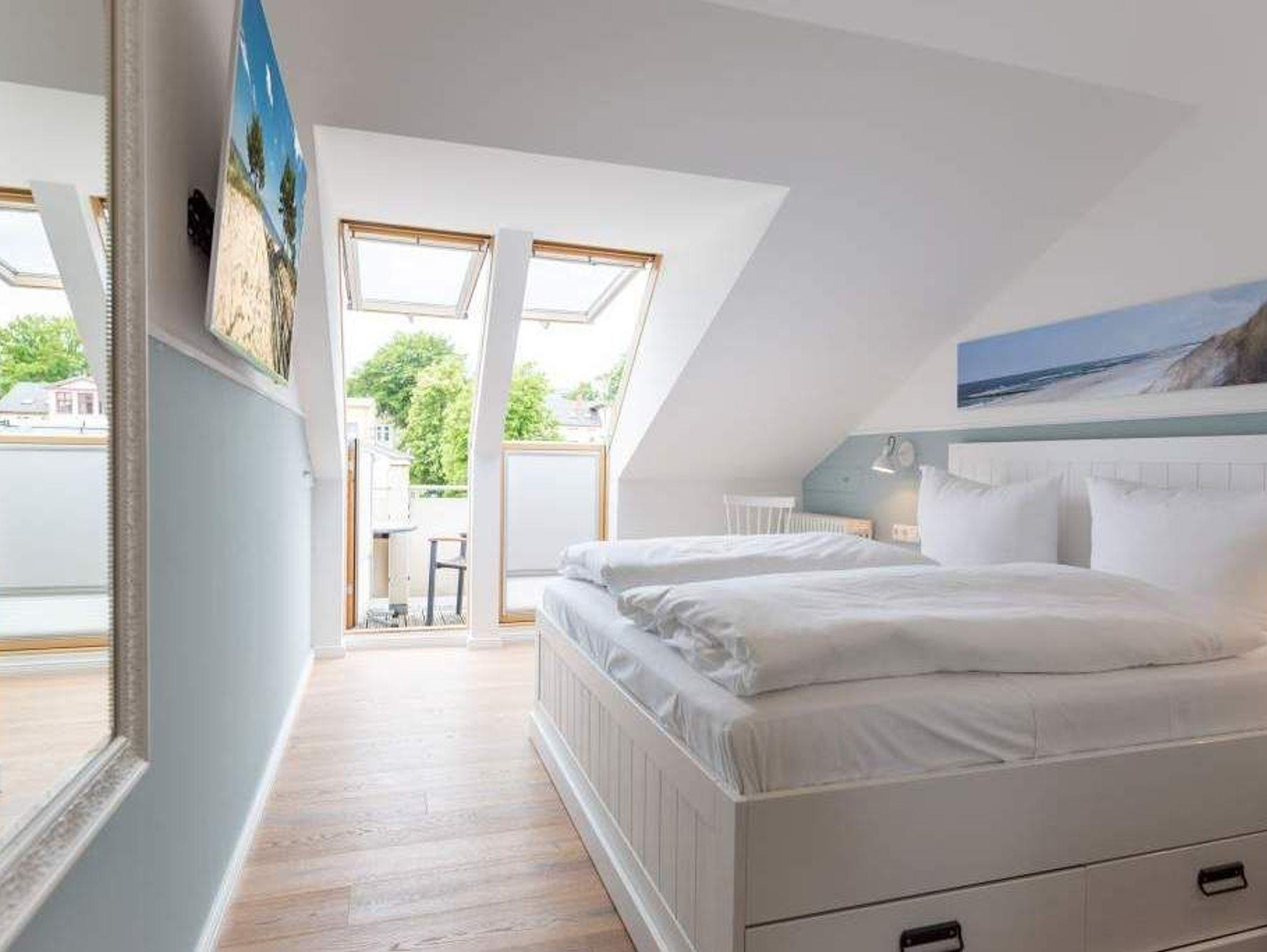 Großzügig und absolut strandnah, stylisch und absolut gemütlich ? die Wohnung 11 mit Meerblick im Dachgeschoss der wunderschön sanierten Bädervilla Saphira verspricht Urlaub der Extraklasse. In den drei Räumen ist Platz; viel Platz für bis zu 5 Personen und ein Kleinkind (bis 3 Jahren im Kinderreisebett). Der lichtdurchflutete Erker ist Küche und Ess-Zimmer in einem. Voll ausgestattet mit Herd, Kühlschrank, Spülmaschine, Kaffeemaschine, Toaster und Wasserkocher ist sie der ideale Ort zum Kochen und Beisammensein. Der stylische runde Tisch ist groß genug für alle auszeithungrigen Esser. Das offene Wohnzimmer ist groß und stilvoll eingerichtet. Die bequeme Sofa-Sitzgruppe eignet sich bestens zum Fernsehschauen. In der Wohnung 11 stehen Ihnen zwei Schlafzimmer zur Verfügung. Alle zwei sind hell und freundlich, haben einen Flat-TV und einen Kleiderschrank. Maritimes Flair durchzieht die Räume. Schlafzimmer eins ist mit einem Doppelbett (1,80 m x 2,00 m) ausgestattet und hat einen Zugang zum Südbalkon (ca.5 qm). Schlafzimmer zwei verfügt über ein Doppelbett (1,60 m x 2,00 m) und ein Einzelbett (0,80 m x 2,00 m). Auf Wunsch stellen wir für unsere kleinen Gäste ein Kinderreisebett (ohne zusätzliche Matratze [&] Bettzeug) und einen Kinderhochstuhl ( gegen einen Aufpreis) zur Verfügung. Das moderne Bad mit Tageslicht verfügt über eine Dusche, Dampfsauna und ein WC. Kommen Sie an und schalten Sie ab. Denn Ihre Betten sind bereits bezogen und Handtücher liegen bereit. Der Pkw-Parkplatz (Nr.11) befindet sich am Haus. Das WLAN ist kostenfrei.