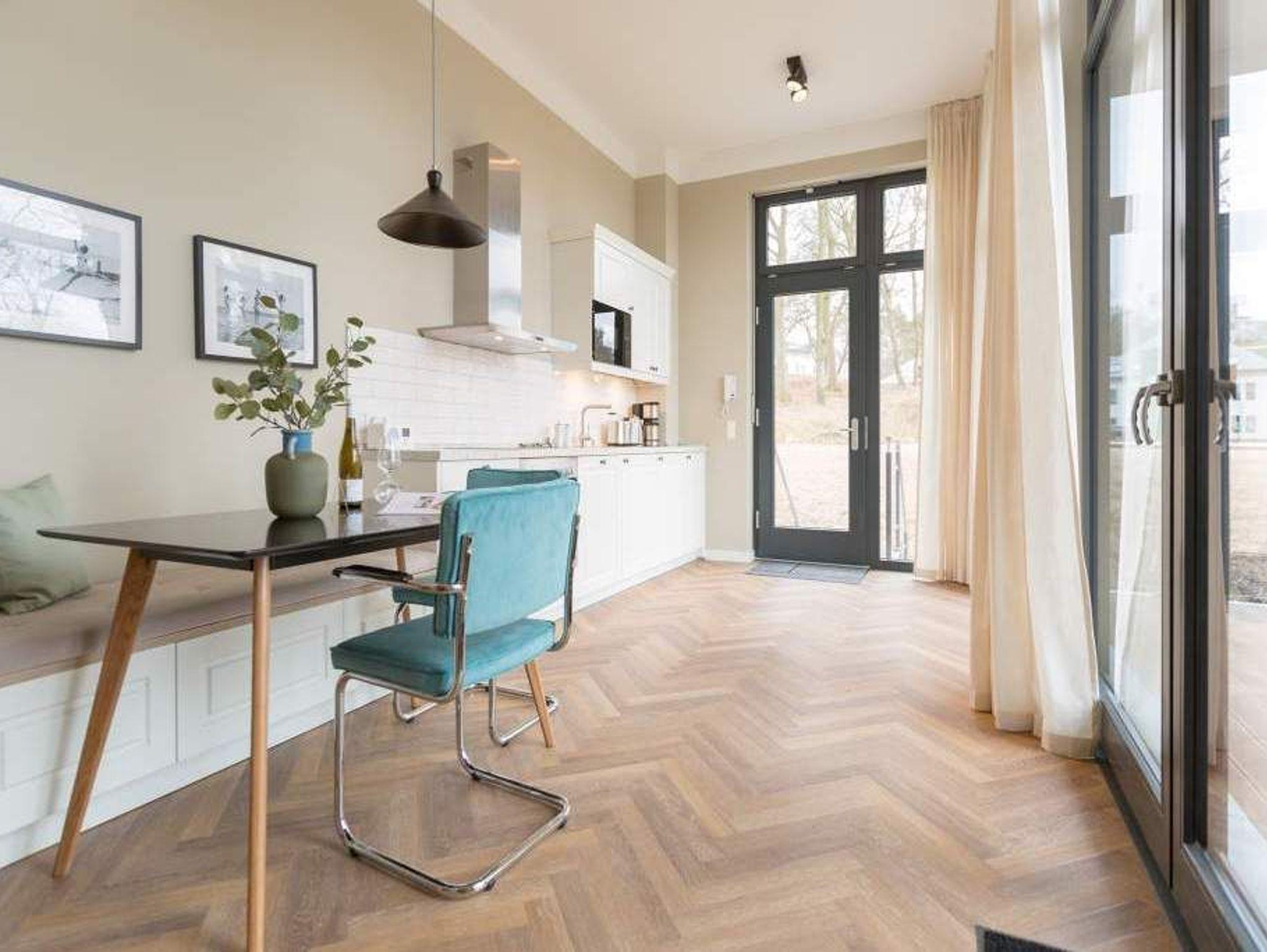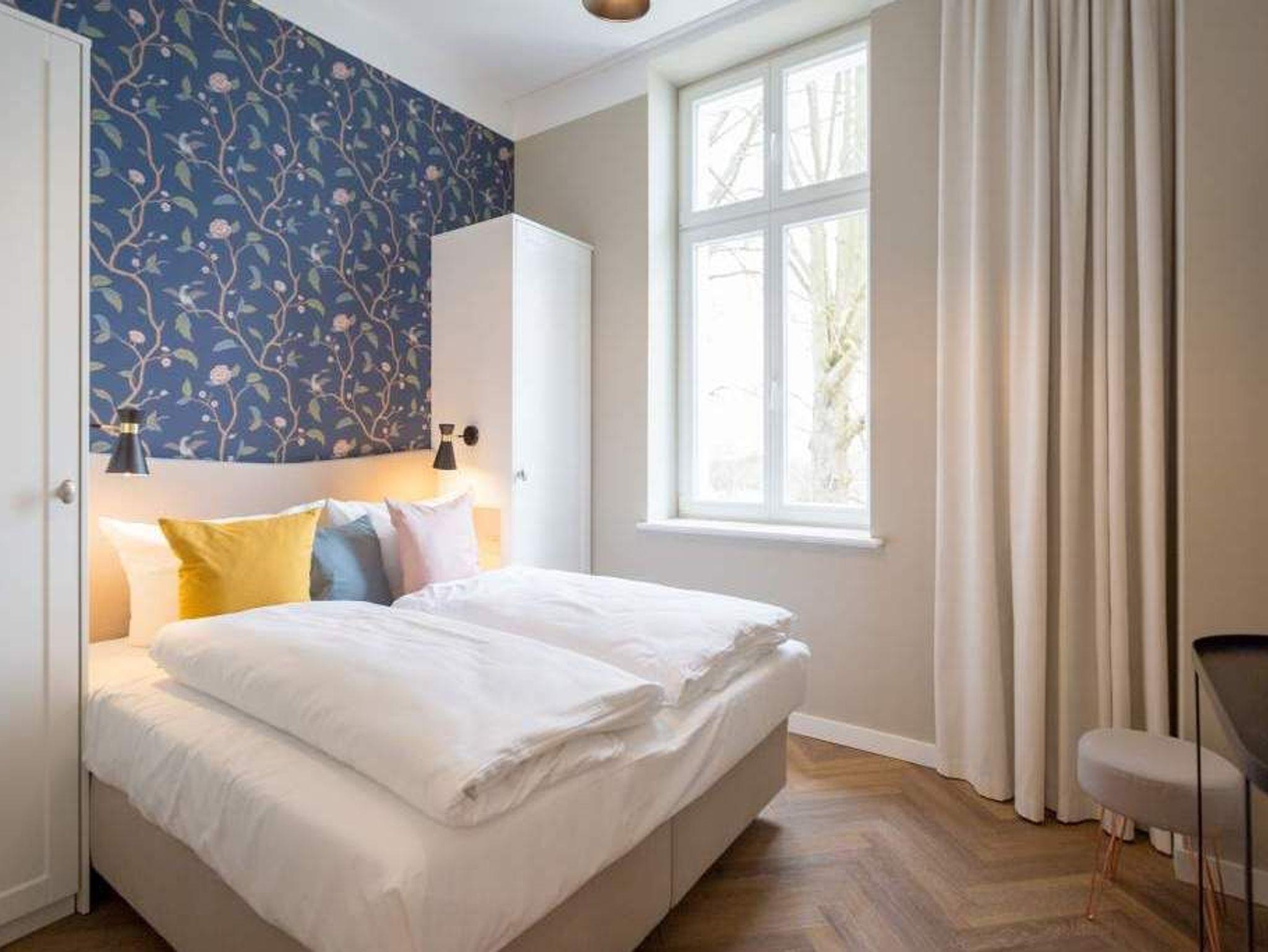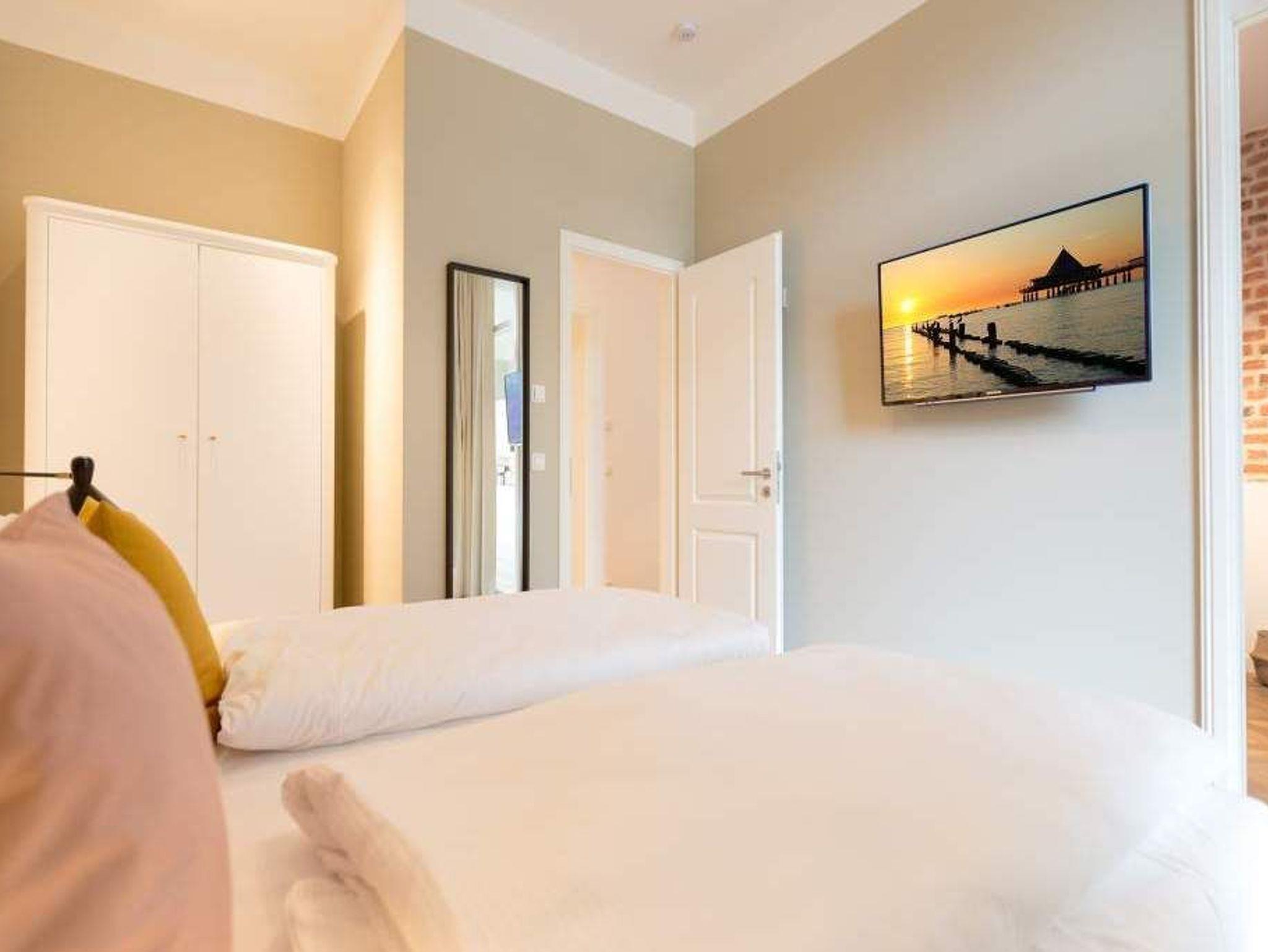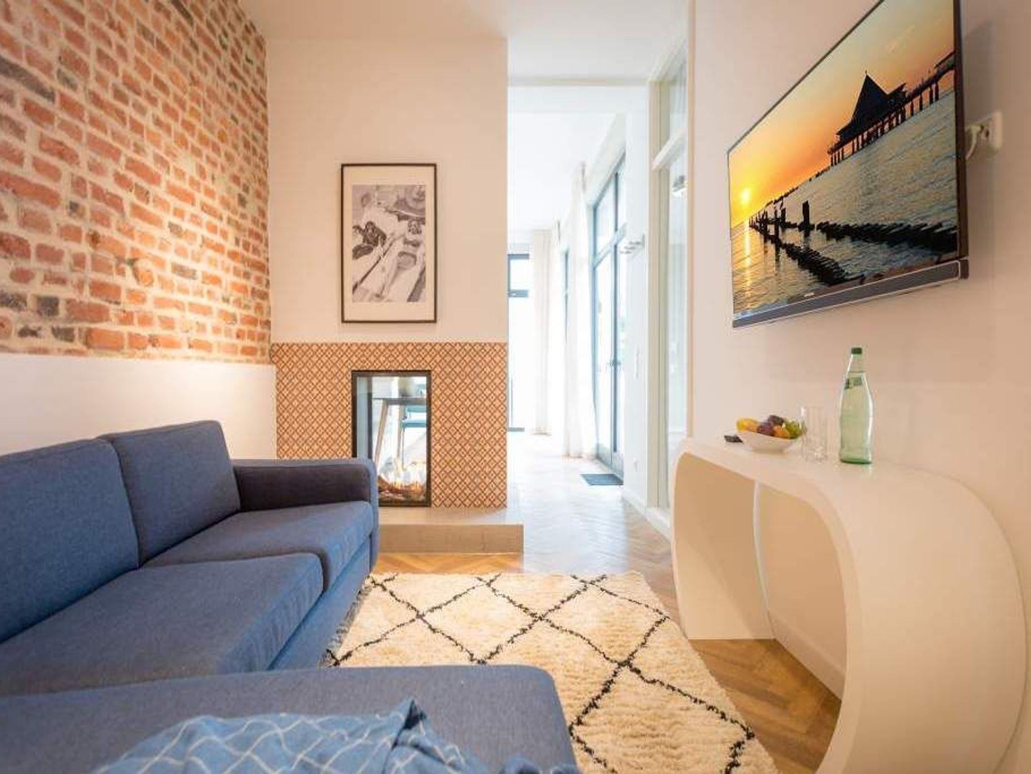 Geschichte zum Anfassen gibt es in der Wohnung 5 im 1. Obergeschoss der Villa Bellevue zu erleben. Denn dank der gelungenen Sanierung der alten Bädervilla können die Bewohner dieses knapp 70 Quadratmeter großen Feriendomizils durch die unverputzt gelassene Backsteinwand die Fenster- und Wandgestaltung der Kaiserzeit nachempfinden. Vier Erwachsenen und zwei Kindern bis drei Jahre (im Kinderreisebett) bietet das Appartement Platz für eine gemeinsame Auszeit. Hier am gemütlichen Esstisch gemeinsam zu dinieren und dabei auf den wunderschönen Gas-Kamin zu schauen, ist schon Erholung pur. Zum Kochen finden Sie in der offenen Wohnküche vom hochwertigen Markenherd, über die Mikrowelle bis hin zum großen Kühlschrank alles Nötige für ein gelungenes Menü. Warm und wohnlich wirken die drei Räume der Wohnung durch das schöne Fischgrät-Parkett. Faulenzen Sie auf dem gemütlichen Ecksofa beim Blick auf den auch von hier aus einsehbaren Kamin oder lassen Sie sich vom Home-Entertainment des 42-Zoll-Flat-TVs unterhalten. Sonne satt können Sie auf dem West-Balkon genießen. Ob beim Frühstück unter freiem Himmel oder mit einem kühlen Erfrischungsgetränk zum Abend ? von hier aus können Sie das sanfte Rauschen der nur 400 Meter entfernten Ostsee hören. Die beiden Schlafzimmer sind geräumig und wunderschön gestaltet, mit Boxspringbetten ( 1x 1,60 x 2,00m / 1x 1,80m x 2,00m) ausgestattet. Die edlen Design-Tapeten sorgen für eine exklusive Atmosphäre, die man nicht nur beim Schlafen genießen kann. Das Tageslicht-Bad verfügt über eine Dusche mit viel Platz, einen Waschtisch und ein WC. Highlight des hauseigenen Wellnessurlaubs wird ganz sicher der Genuss der finnischen Sauna werden, die an kühlen Abenden oder stürmischen Tagen für wohlige Wärme sorgt. Entspannen Sie, atmen Sie tief durch und vergessen Sie in dieser schönen Wohnung einfach einmal die Hektik und den Stress des Alltags. Wir sorgen für eine schöne Atmosphäre. Die Betten sind darum bei Ihrer Anreise schon bezogen und Handtücher liegen für Sie bereit. Ihr Auto können Sie auf dem Außenstellplatz des Hauses parken.