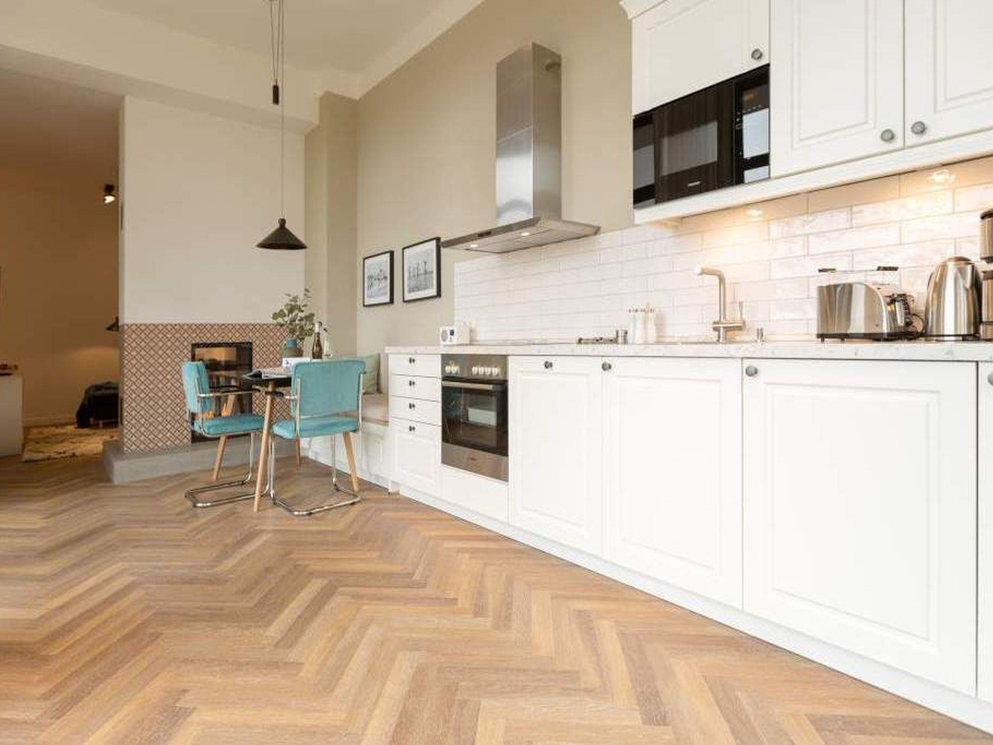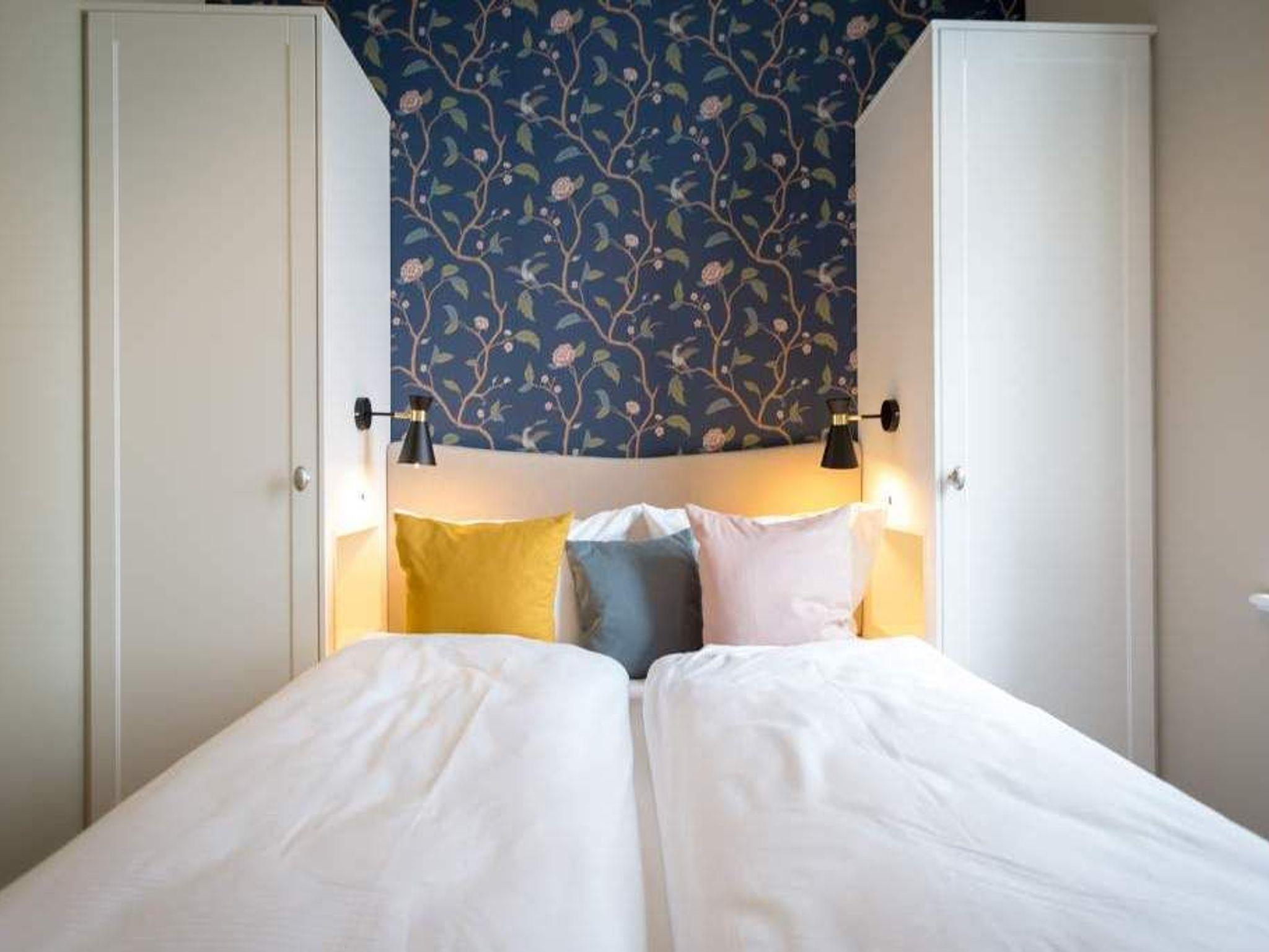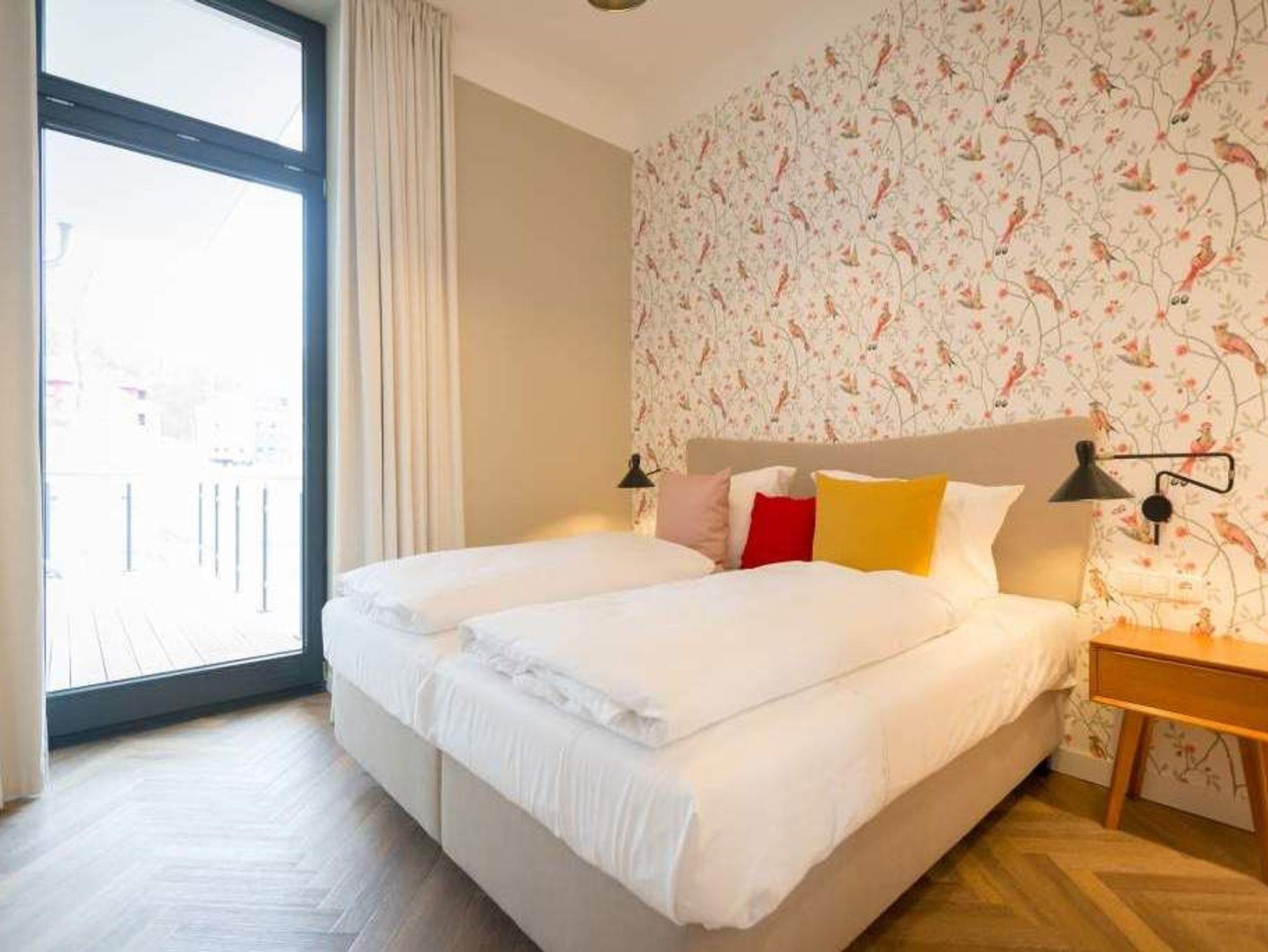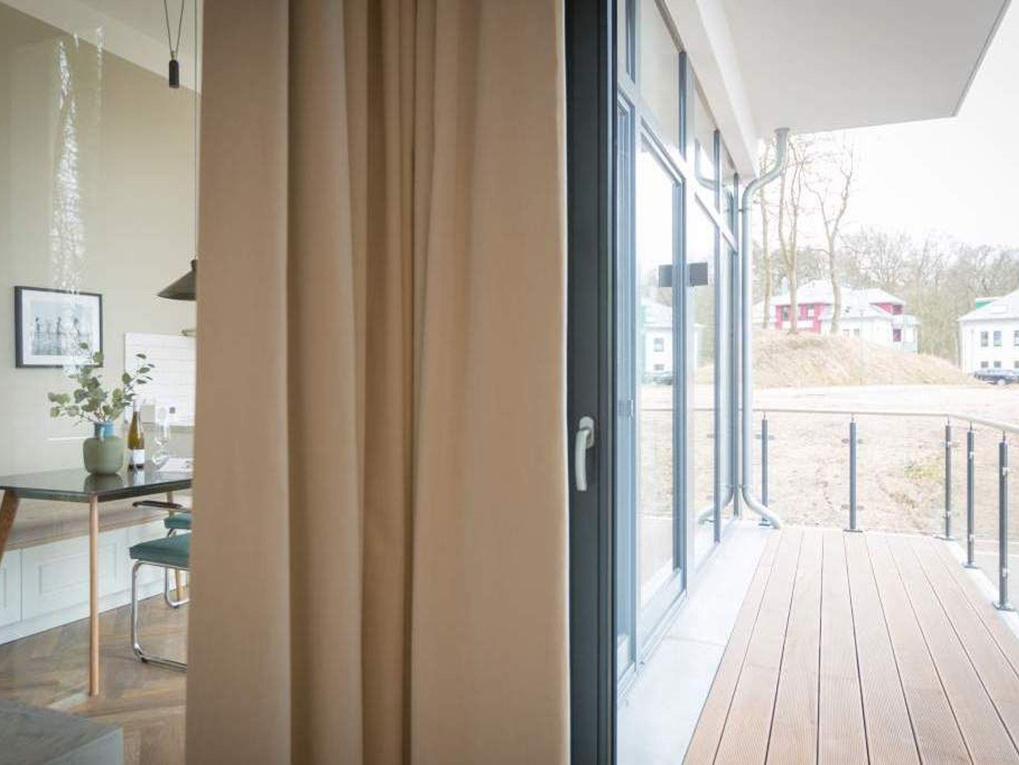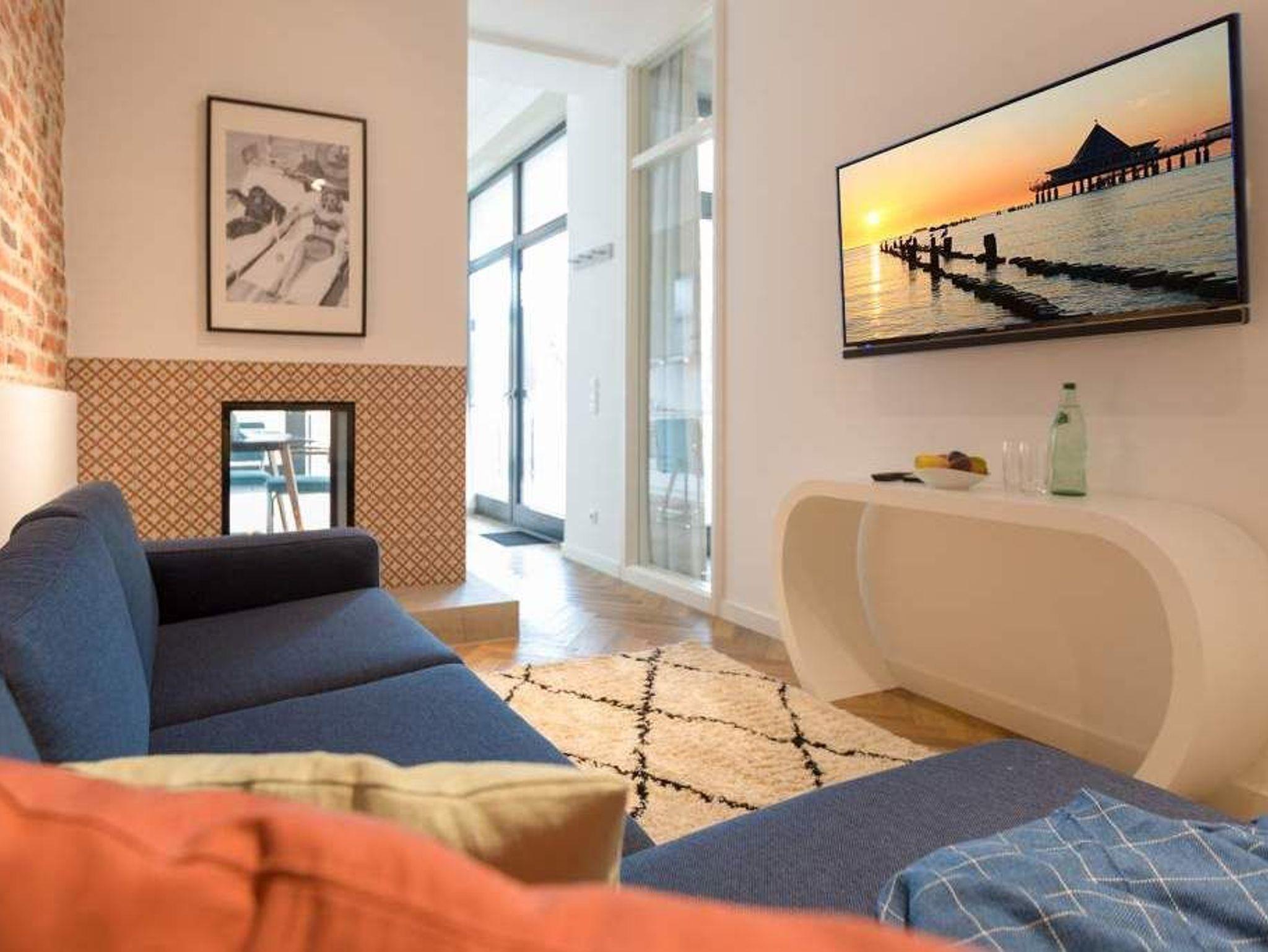 Geschichte zum Anfassen gibt es in der Wohnung 5 im 1. Obergeschoss der Villa Bellevue zu erleben. Denn dank der gelungenen Sanierung der alten Bädervilla können die Bewohner dieses knapp 70 Quadratmeter großen Feriendomizils durch die unverputzt gelassene Backsteinwand die Fenster- und Wandgestaltung der Kaiserzeit nachempfinden. Vier Erwachsenen und zwei Kindern bis drei Jahre (im Kinderreisebett) bietet das Appartement Platz für eine gemeinsame Auszeit. Hier am gemütlichen Esstisch gemeinsam zu dinieren und dabei auf den wunderschönen Gas-Kamin zu schauen, ist schon Erholung pur. Zum Kochen finden Sie in der offenen Wohnküche vom hochwertigen Markenherd, über die Mikrowelle bis hin zum großen Kühlschrank alles Nötige für ein gelungenes Menü. Warm und wohnlich wirken die drei Räume der Wohnung durch das schöne Fischgrät-Parkett. Faulenzen Sie auf dem gemütlichen Ecksofa beim Blick auf den auch von hier aus einsehbaren Kamin oder lassen Sie sich vom Home-Entertainment des 42-Zoll-Flat-TVs unterhalten. Sonne satt können Sie auf dem West-Balkon genießen. Ob beim Frühstück unter freiem Himmel oder mit einem kühlen Erfrischungsgetränk zum Abend ? von hier aus können Sie das sanfte Rauschen der nur 400 Meter entfernten Ostsee hören. Die beiden Schlafzimmer sind geräumig und wunderschön gestaltet, mit Boxspringbetten ( 1x 1,60 x 2,00m / 1x 1,80m x 2,00m) ausgestattet. Die edlen Design-Tapeten sorgen für eine exklusive Atmosphäre, die man nicht nur beim Schlafen genießen kann. Das Tageslicht-Bad verfügt über eine Dusche mit viel Platz, einen Waschtisch und ein WC. Highlight des hauseigenen Wellnessurlaubs wird ganz sicher der Genuss der finnischen Sauna werden, die an kühlen Abenden oder stürmischen Tagen für wohlige Wärme sorgt. Entspannen Sie, atmen Sie tief durch und vergessen Sie in dieser schönen Wohnung einfach einmal die Hektik und den Stress des Alltags. Wir sorgen für eine schöne Atmosphäre. Die Betten sind darum bei Ihrer Anreise schon bezogen und Handtücher liegen für Sie bereit. Ihr Auto können Sie auf dem Außenstellplatz des Hauses parken.