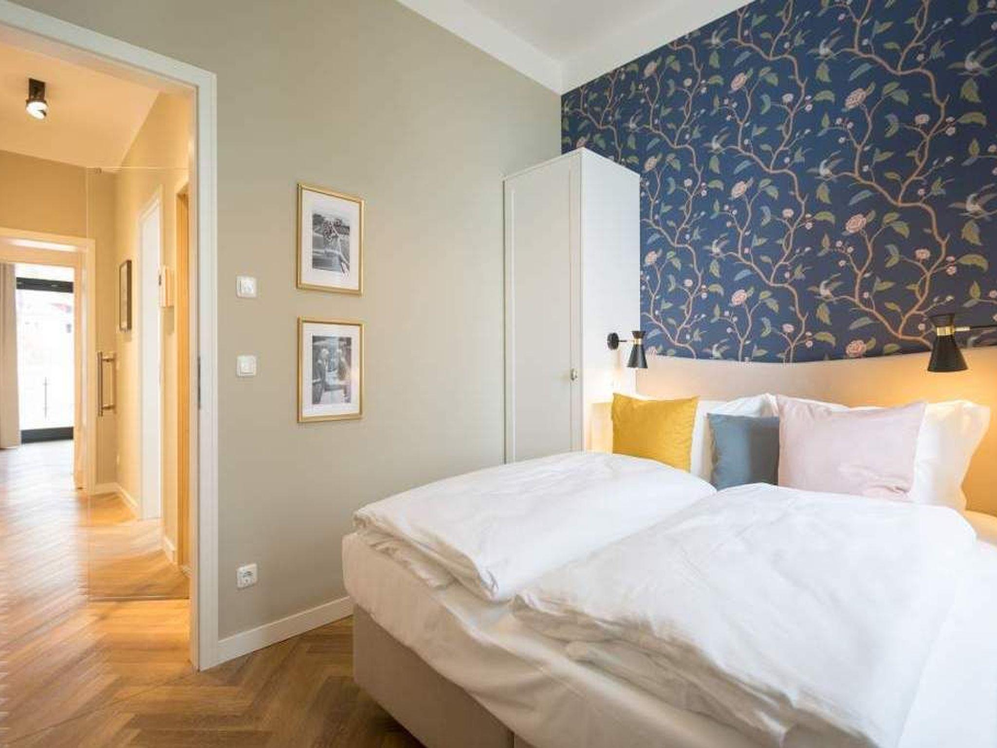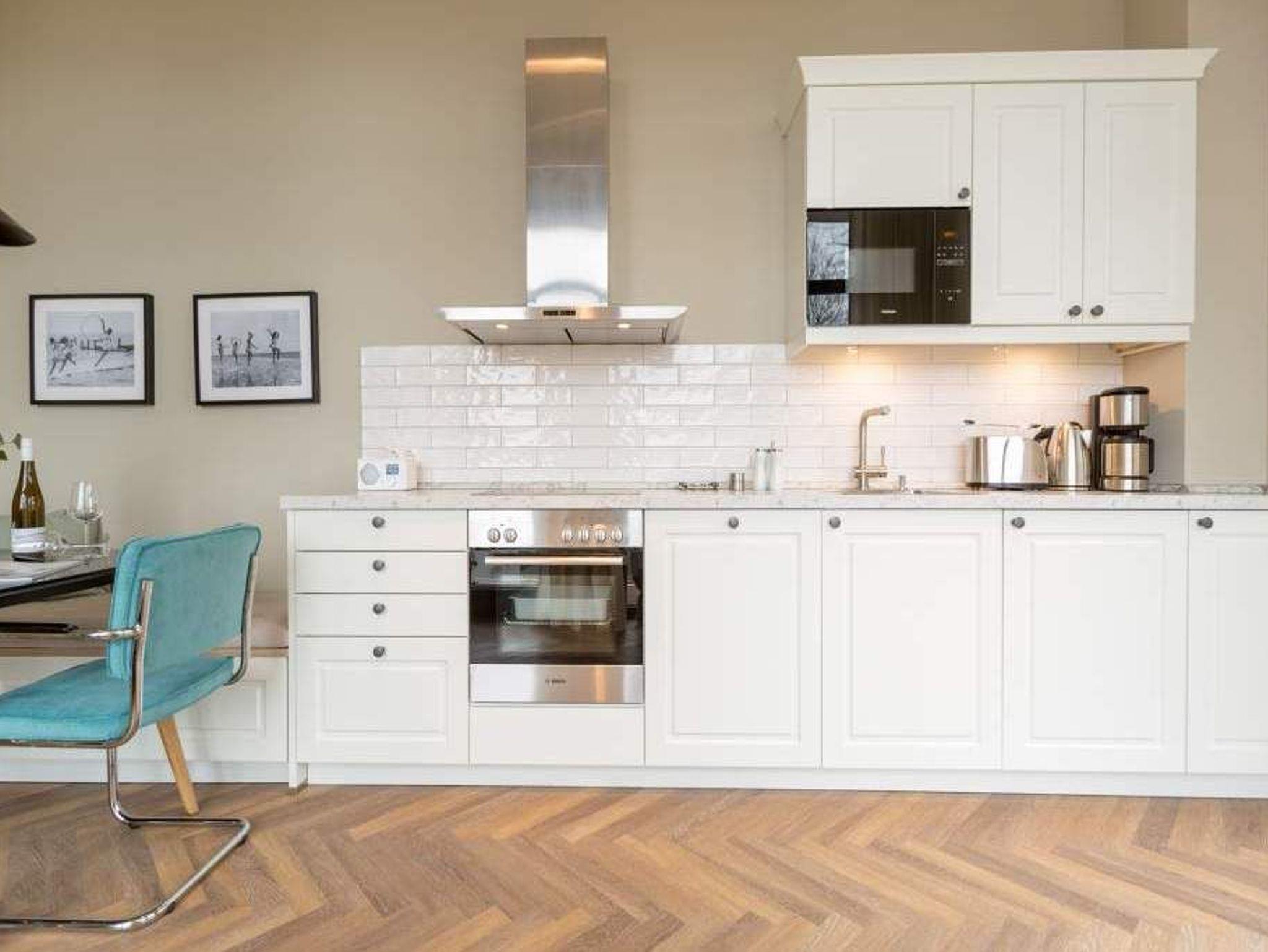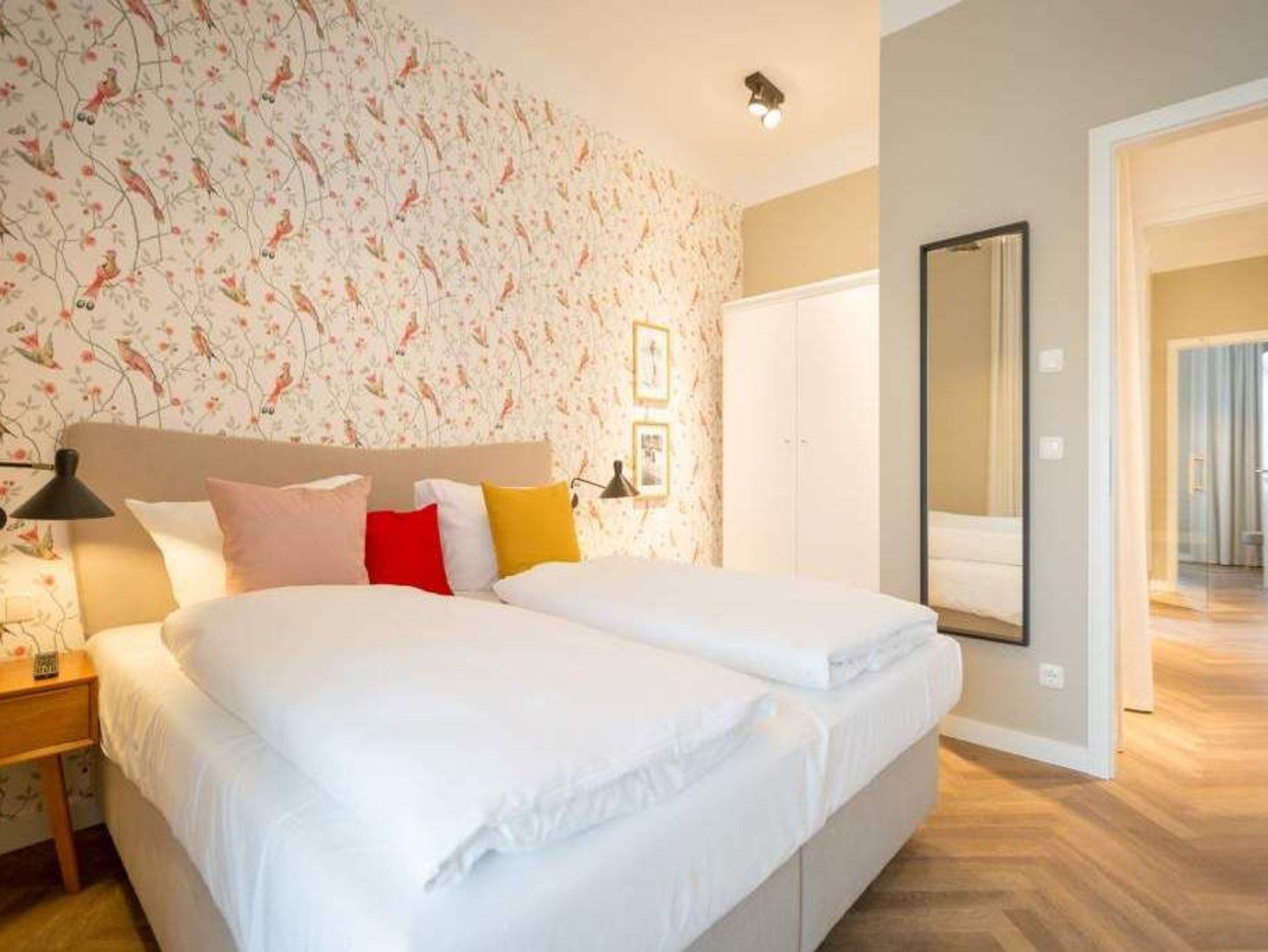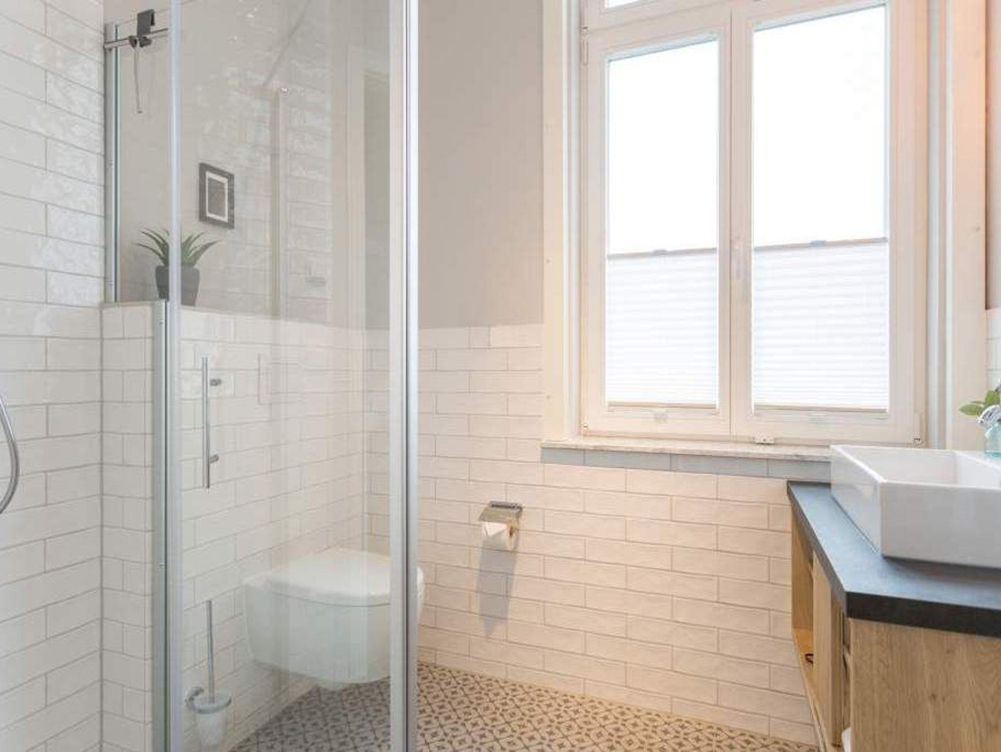 Geschichte zum Anfassen gibt es in der Wohnung 5 im 1. Obergeschoss der Villa Bellevue zu erleben. Denn dank der gelungenen Sanierung der alten Bädervilla können die Bewohner dieses knapp 70 Quadratmeter großen Feriendomizils durch die unverputzt gelassene Backsteinwand die Fenster- und Wandgestaltung der Kaiserzeit nachempfinden. Vier Erwachsenen und zwei Kindern bis drei Jahre (im Kinderreisebett) bietet das Appartement Platz für eine gemeinsame Auszeit. Hier am gemütlichen Esstisch gemeinsam zu dinieren und dabei auf den wunderschönen Gas-Kamin zu schauen, ist schon Erholung pur. Zum Kochen finden Sie in der offenen Wohnküche vom hochwertigen Markenherd, über die Mikrowelle bis hin zum großen Kühlschrank alles Nötige für ein gelungenes Menü. Warm und wohnlich wirken die drei Räume der Wohnung durch das schöne Fischgrät-Parkett. Faulenzen Sie auf dem gemütlichen Ecksofa beim Blick auf den auch von hier aus einsehbaren Kamin oder lassen Sie sich vom Home-Entertainment des 42-Zoll-Flat-TVs unterhalten. Sonne satt können Sie auf dem West-Balkon genießen. Ob beim Frühstück unter freiem Himmel oder mit einem kühlen Erfrischungsgetränk zum Abend ? von hier aus können Sie das sanfte Rauschen der nur 400 Meter entfernten Ostsee hören. Die beiden Schlafzimmer sind geräumig und wunderschön gestaltet, mit Boxspringbetten ( 1x 1,60 x 2,00m / 1x 1,80m x 2,00m) ausgestattet. Die edlen Design-Tapeten sorgen für eine exklusive Atmosphäre, die man nicht nur beim Schlafen genießen kann. Das Tageslicht-Bad verfügt über eine Dusche mit viel Platz, einen Waschtisch und ein WC. Highlight des hauseigenen Wellnessurlaubs wird ganz sicher der Genuss der finnischen Sauna werden, die an kühlen Abenden oder stürmischen Tagen für wohlige Wärme sorgt. Entspannen Sie, atmen Sie tief durch und vergessen Sie in dieser schönen Wohnung einfach einmal die Hektik und den Stress des Alltags. Wir sorgen für eine schöne Atmosphäre. Die Betten sind darum bei Ihrer Anreise schon bezogen und Handtücher liegen für Sie bereit. Ihr Auto können Sie auf dem Außenstellplatz des Hauses parken.