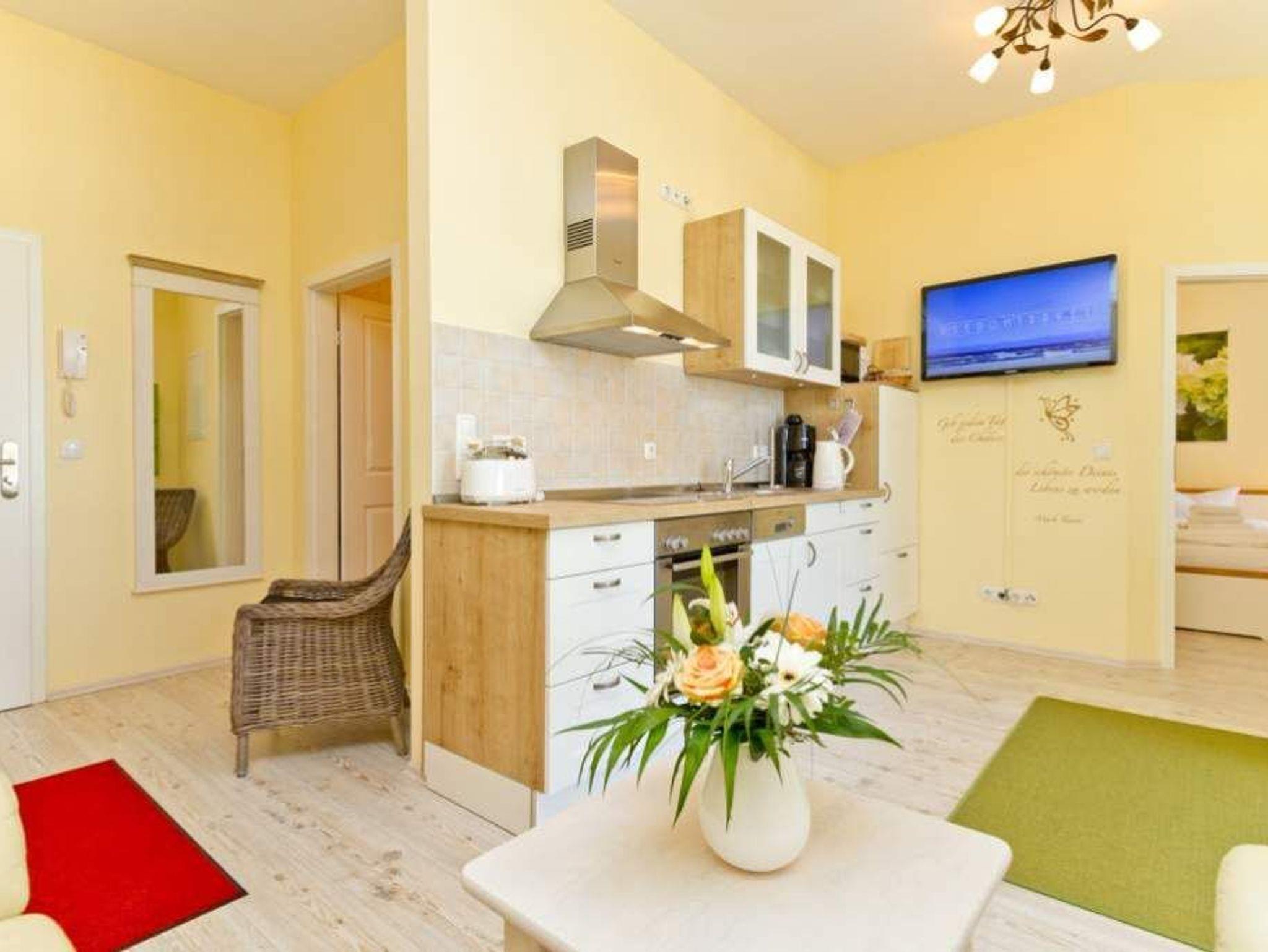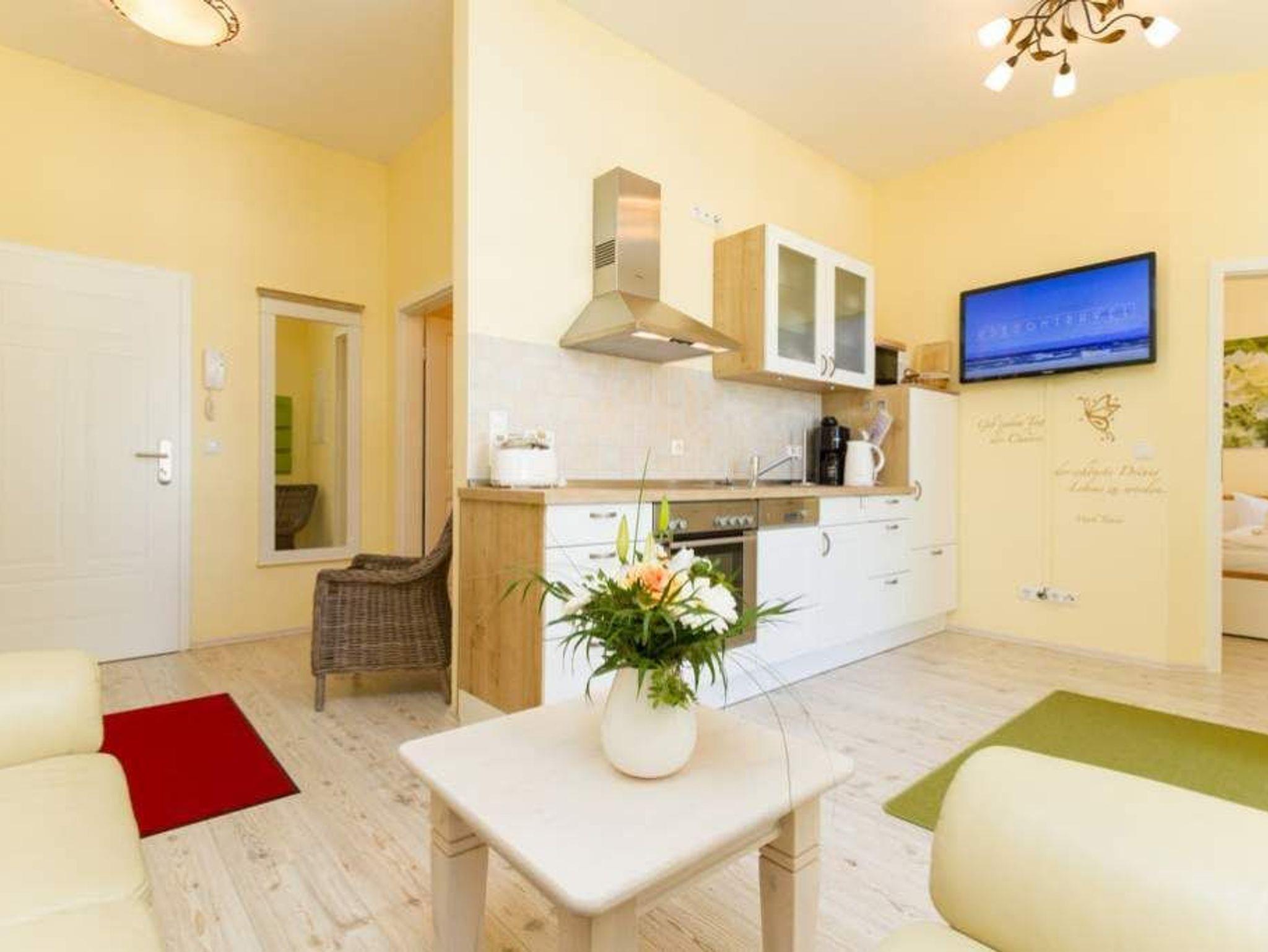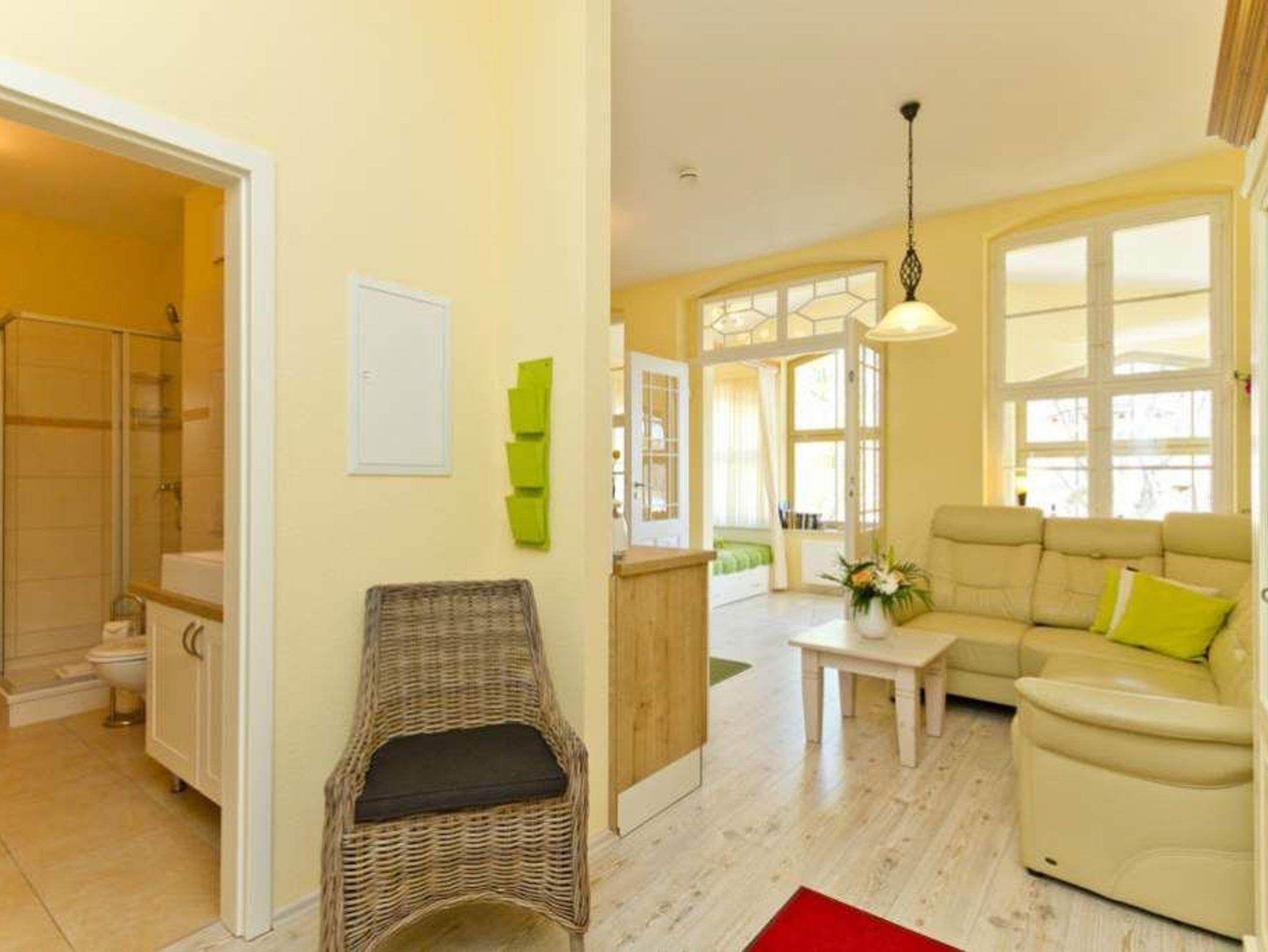 Im 1. Geschoss der Villa empfängt Sie eine wunderschön gestaltete 2-Raum-Ferienwohnung (57qm für maximal 4 Personen). Die moderne, helle Einrichtung im gemütlichen Landhausstil wurde mit den passenden Farben , Stoffen und Dekorationen kombiniert und ergibt so ein schönes Urlaubsdomizil für einen erholsamen Urlaub. Der Wohnbereich ist mit einer Ledersitzgruppe und Flat-TV ausgestattet und wird durch die offene, komplett ausgestattete Küche ergänzt. Ein besonderes Highlight ist die schöne, lichtdurchflutete Loggia. Neben einem Essplatz befindet sich hier eine wunderschöne Liegelandschaft mit freiem Blick in das alte Heringsdorfer Ortszentrum, die, umgeben von altem Baumbestand, ein toller Rückzugsort zum Entspannen ist und gleichzeitig eine vollwertige 3. und 4. Schlafmöglichkeit (einteilige Matratze 1,80 m x 2,00 m) bietet. Das Schlafzimmer mit Doppelbett 1,80 m x 2,00 m und mit zusätzlichem Flat-TV und ein Bad mit Dusche und WC komplettieren das Appartement. Für Ihren Komfort sind die Betten bei der Anreise bezogen und Handtücher liegen bereit (Erstausstattung). Das WLAN-Netz im Haus steht kostenfrei zur Verfügung.