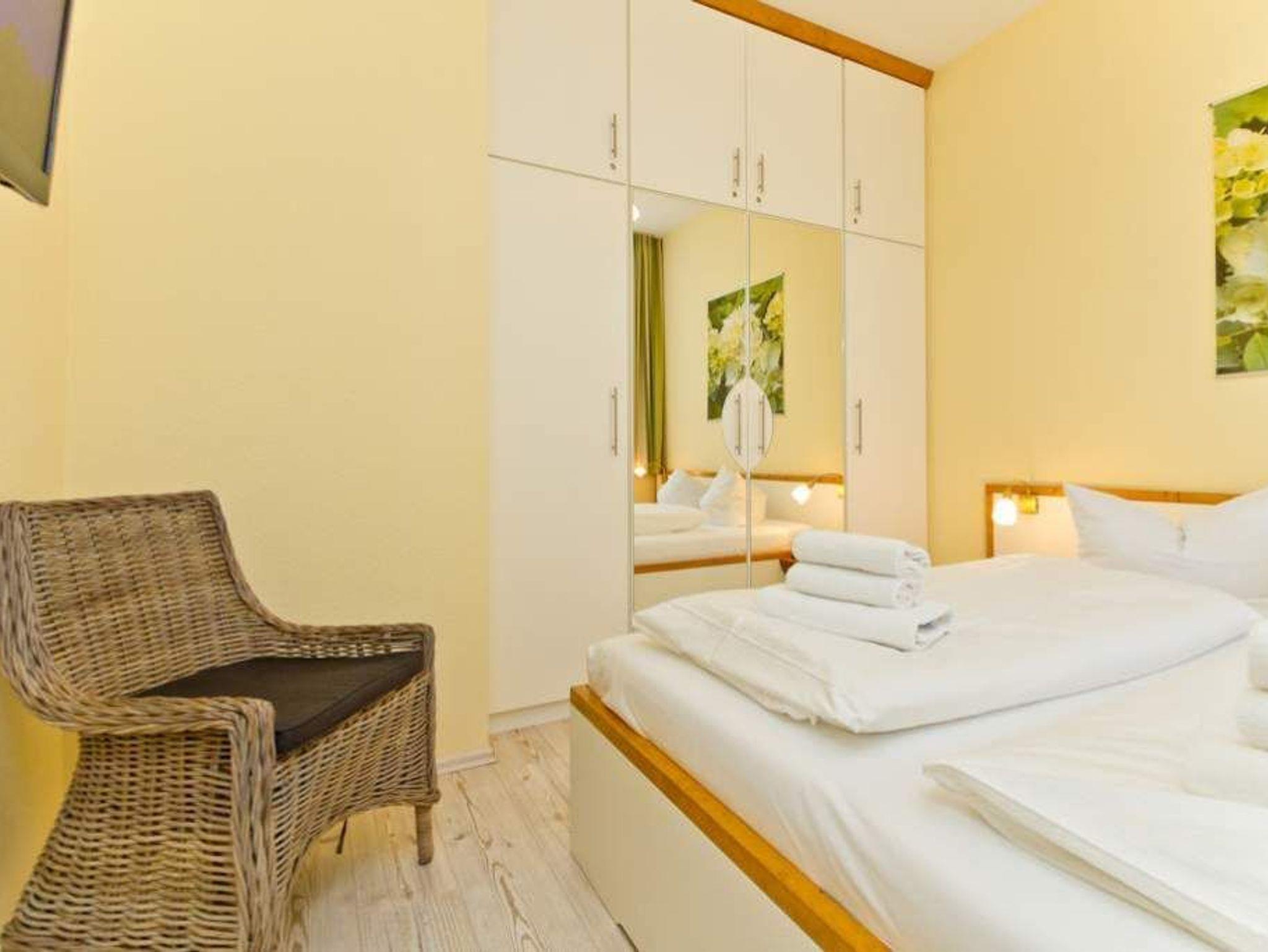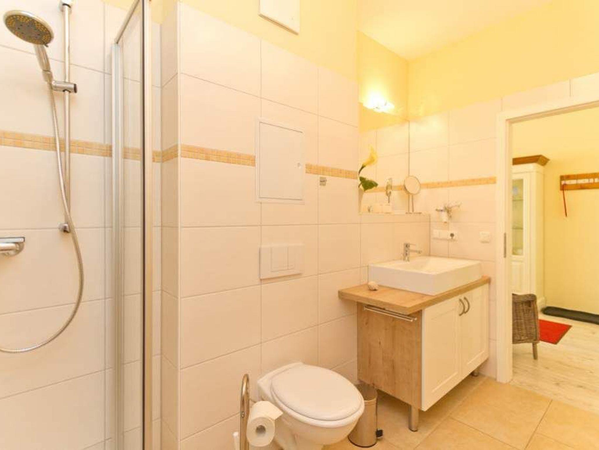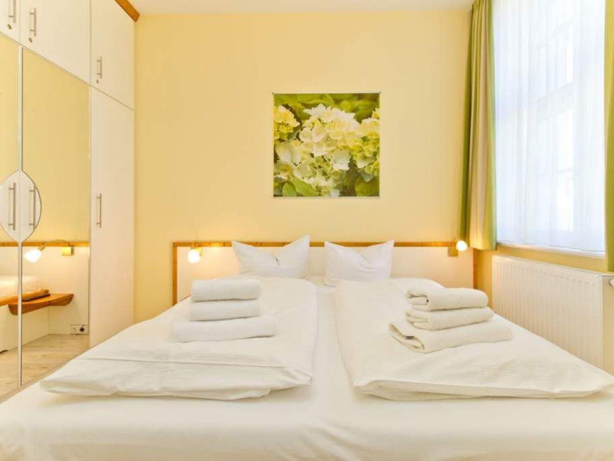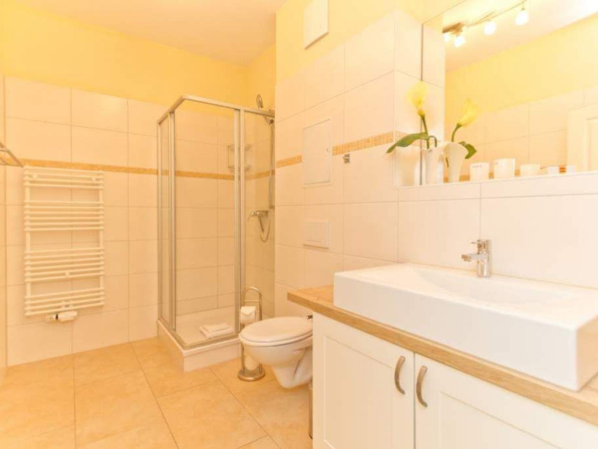 Im 1. Geschoss der Villa empfängt Sie eine wunderschön gestaltete 2-Raum-Ferienwohnung (57qm für maximal 4 Personen). Die moderne, helle Einrichtung im gemütlichen Landhausstil wurde mit den passenden Farben , Stoffen und Dekorationen kombiniert und ergibt so ein schönes Urlaubsdomizil für einen erholsamen Urlaub. Der Wohnbereich ist mit einer Ledersitzgruppe und Flat-TV ausgestattet und wird durch die offene, komplett ausgestattete Küche ergänzt. Ein besonderes Highlight ist die schöne, lichtdurchflutete Loggia. Neben einem Essplatz befindet sich hier eine wunderschöne Liegelandschaft mit freiem Blick in das alte Heringsdorfer Ortszentrum, die, umgeben von altem Baumbestand, ein toller Rückzugsort zum Entspannen ist und gleichzeitig eine vollwertige 3. und 4. Schlafmöglichkeit (einteilige Matratze 1,80 m x 2,00 m) bietet. Das Schlafzimmer mit Doppelbett 1,80 m x 2,00 m und mit zusätzlichem Flat-TV und ein Bad mit Dusche und WC komplettieren das Appartement. Für Ihren Komfort sind die Betten bei der Anreise bezogen und Handtücher liegen bereit (Erstausstattung). Das WLAN-Netz im Haus steht kostenfrei zur Verfügung.
