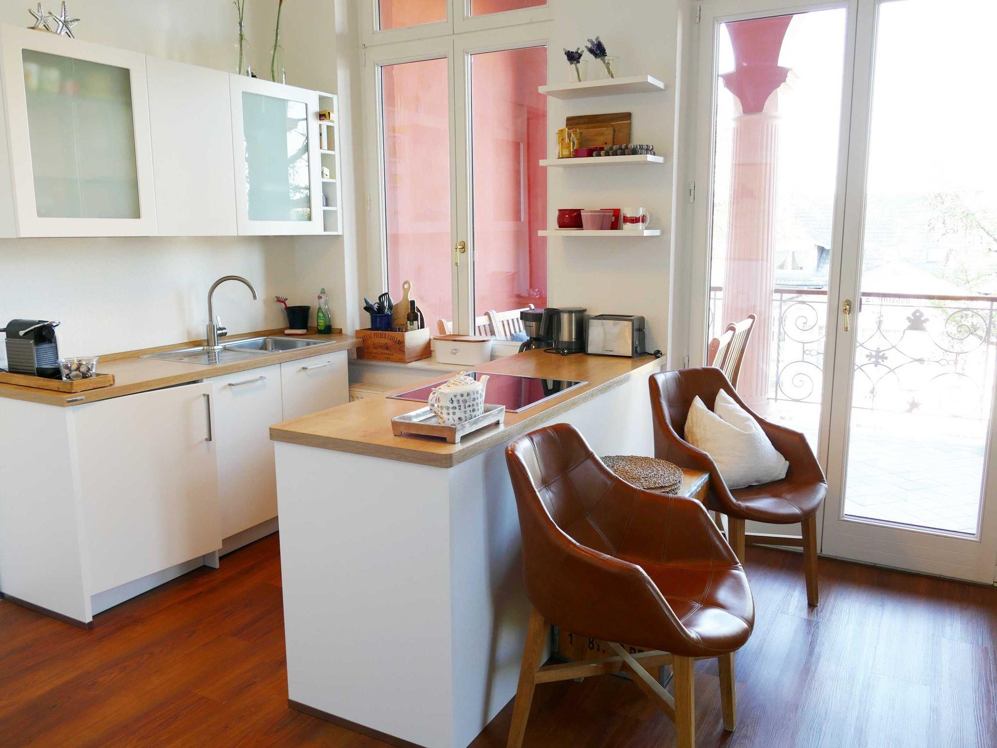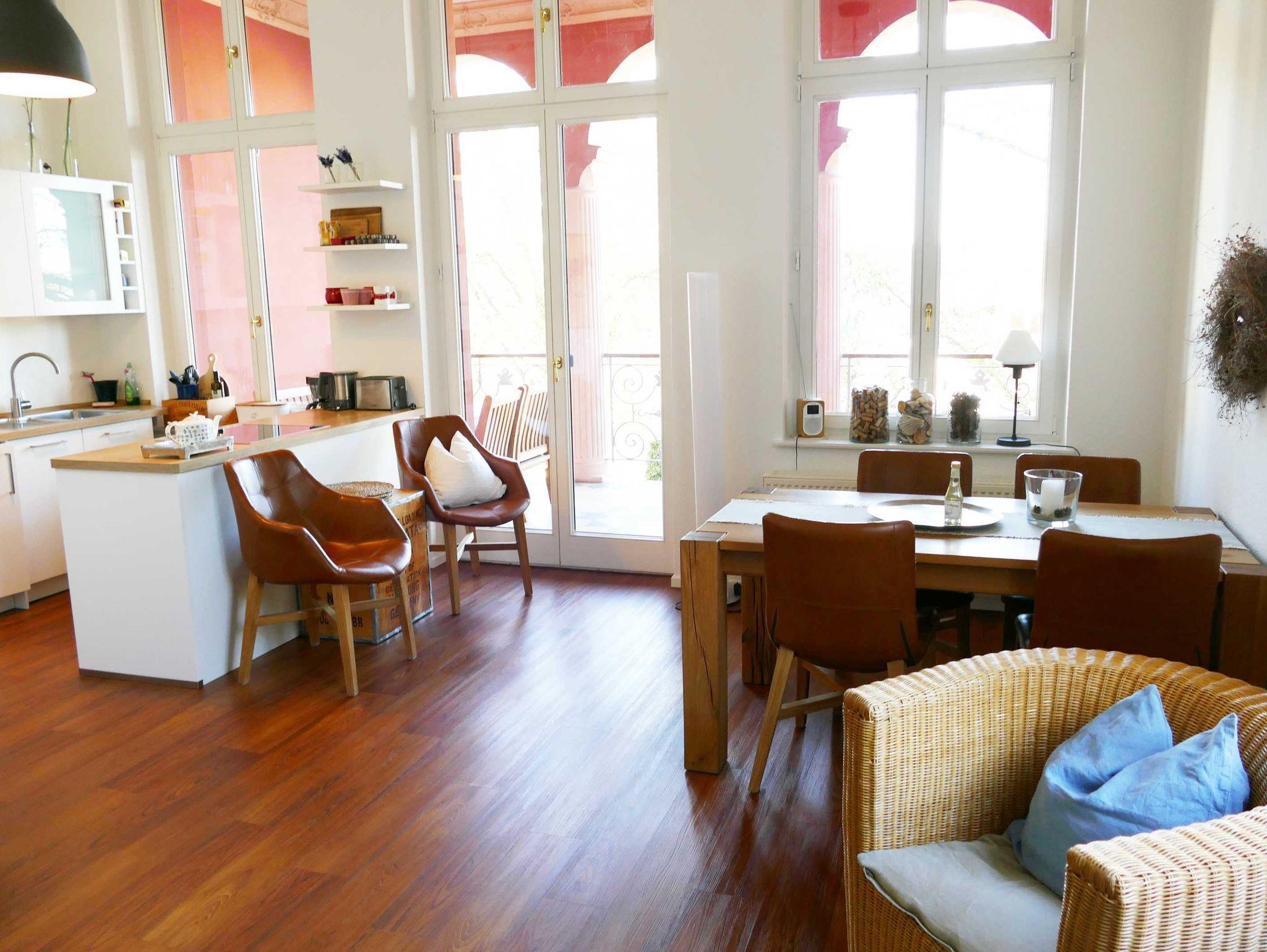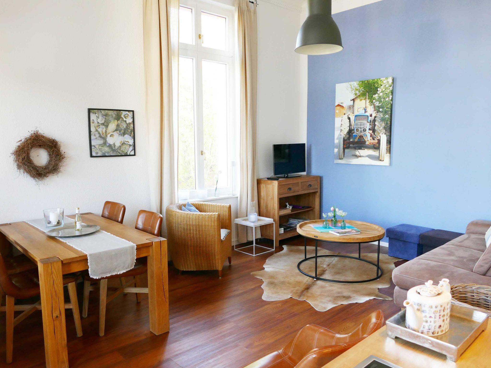 Herzlich willkommen in unserer komfortablen 3-Raum-Ferienwohnung in der charmanten Villa Hintze. Diese 85 qm große gemütliche Unterkunft befindet sich in der ersten Etage und bietet Ihnen ein helles, einladendes Wohnzimmer, das mit einer bequemen Couch und einem Flat-TV ausgestattet ist. Von hier aus gelangen Sie auf die großzügig möblierte Loggia, wo Sie entspannte Stunden verbringen können. Die offene Küche, die harmonisch ins Wohnzimmer integriert ist, lässt keine Wünsche offen. Sie finden hier einen modernen Induktionsherd, eine Spülmaschine, einen Kühlschrank, eine Spüle und Geschirr - perfekt für Ihre kulinarischen Abenteuer!