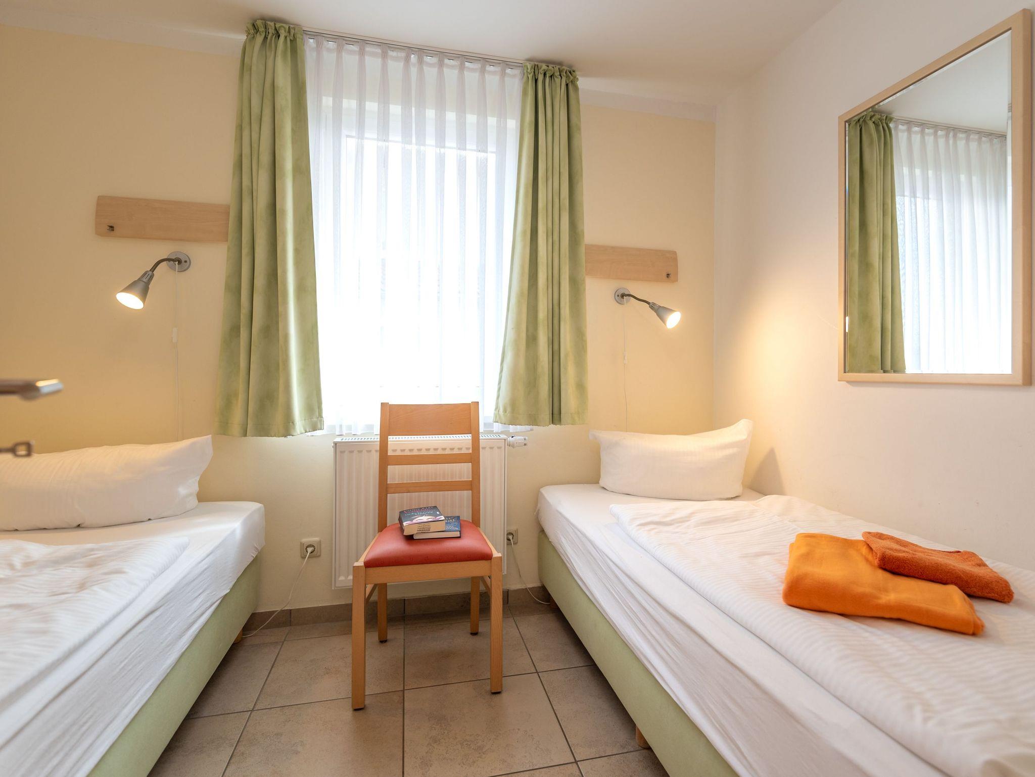 Die Ferienwohnung verfügt über ein gemütliches Schlafzimmer mit Doppelbett und ein weiteres Schlafzimmer mit zwei getrennt stehenden Betten. Das Wohnzimmer ist mit einer komfortablen Ledersitzgarnitur, einem Esstisch mit vier Stühlen sowie einem Flachbild-SAT-TV (FullHD/LED) und einem CD-Radio ausgestattet. Die integrierte, voll ausgestattete Küchenzeile lässt keine Wünsche offen.