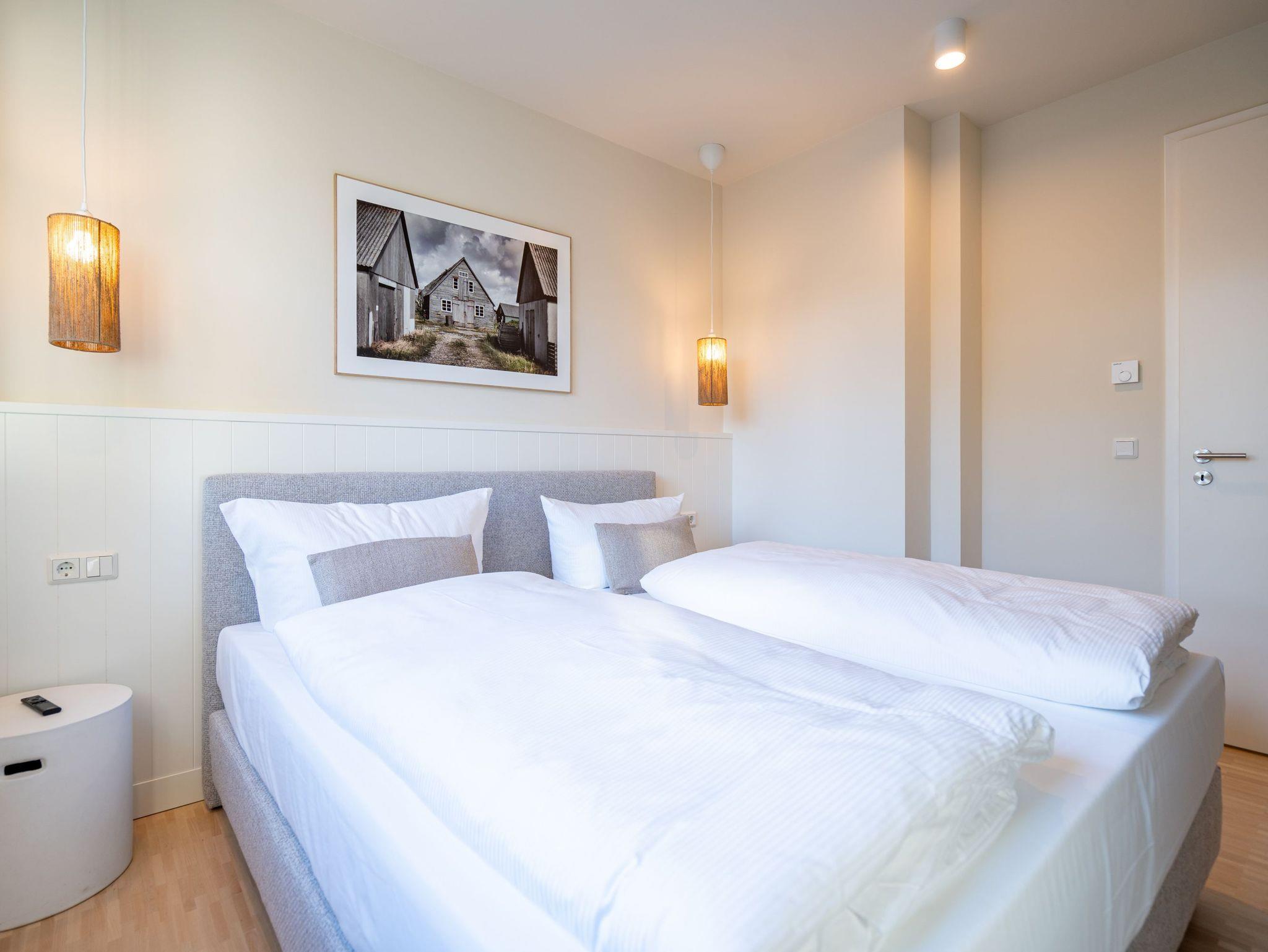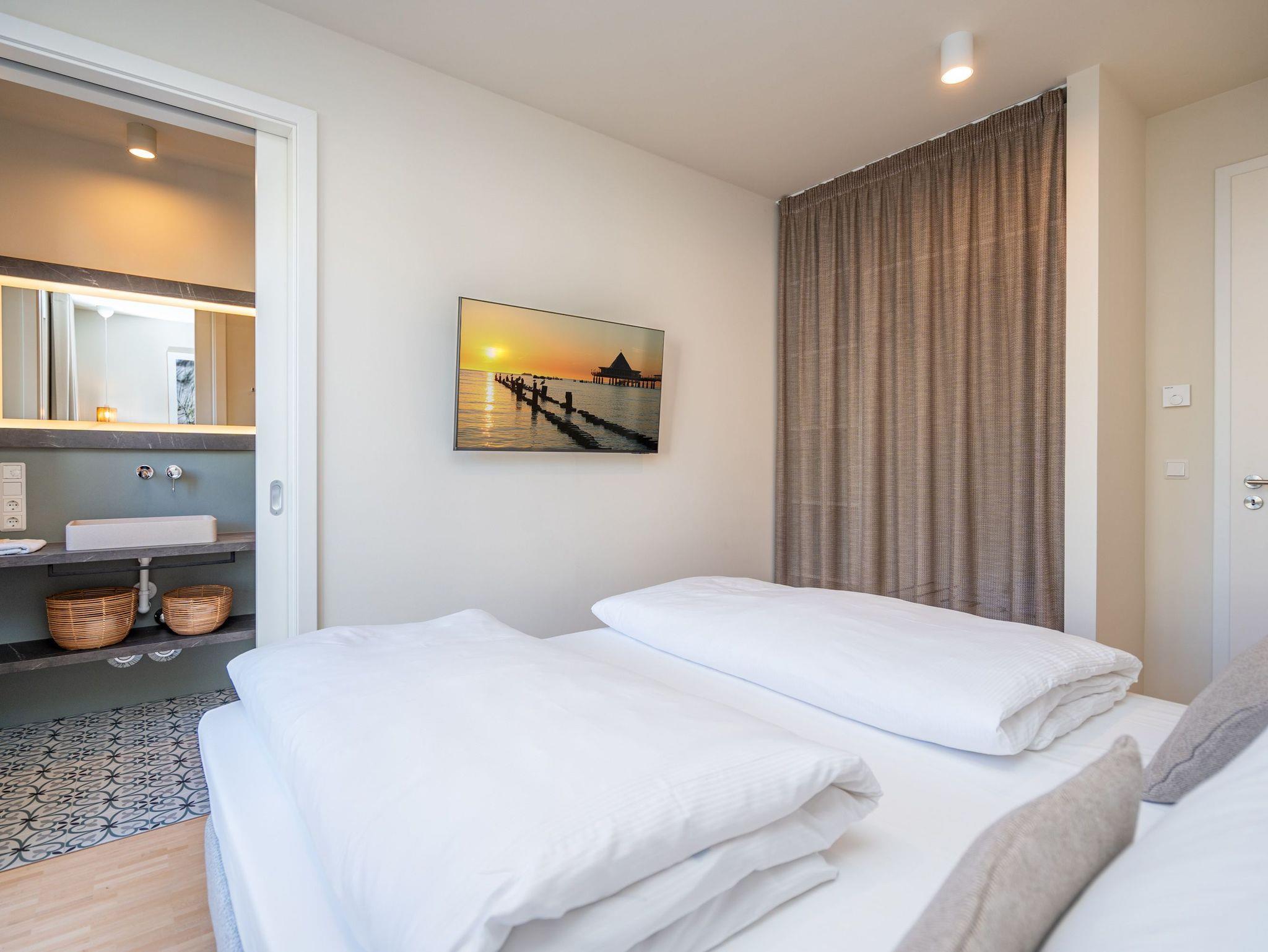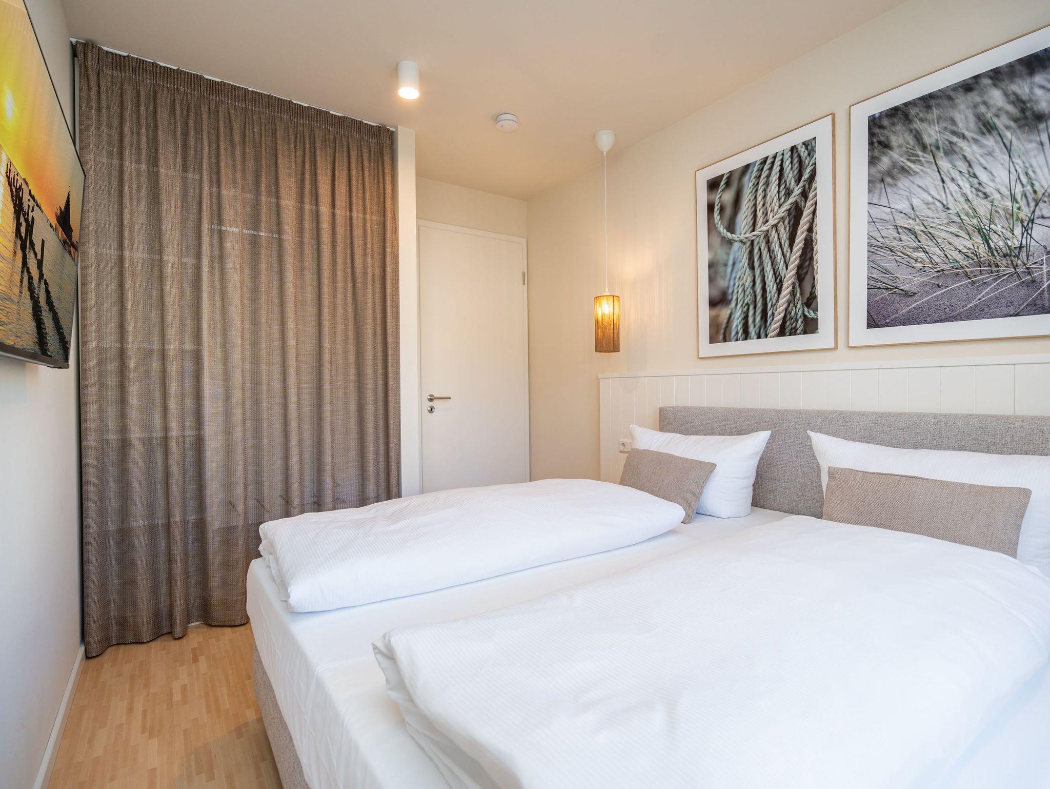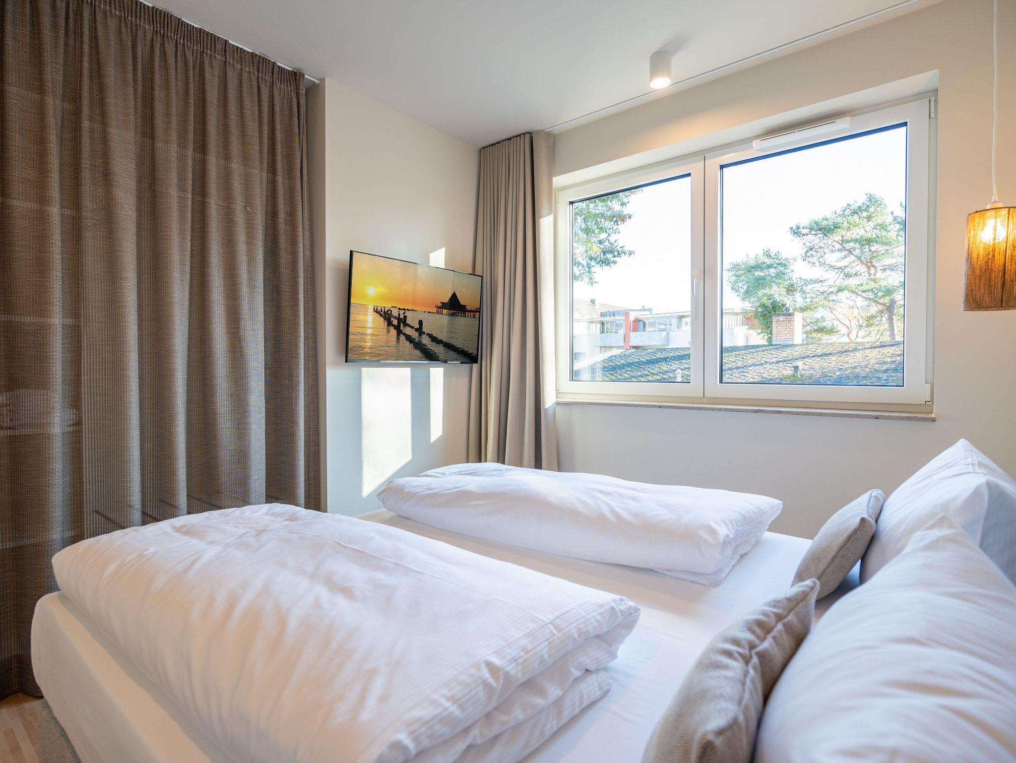 Herzlich willkommen im Quartier Maxim! Das großzügige 3-Raum-Appartement Nr. 6 im ersten Obergeschoss bietet mit 68 m² Platz für bis zu vier Personen und vereint modernen Komfort mit stilvoller Einrichtung. Der helle Wohnbereich ist offen gestaltet und verfügt über eine voll ausgestattete Küche mit kleinem Backofen (inkl. Mikrowellenfunktion), einem 4-Platten-Induktionskochfeld, Spülmaschine, Kühlschrank mit Gefrierfach und einer Nespresso-Kapselmaschine ? ideal für gemütliche Kochabende. Am angrenzenden Essplatz finden vier Personen bequem Platz. In der Sitzecke laden ein großer 55-Zoll-Flachbild-TV und ein Kaminofen zu entspannten Stunden ein. Vom Wohnbereich aus gelangen Sie auf den etwa 8 m² großen Süd-Balkon, der viel Sonnenlicht und eine frische Brise bietet. Die zwei komfortablen Schlafzimmer sind jeweils mit einem Boxspring-Doppelbett (1,80 m x 2,00 m), einem Kleiderschrank und einem zusätzlichen Flachbild-TV ausgestattet und garantieren eine angenehme Nachtruhe. Das Appartement verfügt über zwei Bäder: Ein innenliegendes Badezimmer mit Dusche, Waschtisch und finnischer Sauna für entspannte Wellness-Momente und ein Masterbad, das direkt an das zweite Schlafzimmer angrenzt. Dieses Tageslichtbad ist ebenfalls mit Dusche, Waschtisch und WC ausgestattet und bietet zusätzlichen Komfort. Praktische Extras wie ein Waschtrockner im Flureinbauschrank, kostenfreies WLAN und ein abschließbarer Kellerraum für Fahrräder machen Ihren Aufenthalt besonders angenehm. Zudem steht Ihnen ein Stellplatz in der Tiefgarage zur Verfügung. Genießen Sie Ihren Aufenthalt im stilvollen Quartier Maxim.