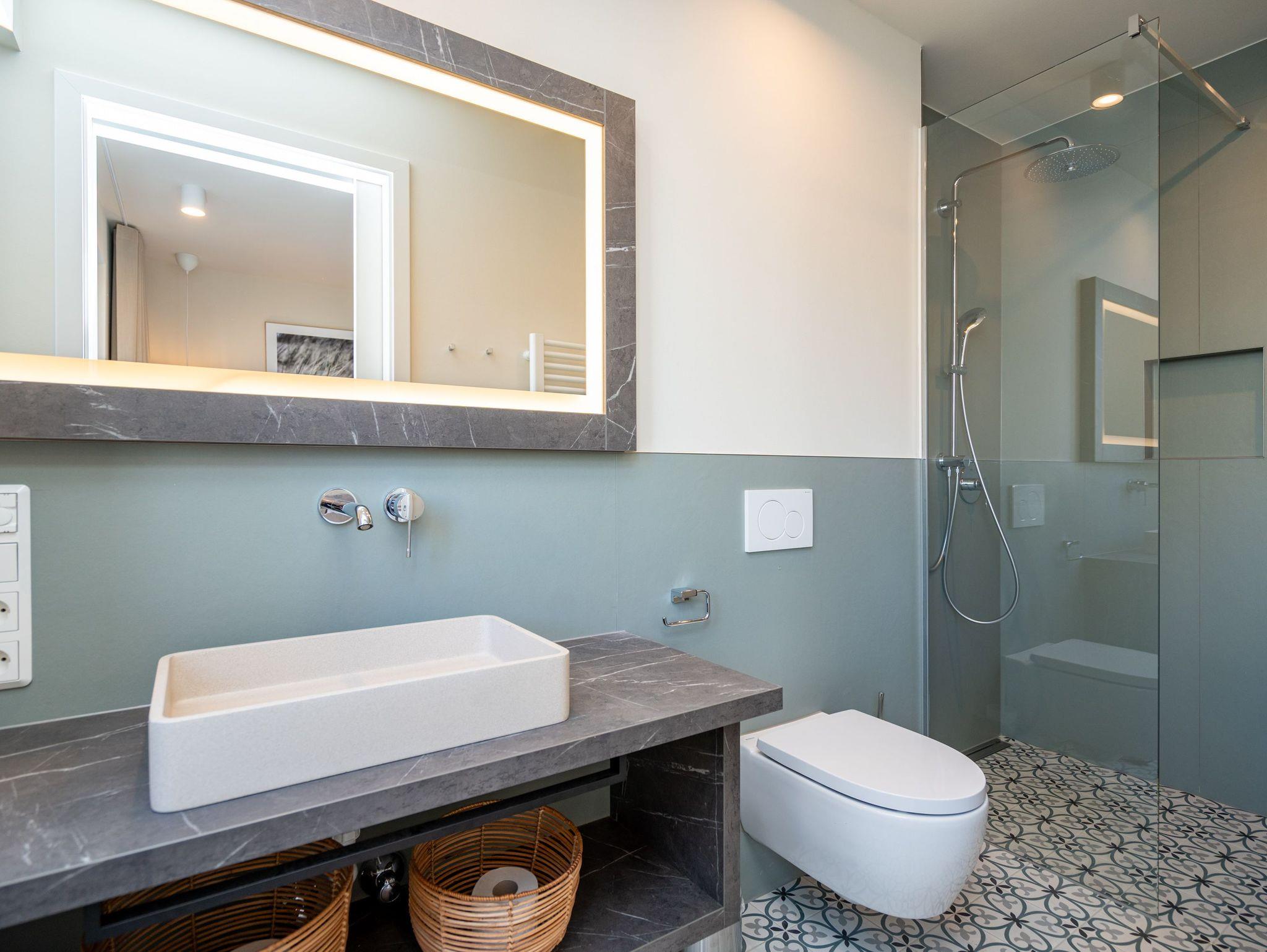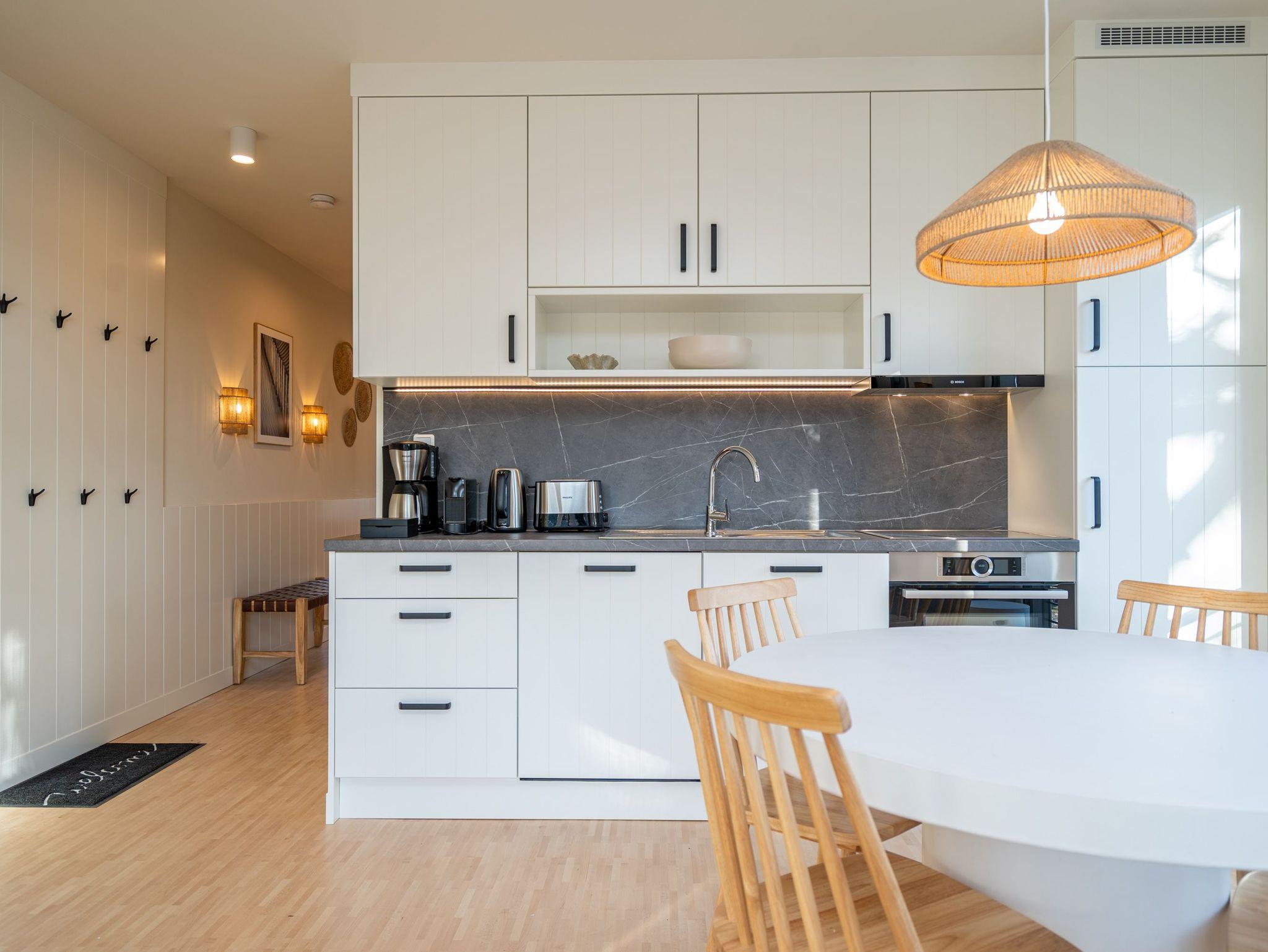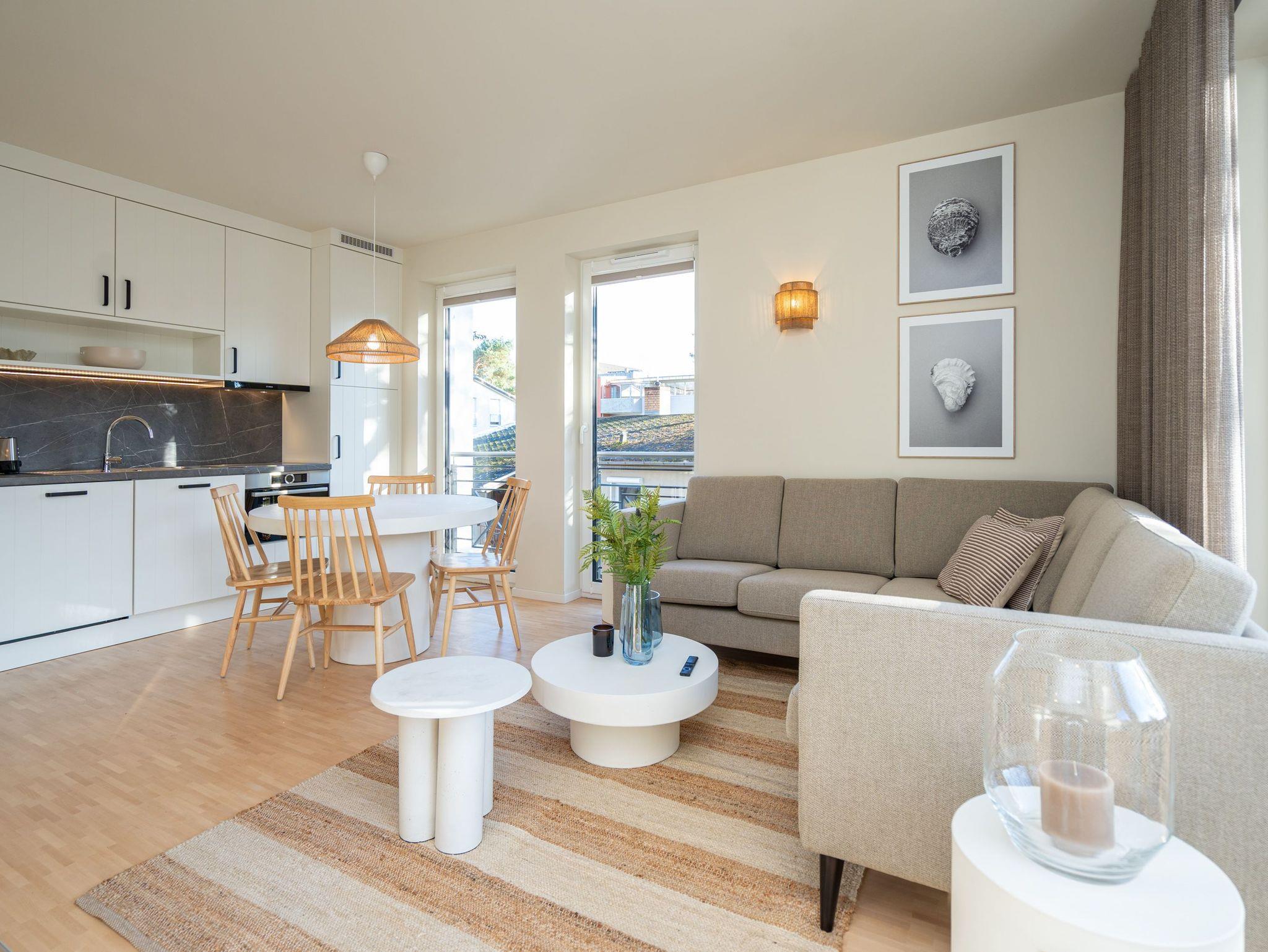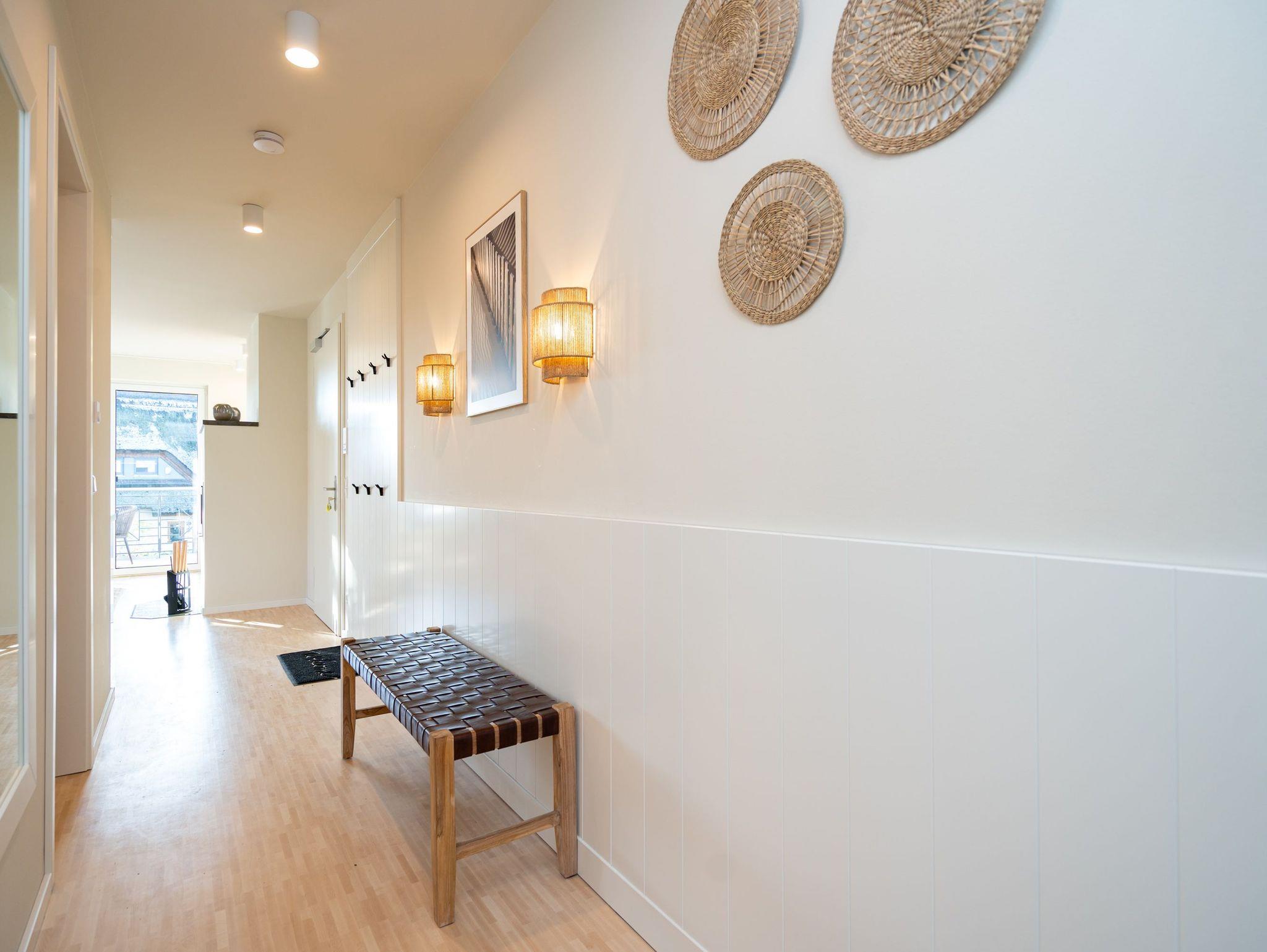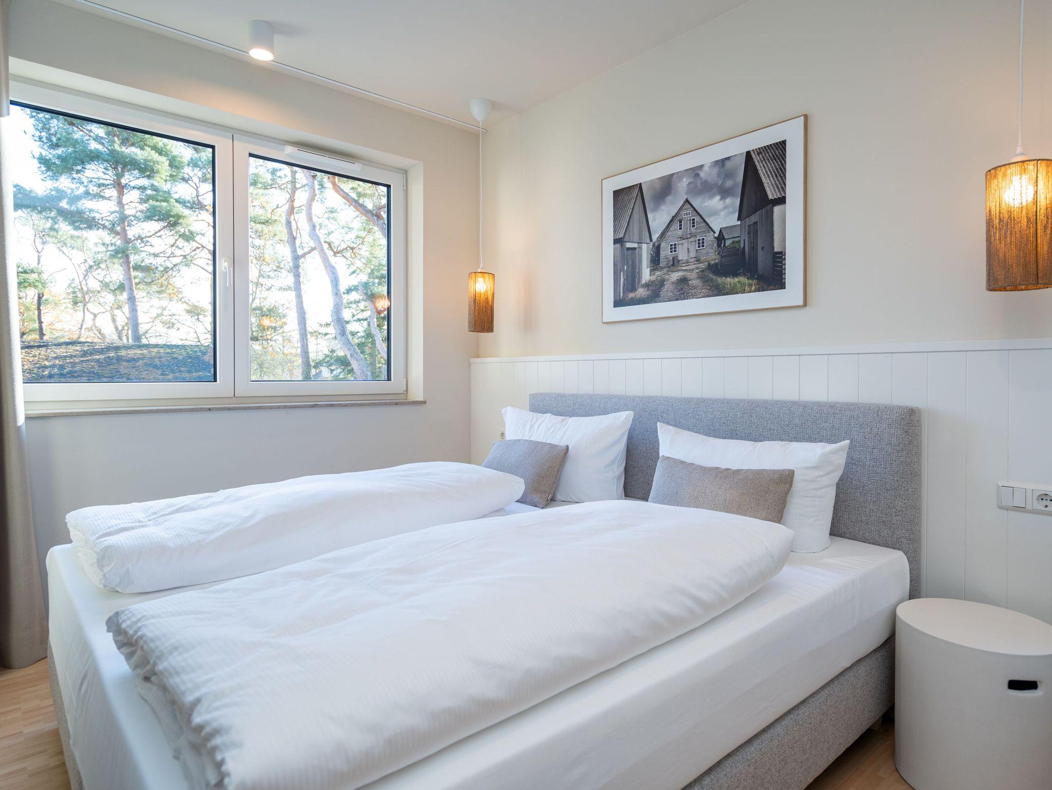 Herzlich willkommen im Quartier Maxim! Das großzügige 3-Raum-Appartement Nr. 6 im ersten Obergeschoss bietet mit 68 m² Platz für bis zu vier Personen und vereint modernen Komfort mit stilvoller Einrichtung. Der helle Wohnbereich ist offen gestaltet und verfügt über eine voll ausgestattete Küche mit kleinem Backofen (inkl. Mikrowellenfunktion), einem 4-Platten-Induktionskochfeld, Spülmaschine, Kühlschrank mit Gefrierfach und einer Nespresso-Kapselmaschine ? ideal für gemütliche Kochabende. Am angrenzenden Essplatz finden vier Personen bequem Platz. In der Sitzecke laden ein großer 55-Zoll-Flachbild-TV und ein Kaminofen zu entspannten Stunden ein. Vom Wohnbereich aus gelangen Sie auf den etwa 8 m² großen Süd-Balkon, der viel Sonnenlicht und eine frische Brise bietet. Die zwei komfortablen Schlafzimmer sind jeweils mit einem Boxspring-Doppelbett (1,80 m x 2,00 m), einem Kleiderschrank und einem zusätzlichen Flachbild-TV ausgestattet und garantieren eine angenehme Nachtruhe. Das Appartement verfügt über zwei Bäder: Ein innenliegendes Badezimmer mit Dusche, Waschtisch und finnischer Sauna für entspannte Wellness-Momente und ein Masterbad, das direkt an das zweite Schlafzimmer angrenzt. Dieses Tageslichtbad ist ebenfalls mit Dusche, Waschtisch und WC ausgestattet und bietet zusätzlichen Komfort. Praktische Extras wie ein Waschtrockner im Flureinbauschrank, kostenfreies WLAN und ein abschließbarer Kellerraum für Fahrräder machen Ihren Aufenthalt besonders angenehm. Zudem steht Ihnen ein Stellplatz in der Tiefgarage zur Verfügung. Genießen Sie Ihren Aufenthalt im stilvollen Quartier Maxim.