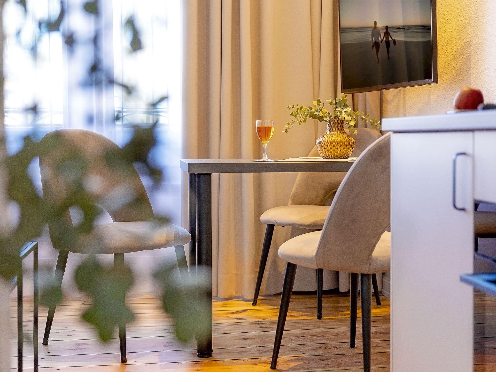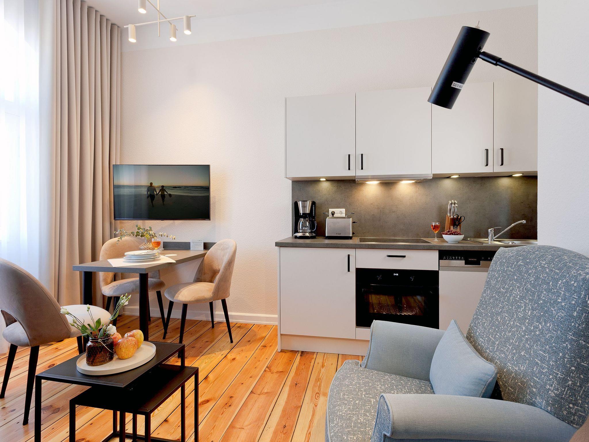 Unser Appartement 10 im 2. Obergeschoss wurde im Winter 2024 - 25 renoviert und erstrahlt nun in neuem Glanz. Mit ca. 33 qm bietet das Appartement alles, was es für einen erholsamen Aufenthalt mit bis zu 3 Personen benötigt. Die neue, moderne Single-Küchenzeile ist vollausgestattet mit einem Cerankochfeld, Kühlschrank mit Gefrierfach, Backofen mit integrierter Mikrowelle, Spülmaschine sowie Kaffeemaschine, Wasserkocher und Toaster.