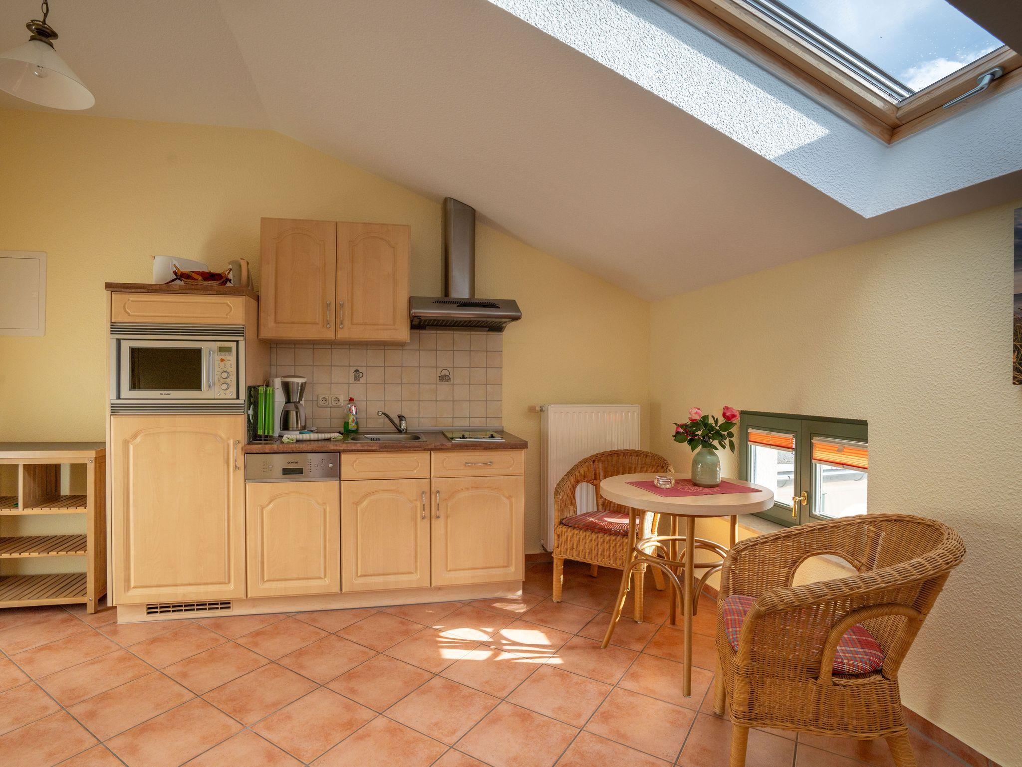Das 31 qm große Einraumappartement im Dachgeschoss verfügt über ein Doppelbett, Sitzgelegenheit, TV und Radio sowie eine Küchenzeile mit Geschirrspüler,