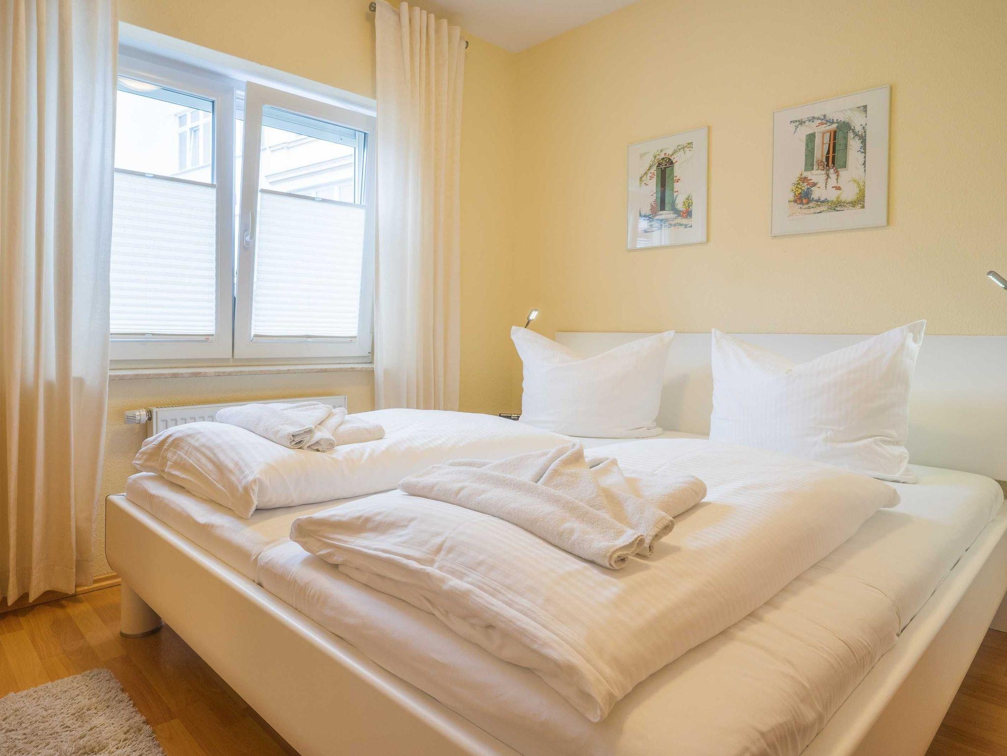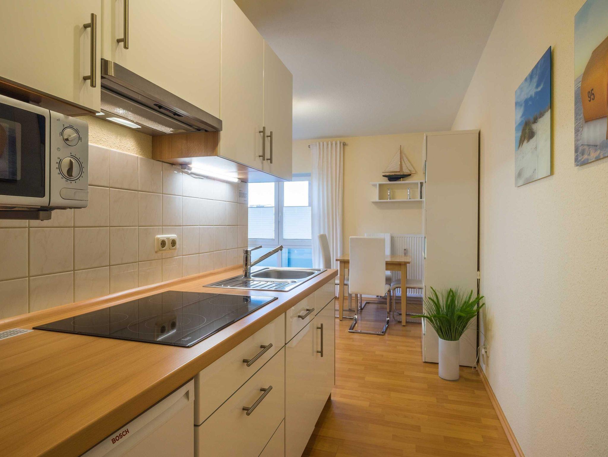 Der offene Wohnbereich mit moderner Küche ist voll ausgestattet, unter anderem mit einem Ceran-Kochherd, Mikrowelle, Geschirrspüler und vielem mehr. Im Wohnzimmer finden Sie einen Flachbild-TV, CD-Player, Radio sowie einen Esstisch mit vier Stühlen. Für zusätzliche Schlafgelegenheiten steht eine bequeme ausklappbare Schlafcouch (180x200 cm) bereit, ideal für die dritte und vierte Person. Im Schlafzimmer erwartet Sie ein großes Doppelbett und ein geräumiger Kleiderschrank, der viel Platz für Ihre Sachen bietet. Das Badezimmer ist mit einer Dusche, WC und Duschhocker ausgestattet und bietet ausreichend Ablagemöglichkeiten. Für Familien mit kleinen Kindern steht ein Kinderreisebett (gegen Gebühr von 15 €) zur Verfügung, welches Sie bitte spätestens einen Tag vor Anreise vorbestellen. Ein kostenfreier Kinderhochstuhl ist ebenfalls vorhanden. WLAN ist in der gesamten Wohnung kostenlos nutzbar, sodass Sie jederzeit verbunden bleiben können. Für Ihren PKW steht ein eigener Stellplatz in der Tiefgarage (Einfahrtshöhe 2 m) bereit. Fahrräder können in einem Radständer auf dem Grundstück abgestellt werden ? eine abschließbare Abstellmöglichkeit ist leider nicht vorhanden.
