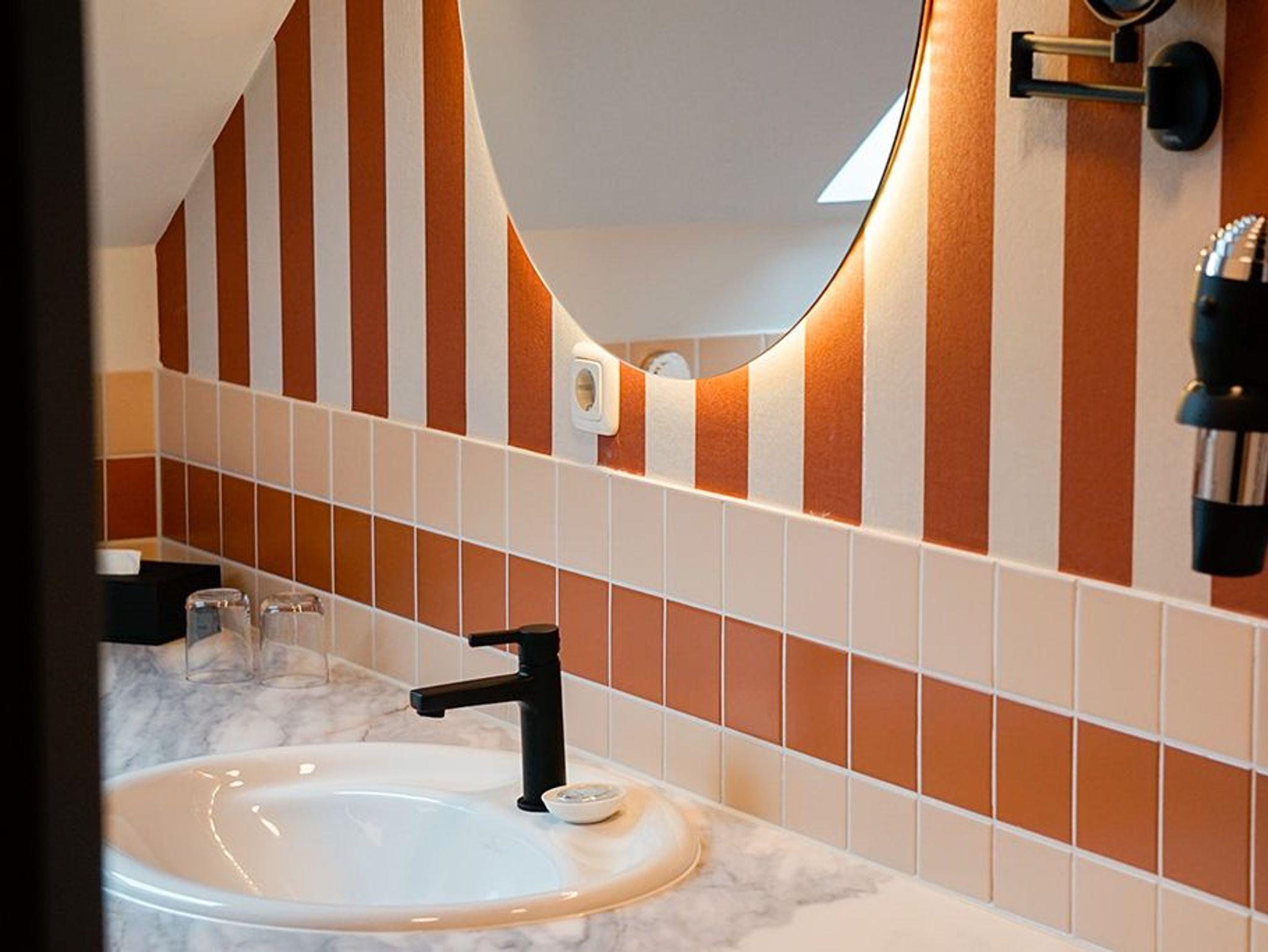 Unsere Badezimmer verfügen über Waschtisch, WC und Dusche.