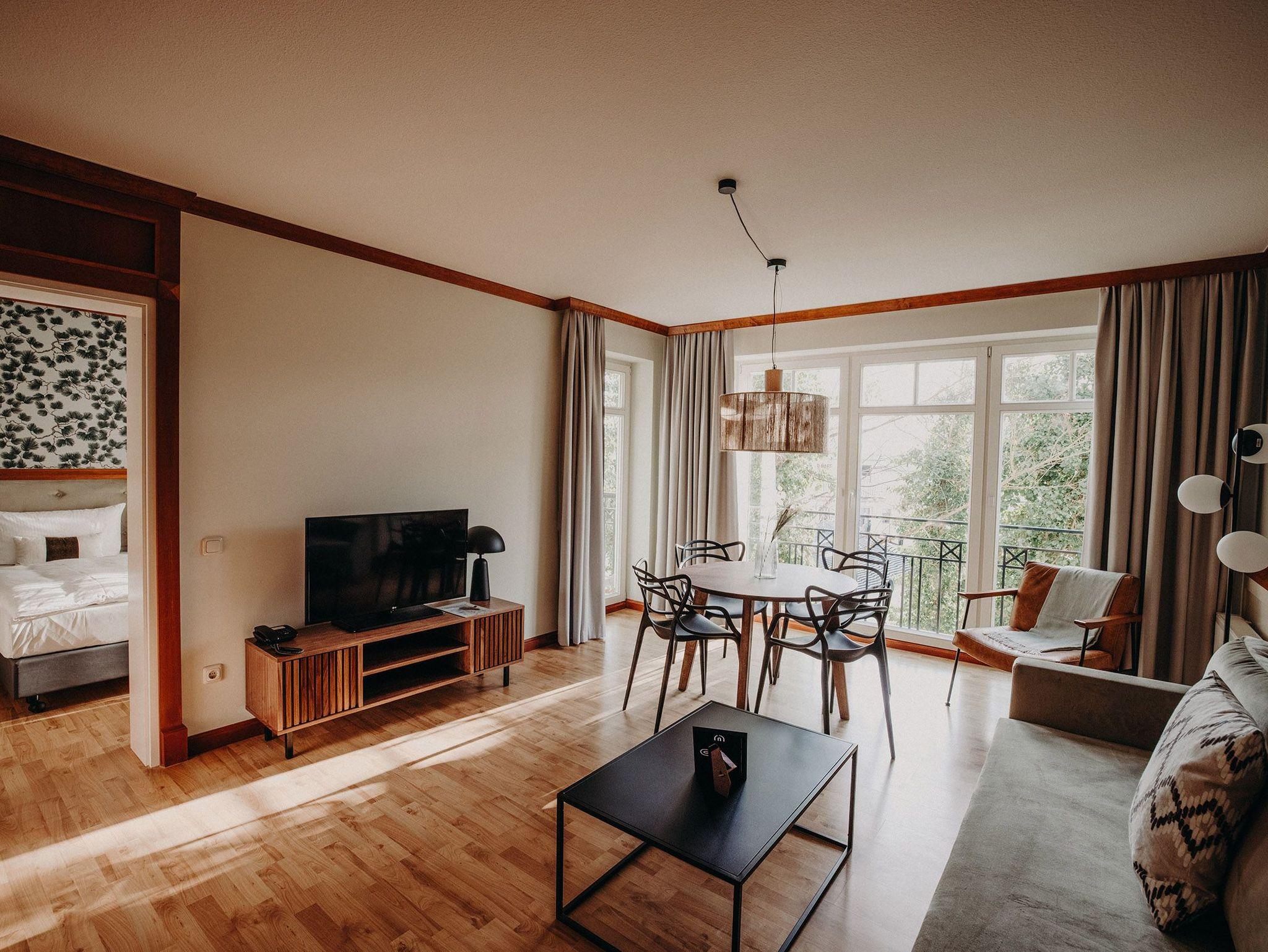 Alle Apartments des Typs Suite (ca. 56-65 m²) liegen in der 3. Etage im Neubau der Villa Usedom und haben eine wunderschöne Aussicht zum Teil mit Meerblick. Das Einrichtungskonzept ist harmonisch abgestimmt und hat einen individuellen Innenausbau mit Echtholz. Die Inneneinrichtung zeichnet sich durch eine dezente Farbgebung aus, die in jeder Jahreszeit ein Höchstmaß an Wohlgefühl vermittelt. Das exklusive 3-Raum-Domizil eignet sich für maximal 4 Personen, wenn die Schlafcouch im Wohnzimmer mit genutzt wird. Ein Babybett kann jederzeit untergebracht werden. Viel Platz zum Entspannen bietet der offene Wohn-Essbereich mit Couch und Sessel.