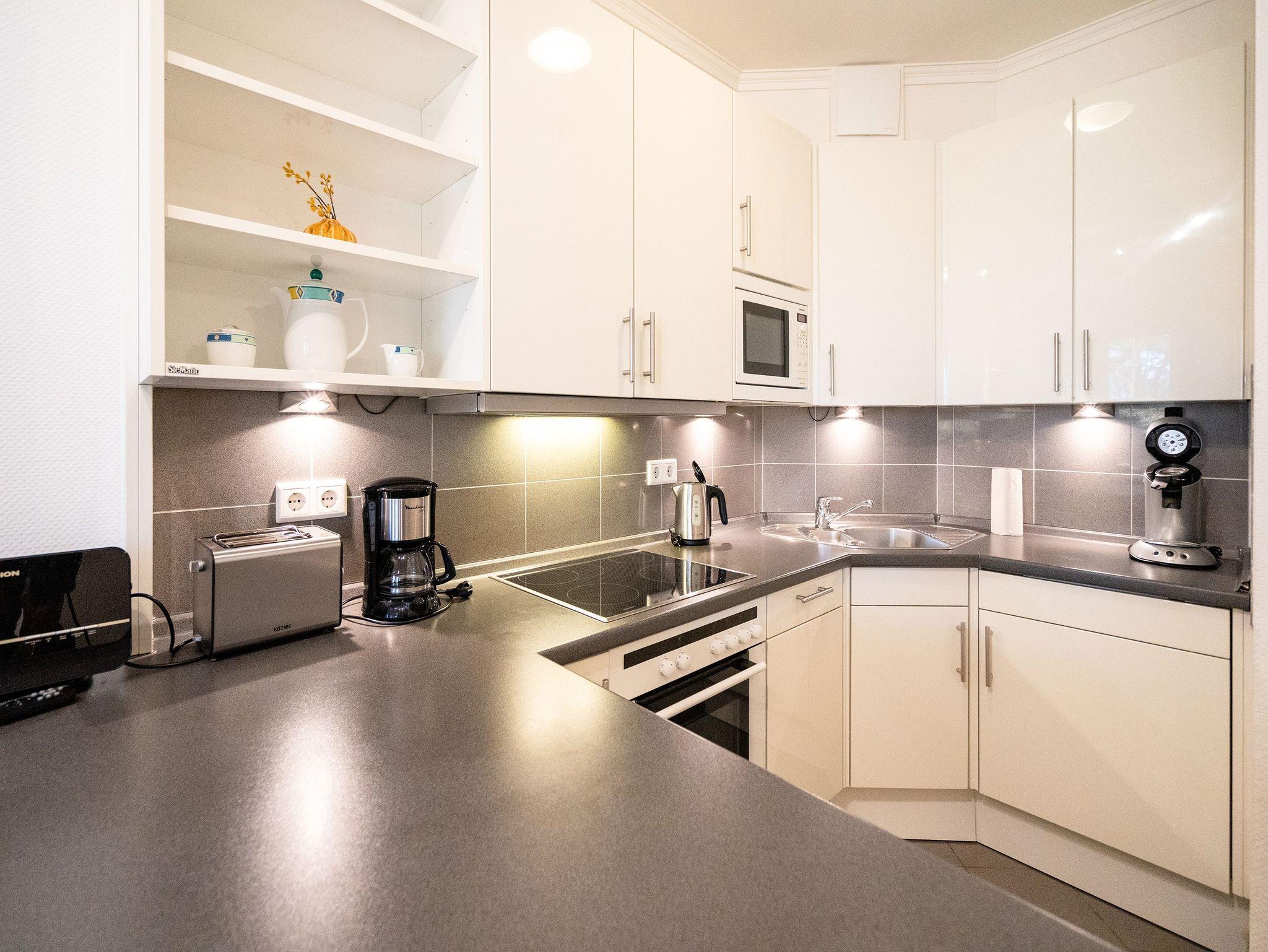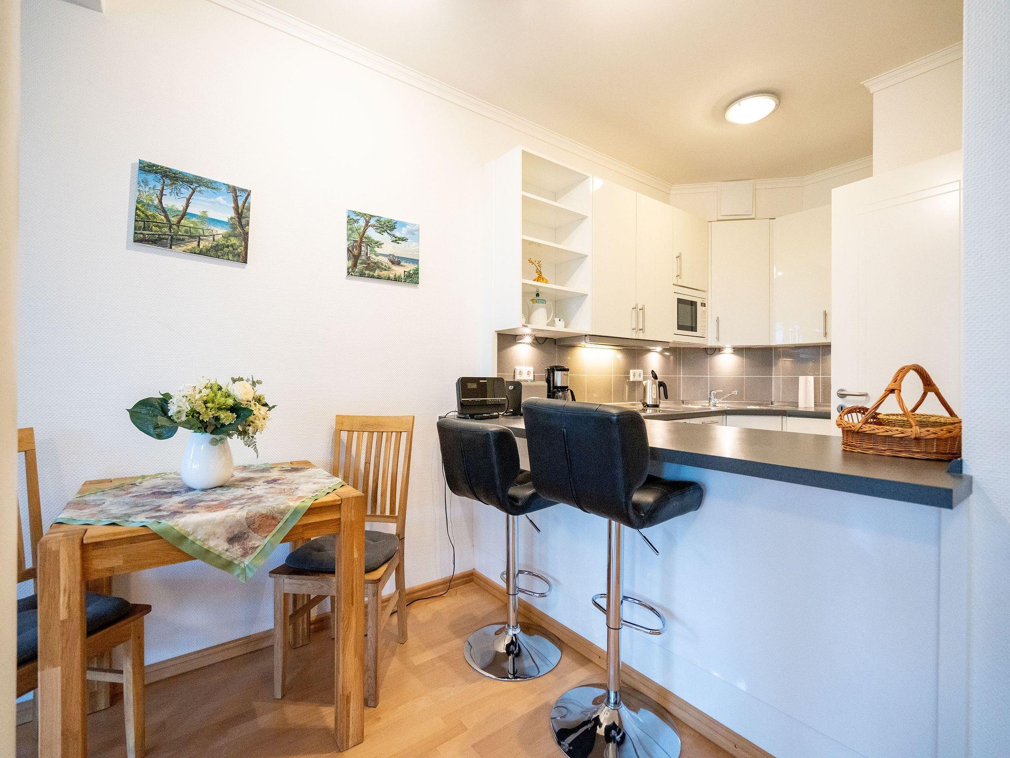 Willkommen in unserer schönen, lichtdurchfluteten 1-Raum-Ferienwohnung direkt an der Promenade von Heringsdorf, perfekt für 2 Personen und befindlich in der 1. Etage. Treten Sie ein in den kombinierten Wohn- und Schlafbereich, der mit einem bequemen Boxspringbett (1,80m x 2,00m), einer gemütlichen Sitzgruppe mit Flat-TV sowie einem CD- und DVD-Player ausgestattet ist. Die offene und komplett ausgestattete Küche verfügt über alles, was Sie benötigen, einschließlich einer zusätzlichen Senseo-Kapselmaschine. Ein Essplatz am Tresen sowie ein separater Essbereich laden zum Genießen Ihrer Mahlzeiten ein. Das Badezimmer ist mit einer Dusche und einem WC ausgestattet. Genießen Sie die frische Luft auf dem großzügigen und überdachten Balkon (ca. 12 qm) mit Blick zur Seeseite. Für zusätzlichen Komfort sorgt eine Fußbodenheizung, und ein PKW-Außenstellplatz (Nr. 17) steht Ihnen direkt am Haus zur Verfügung. Kostenloses WLAN ist ebenfalls verfügbar. Als besonderes Highlight bieten wir Ihnen von April bis Ende September (abhängig von der Witterung) einen kostenlosen Strandkorb am Strand an. Erleben Sie erholsame Tage in unserer charmanten Ferienwohnung und lassen Sie sich von der Schönheit der Region verzaubern.