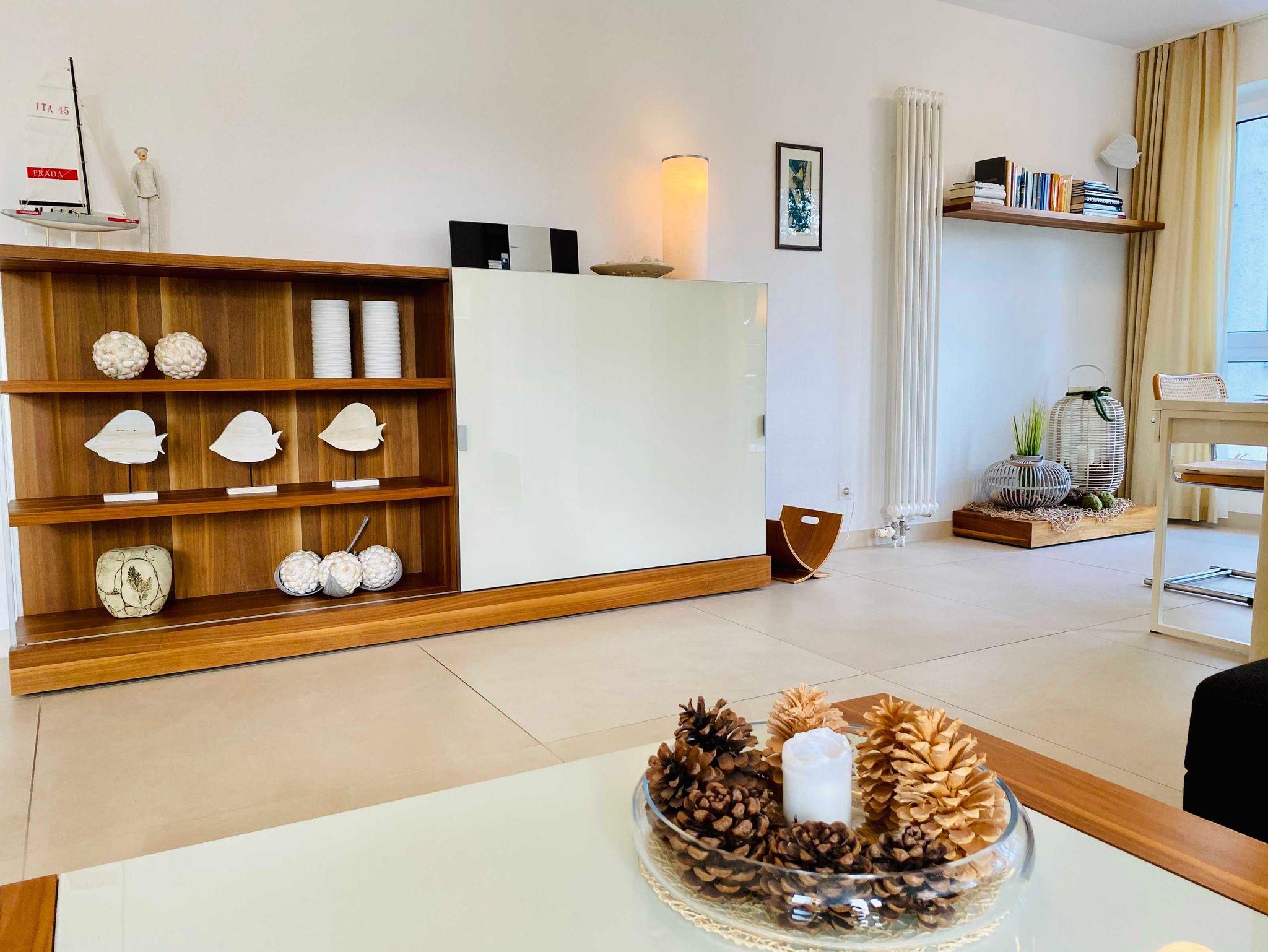 Die sehr stilvolle und hochwertig eingerichtete 3-Raumferienwohnung befindet sich im 1.OG der Villa und ist mit dem Aufzug erreichbar. Sie besteht aus einem modern eingerichteten Wohnbereich mit Couch, TV, Musikanlage und Esstisch. Vom Wohnzimmer gelangen Sie in die separater Küche mit Geschirrspüler, Mikrowelle, Herd & Backofen.