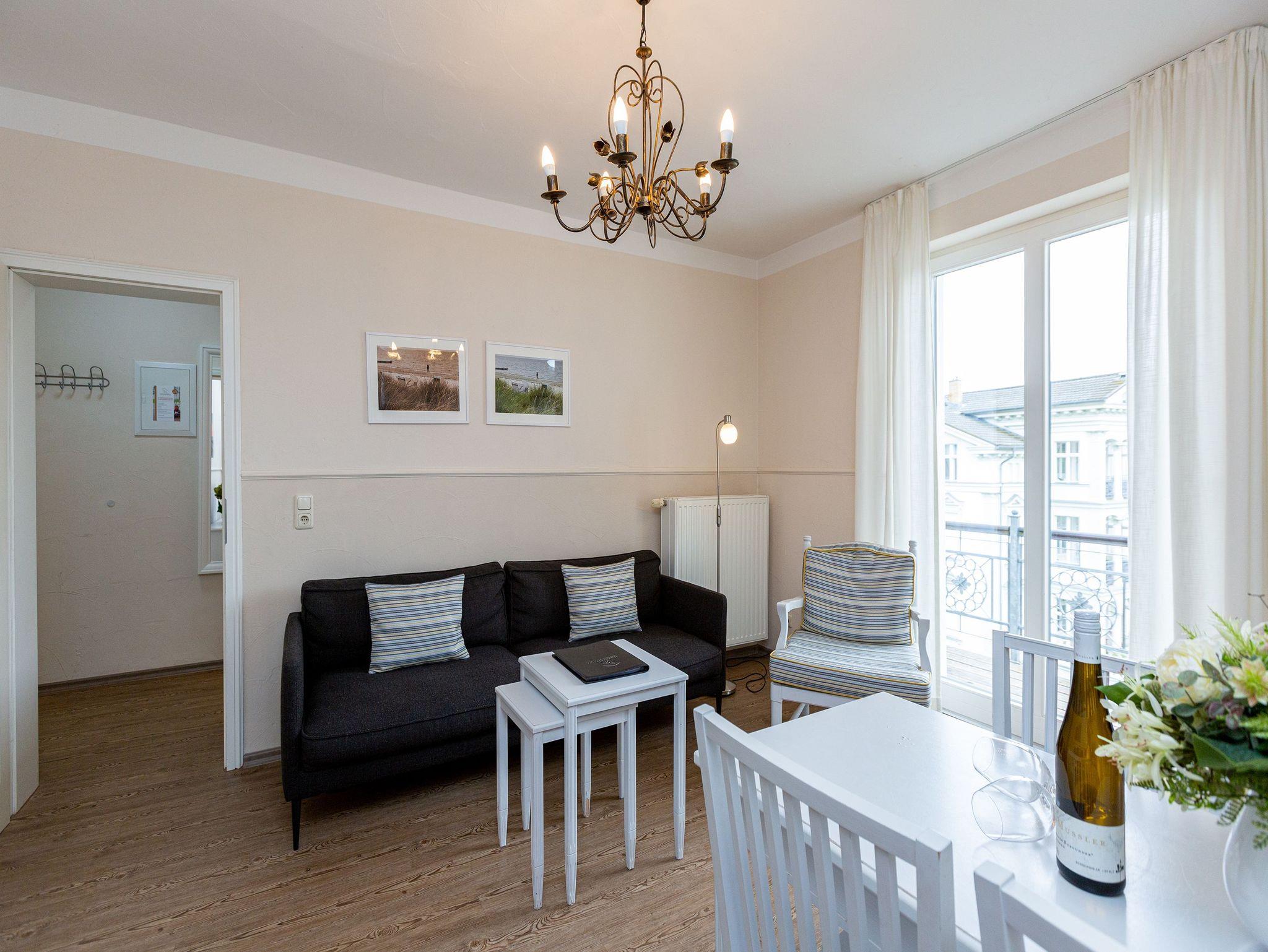 Nur einen Steinwurf von der Ostsee entfernt befindet sich dieses exklusive, 50 Quadratmeter große Urlaubsparadies, aus dem Sie garantiert nicht wieder abreisen wollen. Denn es eignet sich ideal, um abzuschalten und neue Energie zu tanken. Die drei Zimmer bieten Platz für bis zu 3 Erwachsene [&] 1 Kind bis 15 Jahre. Genießen Sie den Ausblick auf die schönen Villen um sie herum. Der kleine Balkon eignet sich dafür bestens. Die Räume sind hoch und hell und die geschmackvolle Einrichtung aus erlesenen Vintage-Möbeln verleiht dem Urlaubswohntraum einen mondänen Charme. An das geräumige Wohn-Esszimmer mit einem schönen Esstisch und Flat-TV ist die offene Küche angeschlossen. Hier finden Sie alles Nötige zum Kochen und Essen ? vom Toaster bis zur Kaffeetasse. In den beiden Schlafzimmern warten zwei Boxspringdoppelbetten darauf, Ihnen Erholung auch im Schlaf zu schenken. Große Schränke bieten viel Platz für die Urlaubsgarderobe. Das Tageslichtbad verfügt über eine Dusche, WC und einen Waschtisch. Sie benötigen Internet? Das WLAN Netz im Haus kann kostenfrei genutzt werden. Damit Sie sich um nichts kümmern müssen, haben wir die Betten bei Anreise bezogen und Handtücher liegen für Sie bereit. Das Auto können Sie auf dem Stellplatz am Haus parken.