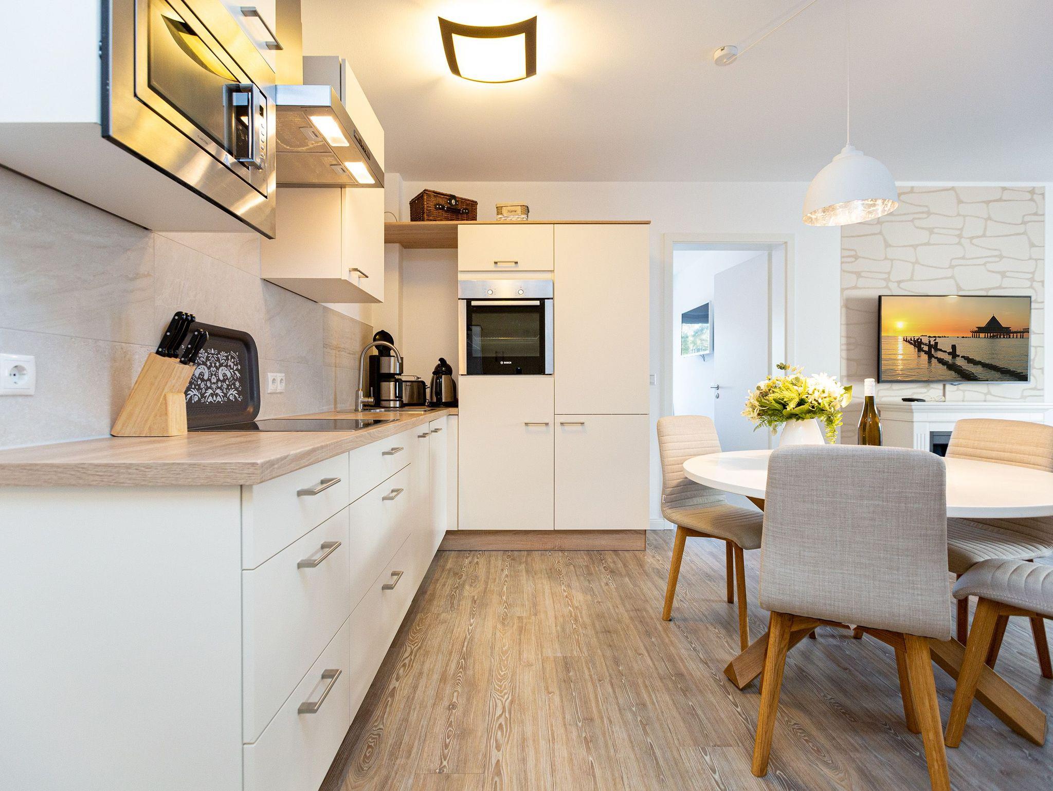 Erholen Sie sich in dieser, im Landhausstil gestalteten, 3-Raum-Ferienwohnung (67 qm) für 2 bis 4 Personen und ein Kleinkind (bis 2 Jahre im Kinderreisebett). Der Eingangsbereich mit Flurgarderobe geht über in die offene, komplett ausgestattete Küche mit rundem, schönen Essplatz. Hier schließt sich der gemütliche Wohnbereich an. Die bequeme Couch und der Flat-TV sind für entspannte TV-Abende bestens geeignet. Ein moderner Elektrokamin sorgt per Knopfdruck für eine kuschlige Wohlfühlatmosphäre. Zwei Schlafzimmer mit bequemen Doppelboxspringbetten (1,80m x 2,00m), Flat-TV (1x mit integriertem DVD-Player) und jeweils geräumigen Schrank sorgen für erholsamen Schlaf. Auf dem Süd-Westbalkon (Zugang vom Wohnbereich und aus einem Schlafzimmer) genießen Sie in den Nachmittags- und Abendstunden die Usedomer Sonne. Ein großes Duschbad mit WC ergänzt das Domizil. Für Ihren Komfort sind die Betten bei der Anreise bezogen und Handtücher liegen bereit. Das WLAN-Netz im Haus kann kostenfrei genutzt werden. Ein PKW-Stellplatz steht in der in der Tiefgarage (max. Einfahrtshöhe 1,85 m) zur Verfügung.