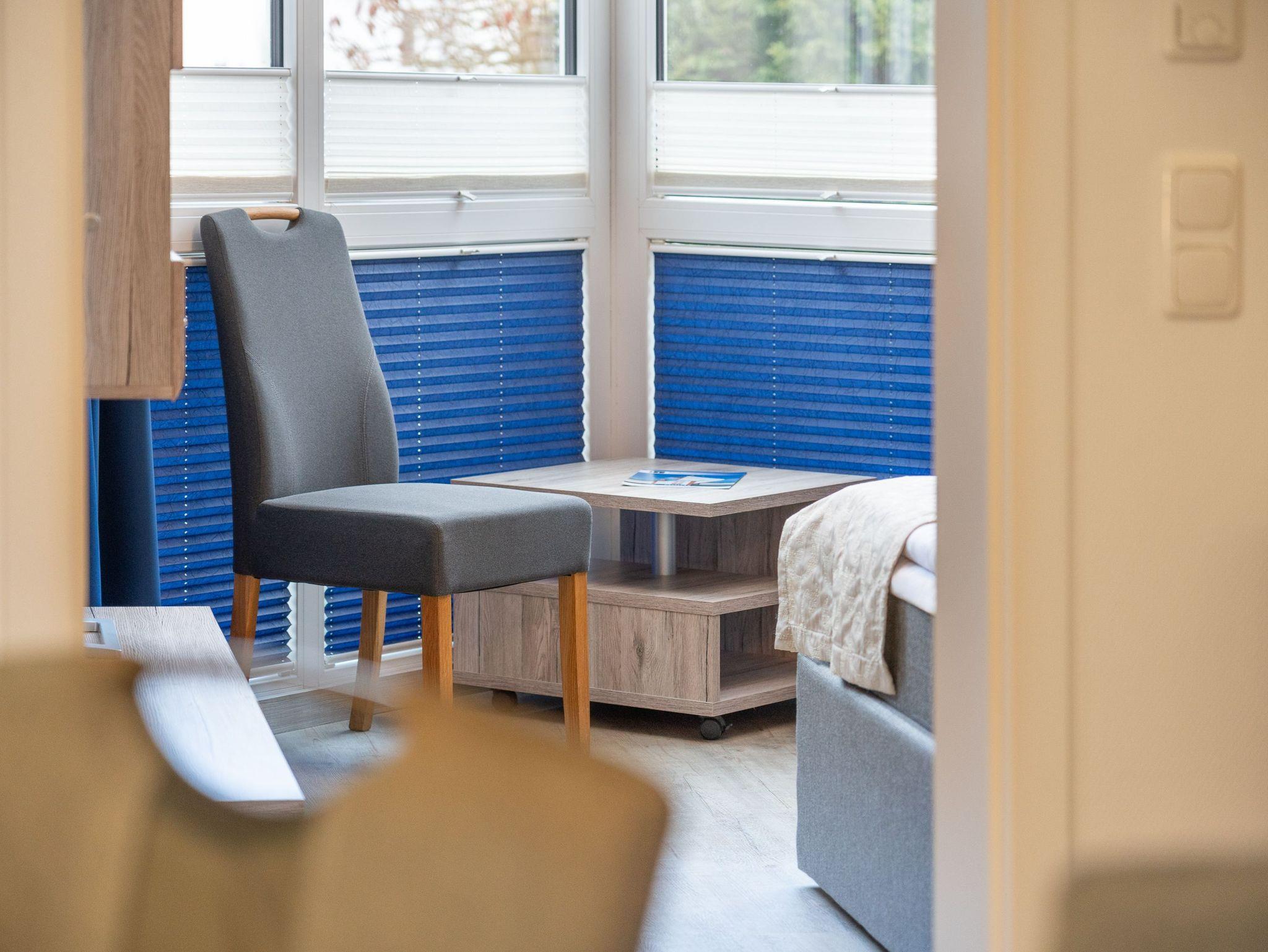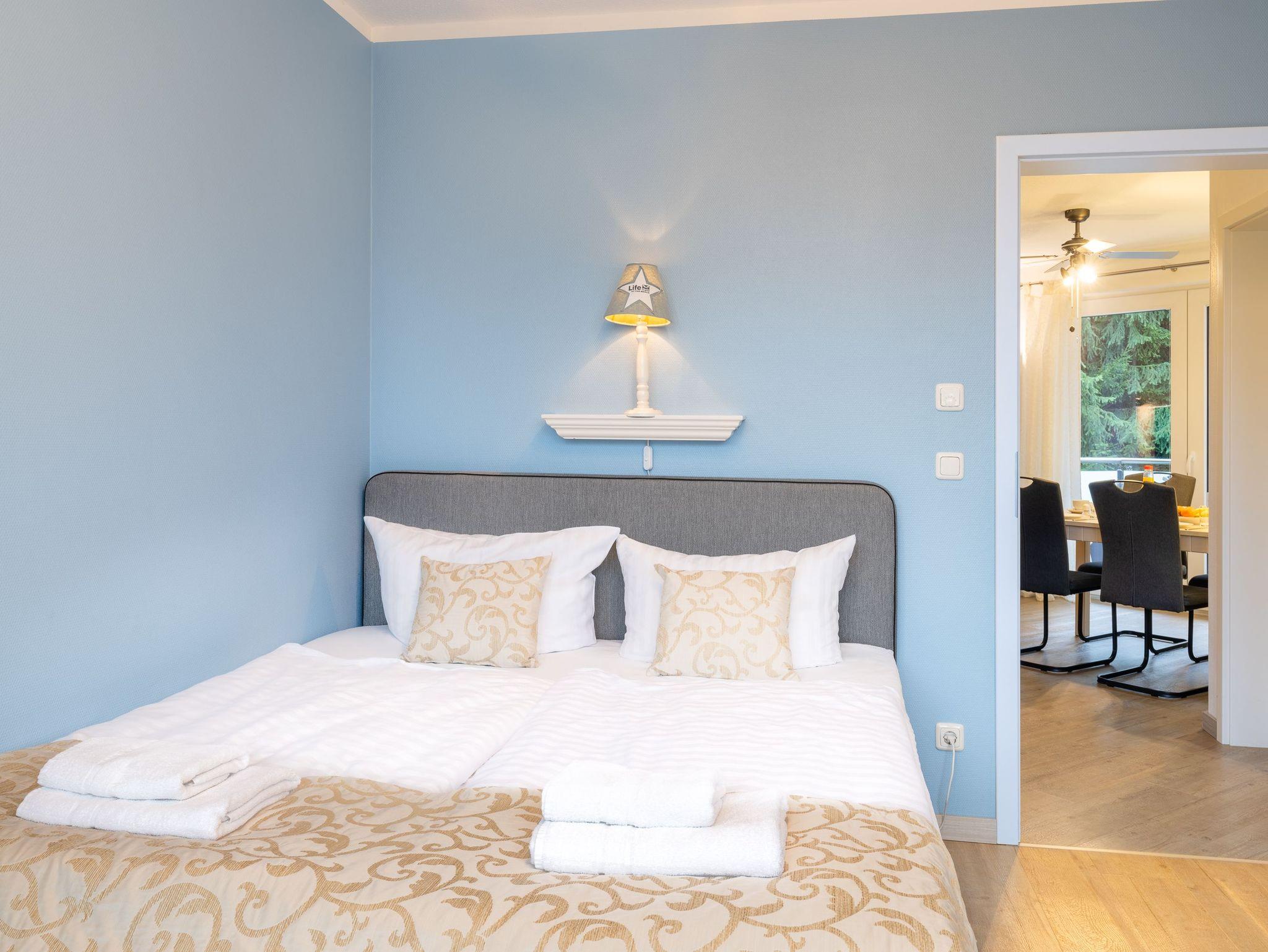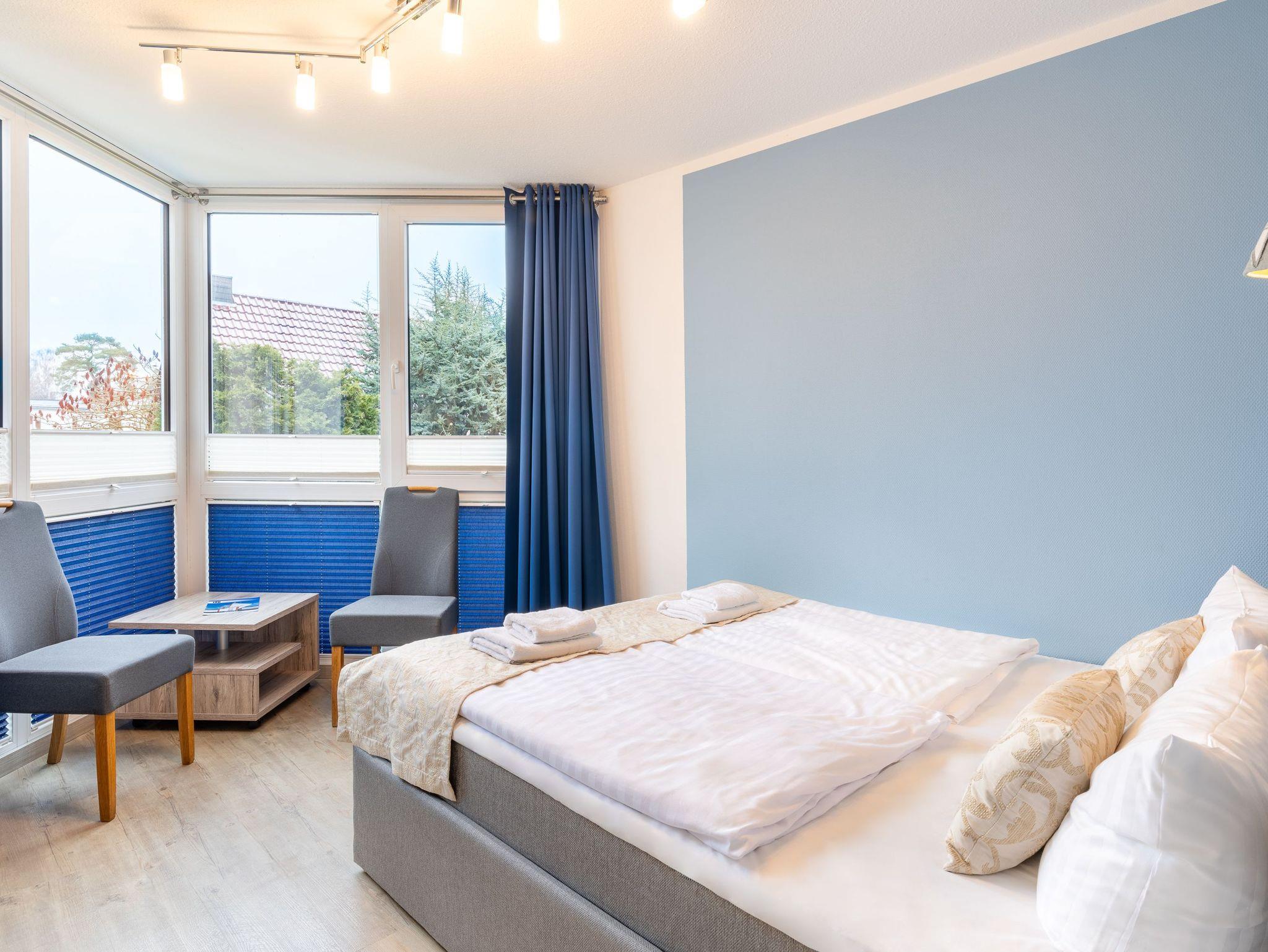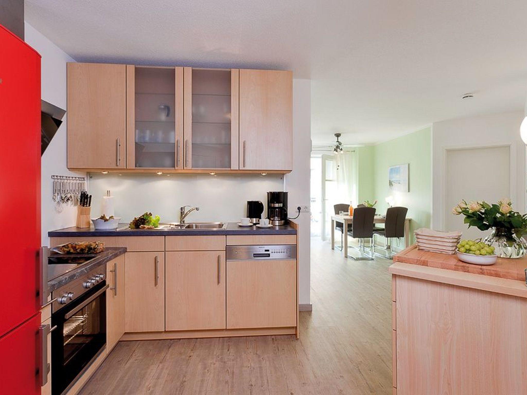 Das großzügige 3-Raum-Appartement bietet auf 67m² Raum für einen erholsamen Urlaub mit bis zu vier Personen. Der freundlich gestaltete Wohnbereich verleiht mit einer bequemen Couch und dem dazugehörigen Sessel genau die Gemütlichkeit, auf die man im Urlaub keinesfalls verzichten möchte. Die offene Küche lässt Dank Kühlschrank mit Gefrierfach, Ceran-Kochfeld, Backofen, Mikrowelle, Geschirrspülmaschine, Kaffeemaschine, Toaster und Wasserkocher u. v. m. keine Wünsche offen. Der Essplatz ist perfekt in den Wohnbereich integriert und bietet Gelegenheit für ein gemeinsames Menü. Auf dem angrenzenden Süd-West-Balkon können Sie einen erlebnisreichen Urlaubstag bei einem Glas Wein oder einem Spieleabend ausklingen lassen.