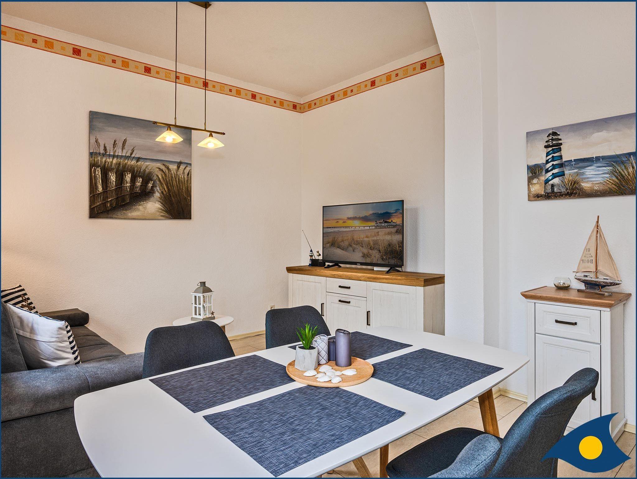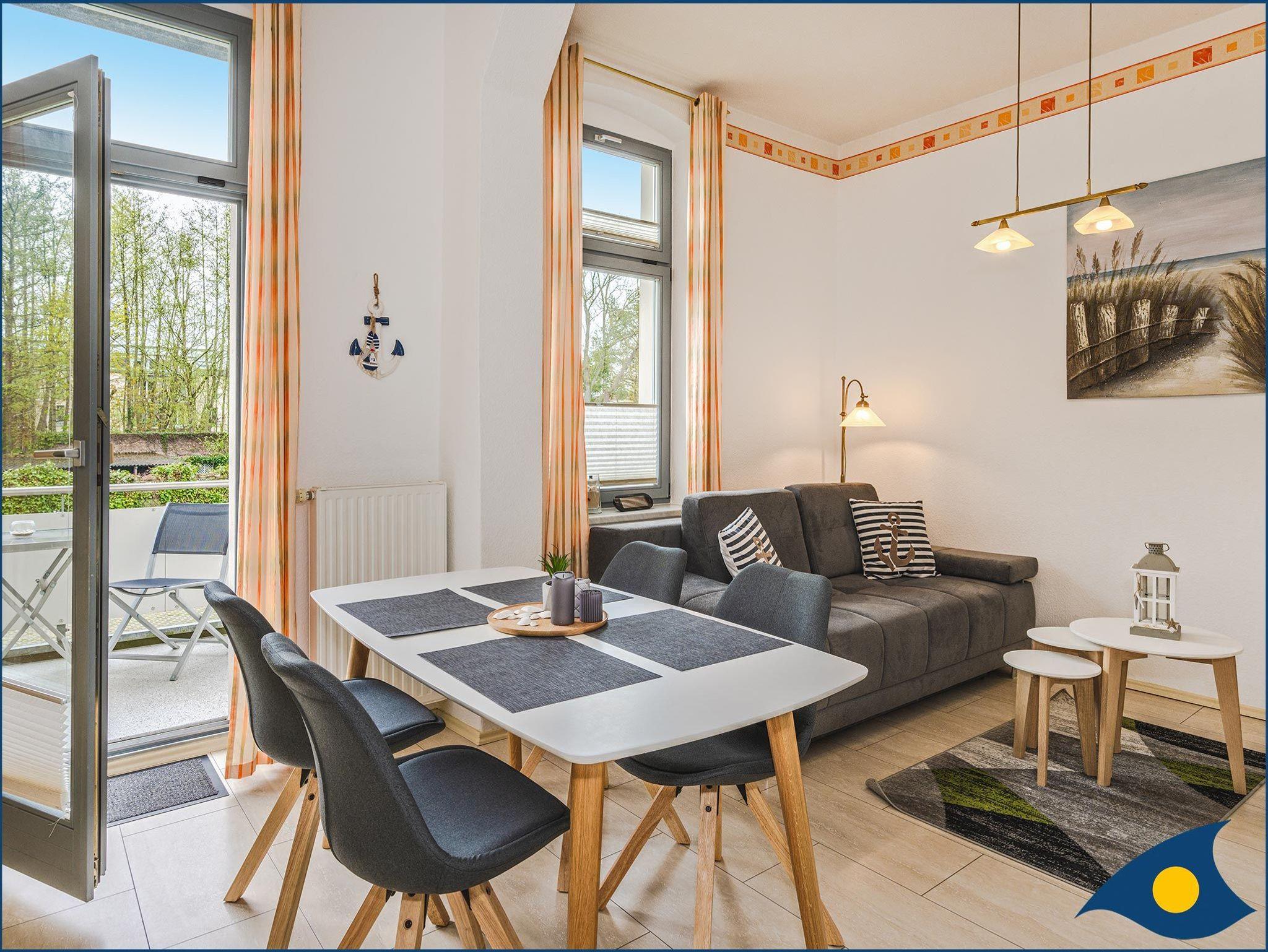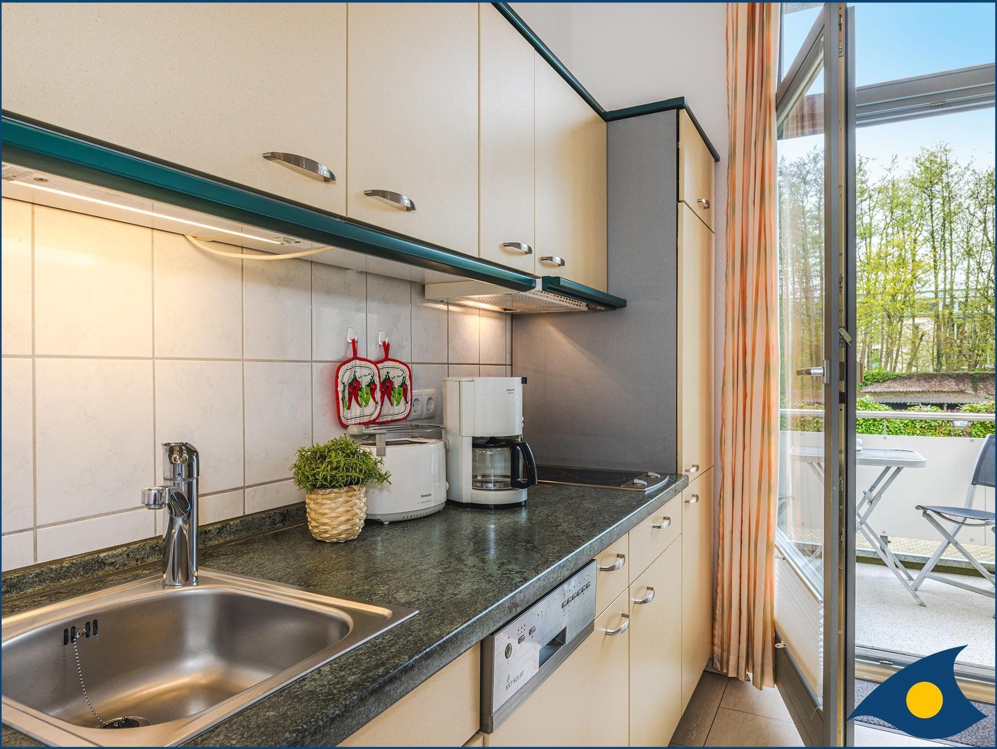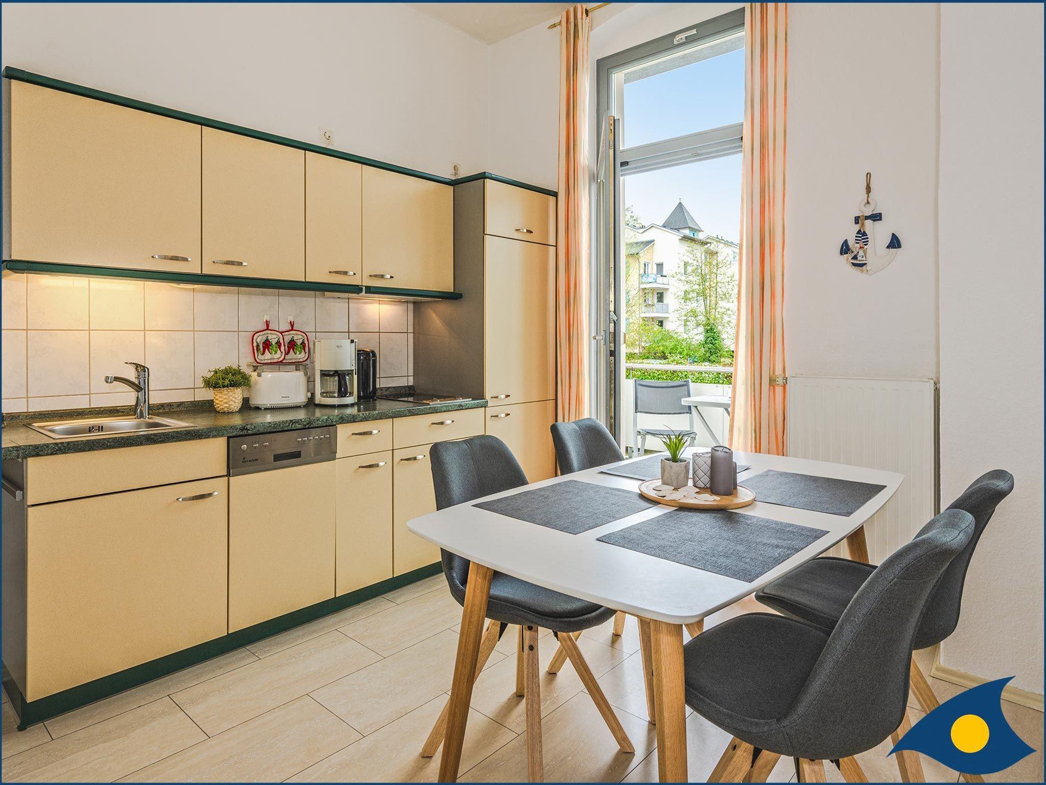 Zu diesem Traumappartement gehört ein wunderschöner, in Richtung Westen (Hofseite) ausgerichteter Balkon. Der großzügige Wohnraum lädt zum Kochen, Schlemmen, Fernsehen oder einem Spieleband mit der Familie oder Freunden ein. Die Küchenzeile bietet Ihnen alles, was Sie für die Zubereitung eines morgendlichen Frühstücks oder Ihres Lieblingsessens benötigen. Der Geschirrspüler kümmert sich um den Abwasch. So haben Sie mehr Zeit um die Sehenswürdigkeiten der Insel zu besichtigen, an der Promenade zu flanieren oder für das Bad in der Ostsee. Der Essbereich grenzt an der Küchenzeile an und ist hell am Fenster gelegen.