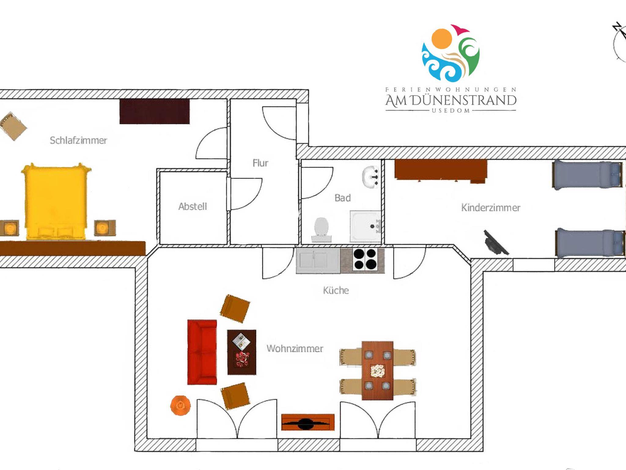 Der helle Wohnraum verfügt über eine offene und voll ausgestattete Küche sowie einen Esstisch für 4 Personen. Des Weiteren befindet sich dort eine gemütliche Sitzecke mit TV. Die Wohnung ist ideal für Familien mit 2 Erwachsenen und 2 Kindern. Für den erholsamen Schlaf gibt es im lichtdurchfluteten Schlafzimmer ein Doppelbett. Das zweite Schlafzimmer mit 2 Einzelbetten ist für Kinder besonders gut geeignet.