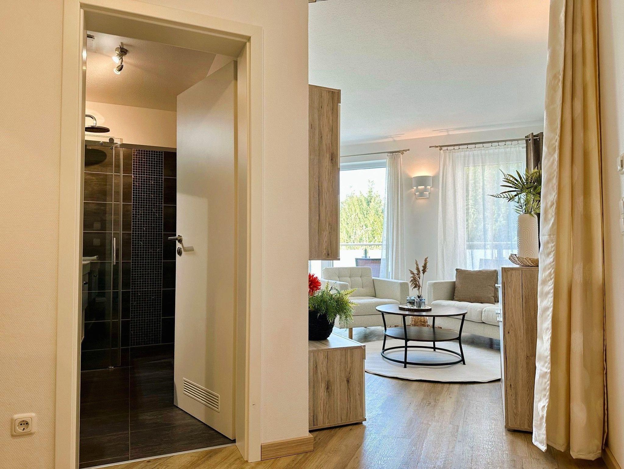 Das Appartement 10 in der Villa Bettina im 2. Obergeschoss ist ein idealer Ort für Entspannung und Regeneration. Die 46 Quadratmeter große Wohnung bietet viel Platz und modernen Wohnkomfort. Das Wohn-Esszimmer ist offen gestaltet und sorgt für eine entspannte Atmosphäre. Große Fenster lassen viel Licht herein und führen zu einem sonnigen Südwest-Balkon. Hier können Mahlzeiten am Esstisch oder auf der gemütlichen Sitzgruppe vor dem Flat-TV eingenommen werden. Die offene Küchenzeile ist stilvoll eingerichtet und verfügt über moderne Geräte und ausreichend Geschirr. Im gemütlichen Schlafzimmer befindet sich ein bequemes Boxspringdoppelbett und ausreichend Stauraum. Auch hier gibt es einen Flat-TV und einen eigenen Balkon mit Sonnenliege. Das Badezimmer verfügt über einen Waschtisch, WC und eine großzügige Regendusche. Ein Parkplatz für das Auto befindet sich direkt am Haus. Bei der Ankunft sind die Betten bereits bezogen und Handtücher liegen bereit, um Ihnen den Aufenthalt so angenehm wie möglich zu machen.