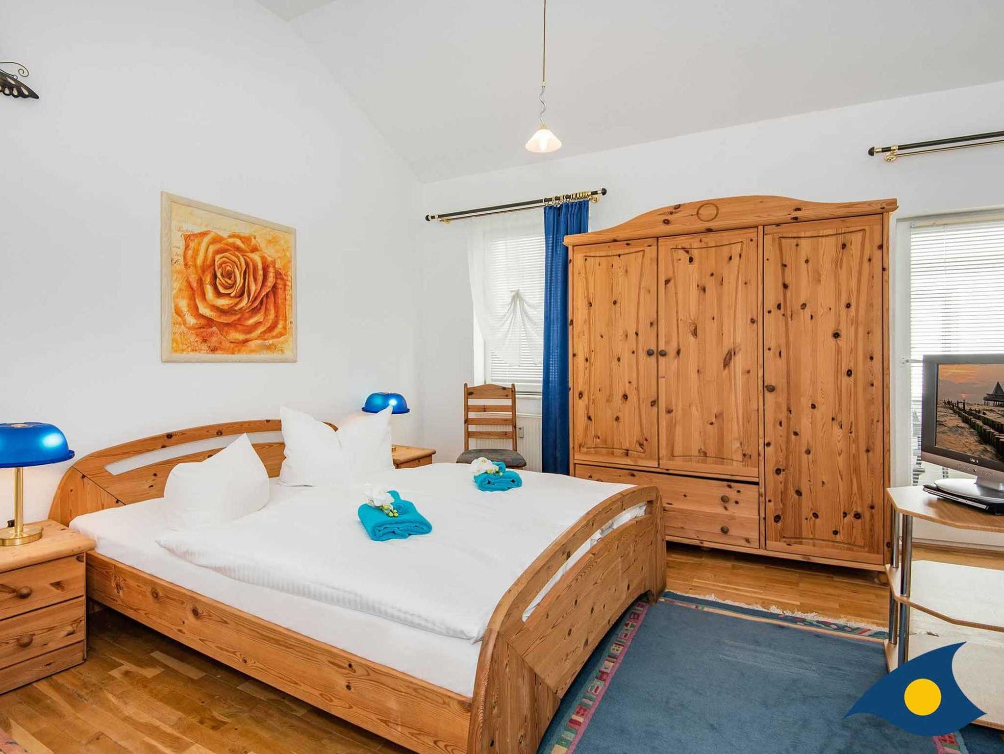 Das Schlafzimmer ist mit einem Doppelbett und einem geräumigen Schrank für Ihre Urlaubsutensilien ausgestattet. Das Sofa bietet einen weiteren bequemen Schlafplatz für zwei Jugendliche an. Auch ein Klapp-Babybett steht bereit. Vom Schalfzimmer aus, gelangen Sie auf den gemütlichen und geschützen Balkon mit Blick in den Hof.