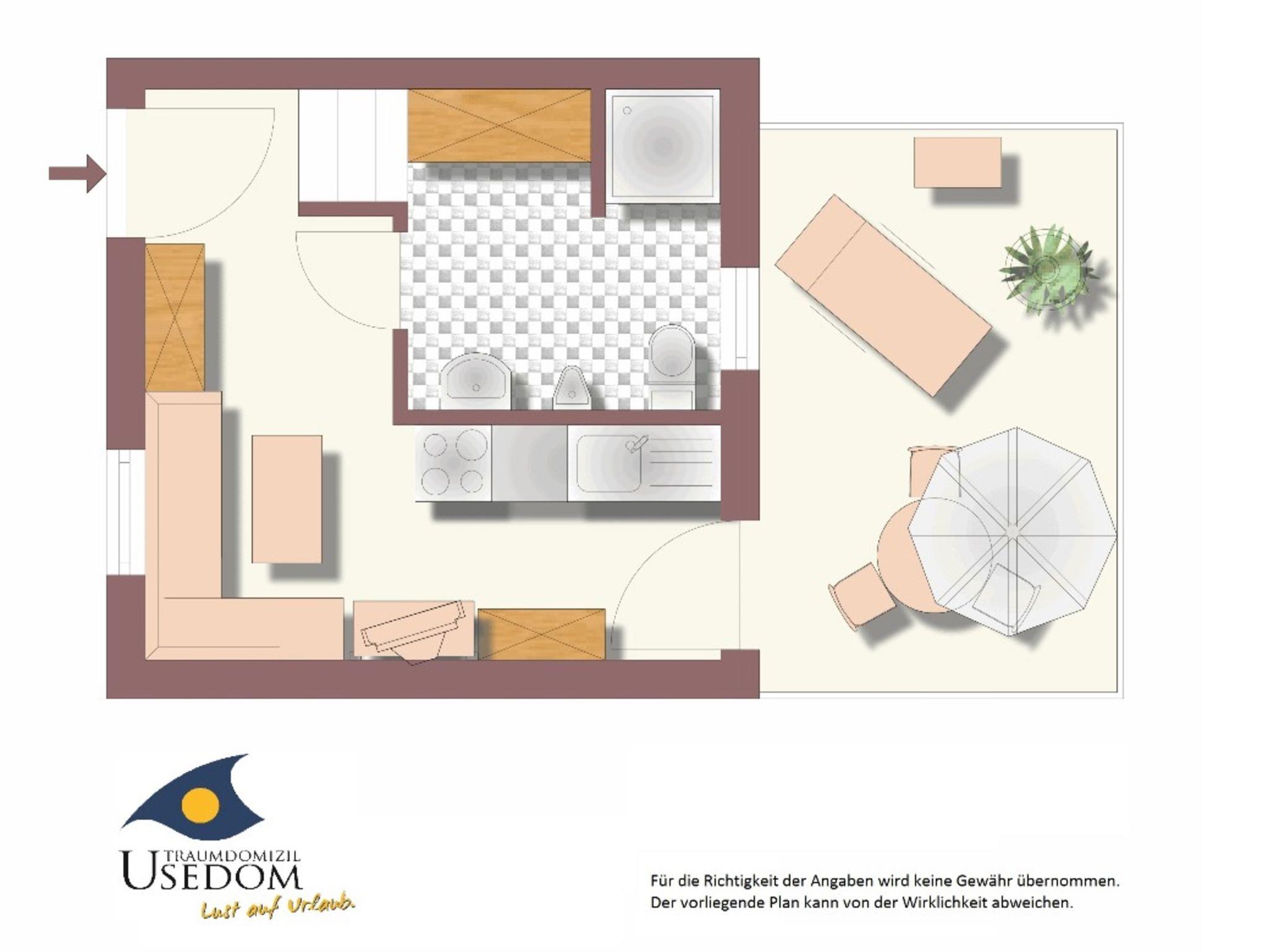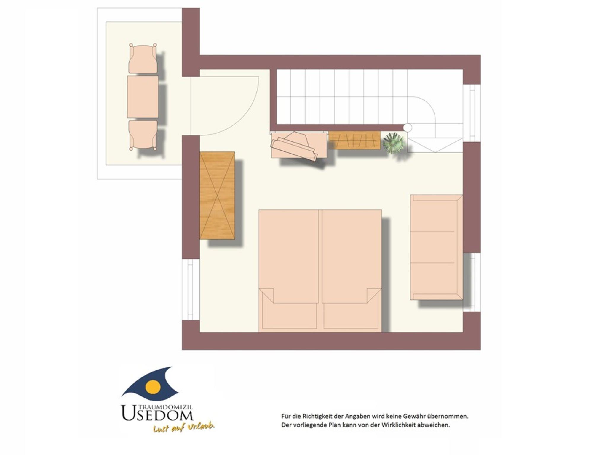 Klein aber fein - Die 2-Raum-Ferienwohnung befindet sich im Erdgeschoss sowie dem Obergeschoss des Gartenhauses der Villa Sonnenschein. Das Appartement ist eine Nichtraucherwohnung.