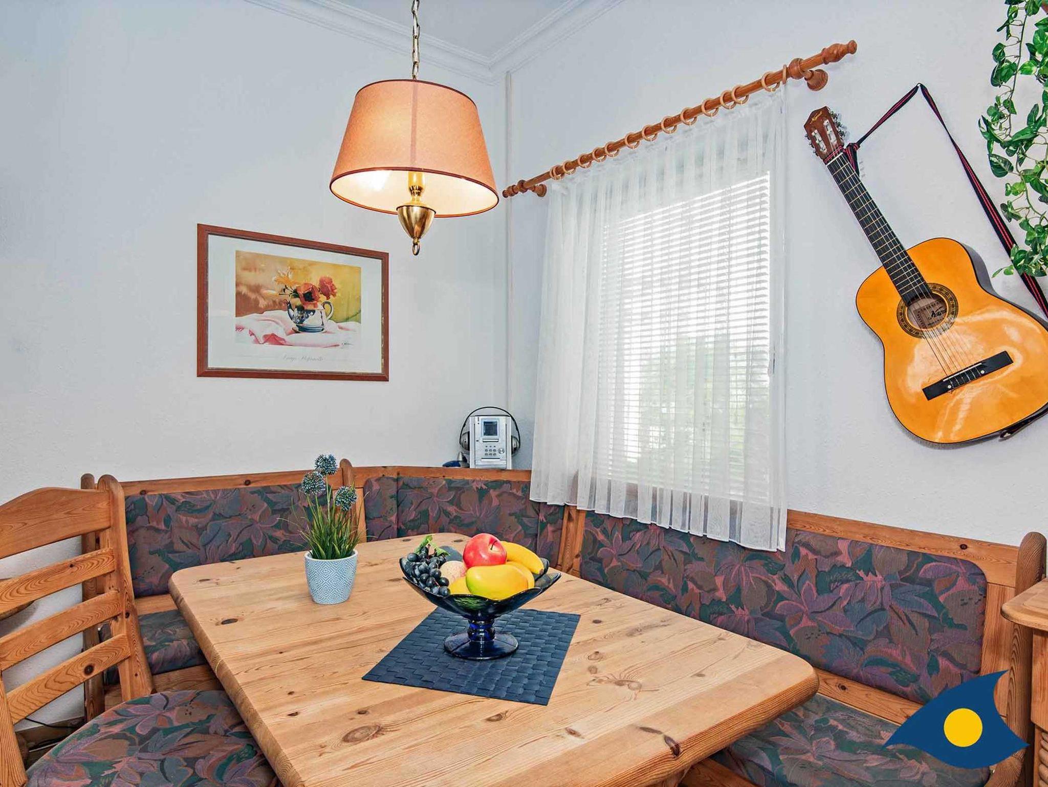 Die offene Küche hat einen Backofen, eine Mikrowelle sowie einen Kühlschrank. Münz- Waschmaschine und Trockner befinden sich in der Villa Sonnenschein nebenan.