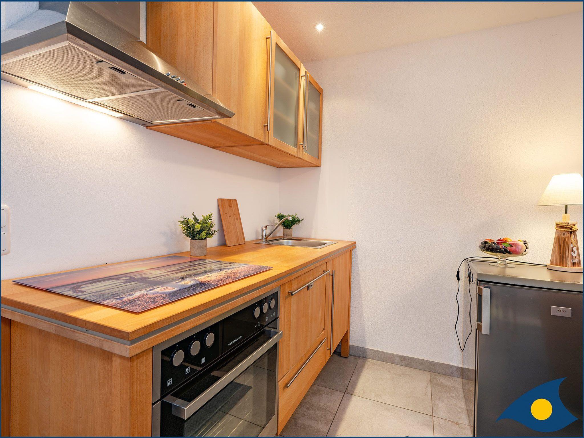 Es erwartet Sie ein gemütlicher Wohnbereich mit einer Küchenzeile und Essbereich. In der Wohnküche befinden sich ein freistehender Kühlschrank mit Gefrierfach, 1 großes Ceran-Kochfeld mit Backofen und eine Spülmaschine.