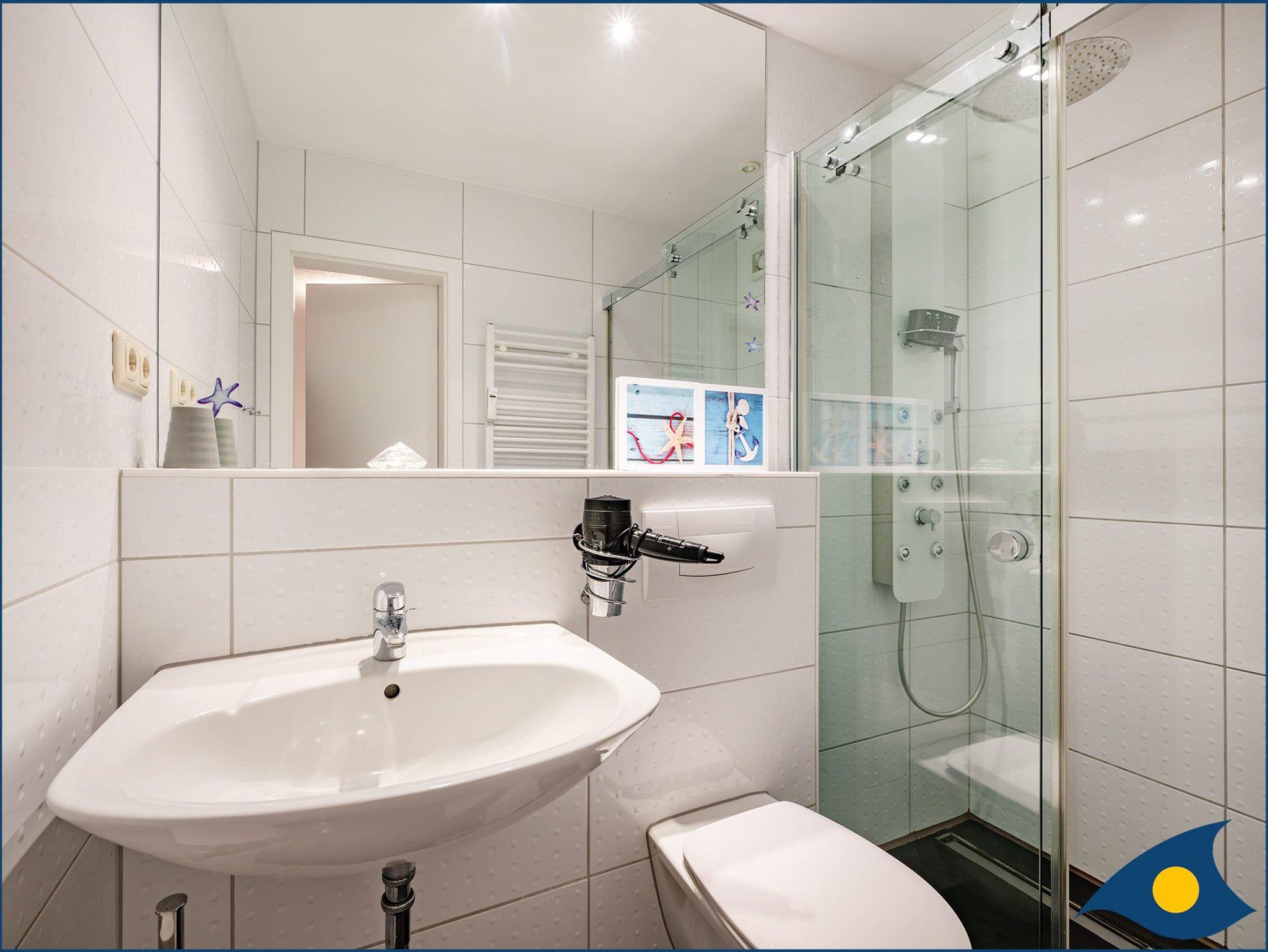 Das Duschbad hat eine ebenerdige Dusche mit Glasabtrennung und ein Föhn ist vorhanden.