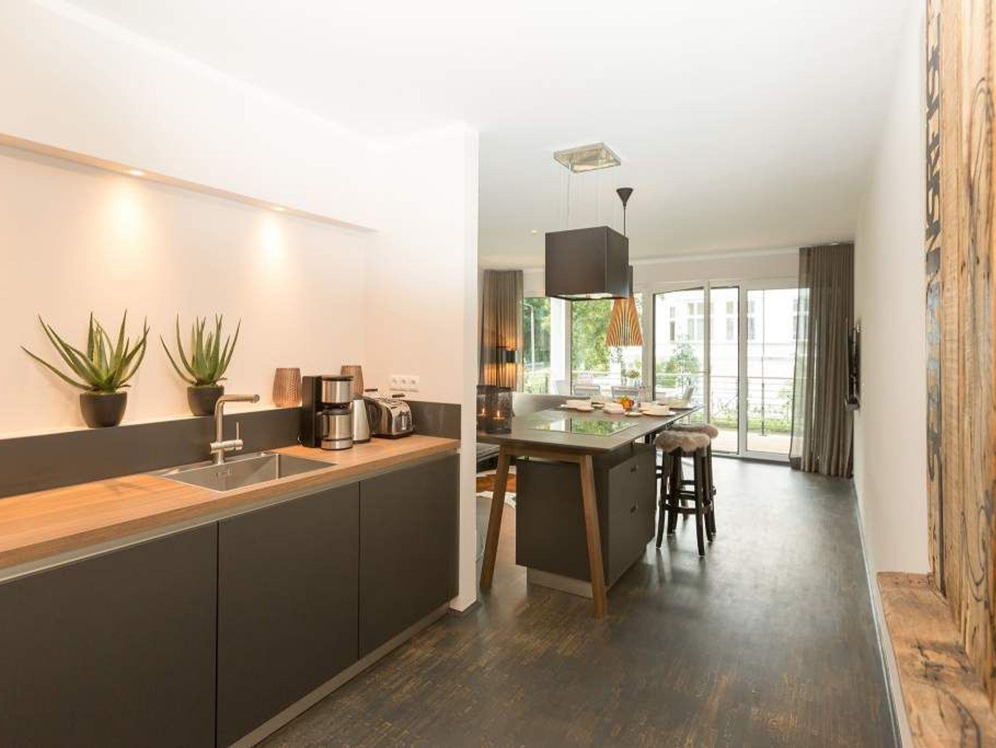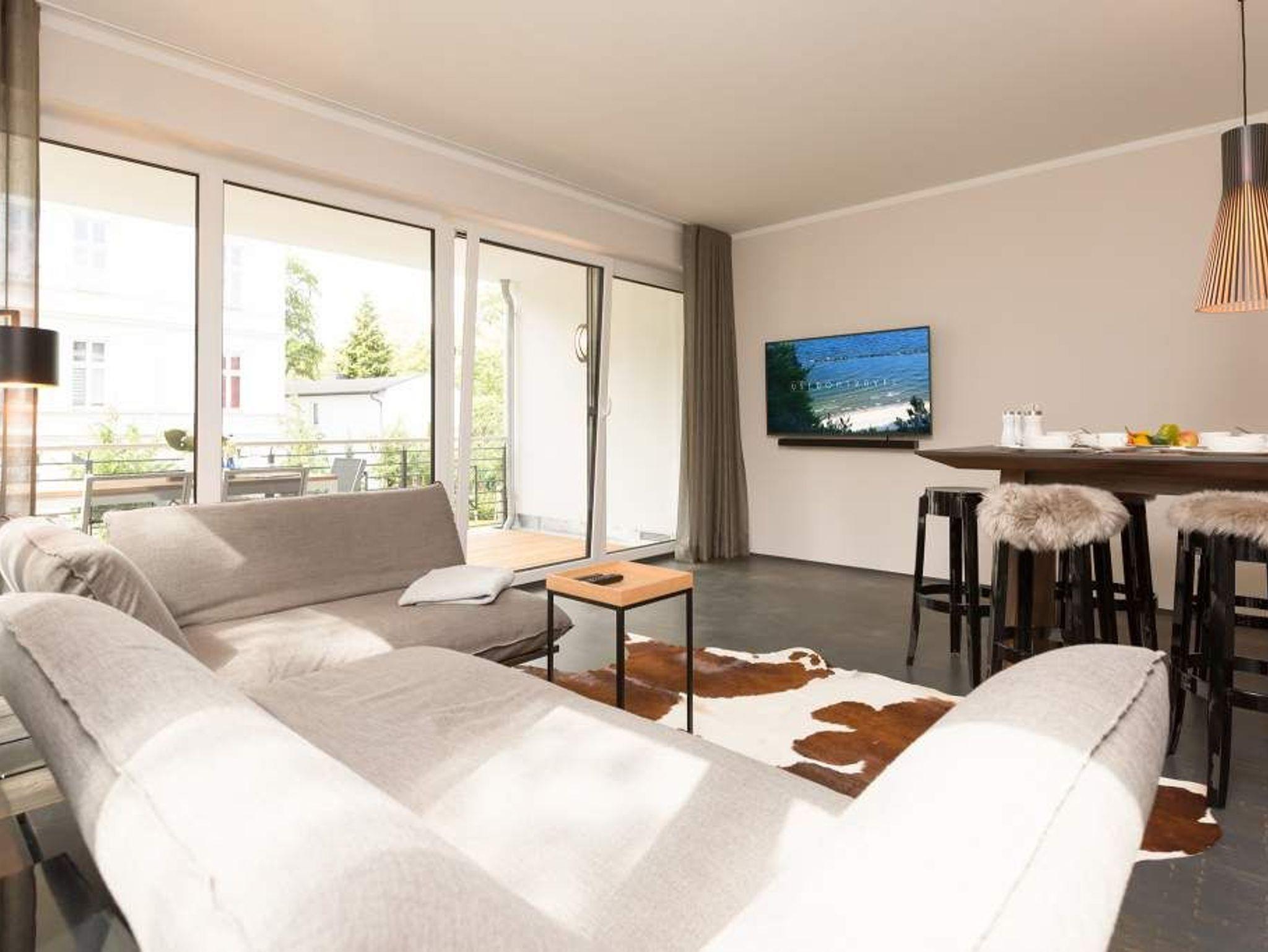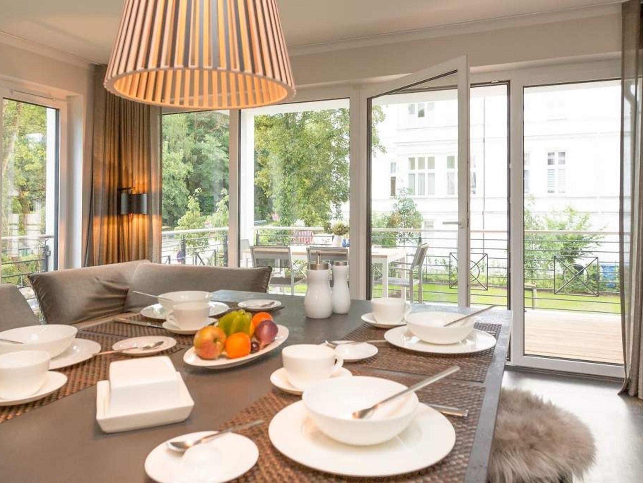 Vogelzwitschern und das sanfte Rauschen der Ostsee: Umgeben von wunderschönen, alten Bäumen atmet die 2017 fertig gestellte Villa Strandgrün das Flair der sie umgebenden Bädervillen. Mit seinen Balkonen und Erkern, die die Fassade untergliedern und auflockern, passt sich das strandnahe (100 Meter) Urlaubsdomizil angenehm in das Bild der aufwendig sanierten Villen um sie herum ein und wirkt selbst wie eine Weiterführung der einst mondänen Architektur des 19. Jahrhunderts. Das stilvolle Äußere setzt sich im exklusiven und eleganten Wohndesign im Inneren fort. Jede Ferienwohnung verfügt über eine Sonnenterrasse oder mehrere Balkone. Besondere Highlights eines jeden Appartements sind der Kamin, eine Sauna und je zwei Bäder bzw. ein zusätzliches Gäste WC. Die großzügigen 3- und 4-Raum-Suiten wurden mit allem Komfort konzipiert und ausgestattet. Vom ASA-Geschirr bis zu den hochwertigen Designmöbeln steht das Wohlfühlen an erster Stelle. In der Tiefgarage gibt es für jedes Appartement einen Stellplatz. Außerdem steht für jede Wohnung ein Briefkasten am Haus zur Verfügung.