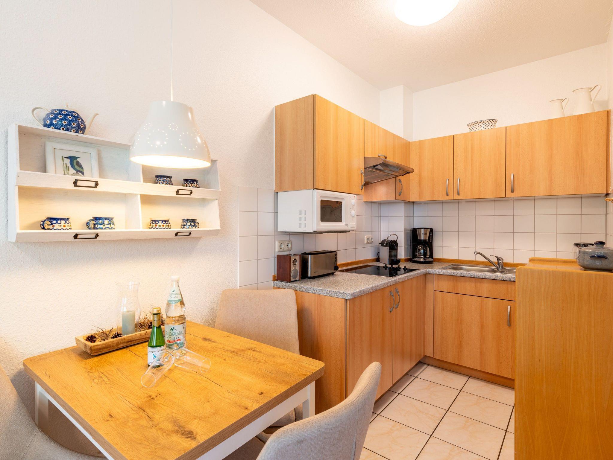 Die moderne, helle Ferienwohnung im Erdgeschoss mit Balkon und Sitzgelegenheit befindet sich in einem Appartementhaus in ruhiger, strandnaher Lage (ca. 3 Gehminuten). Die Ferienwohnung verfügt über einen Schlafraum (Doppelbett, TV), ein Wohn-/Schlafraum mit einer Doppelbettcouch, sowie Kabel-LCD Fernseher, Radio, WLAN, und eine komplette Wohnküche (4-Kochfelder ohne Backofen). Das sanierte Badezimmer verfügt über eine große Dusche.