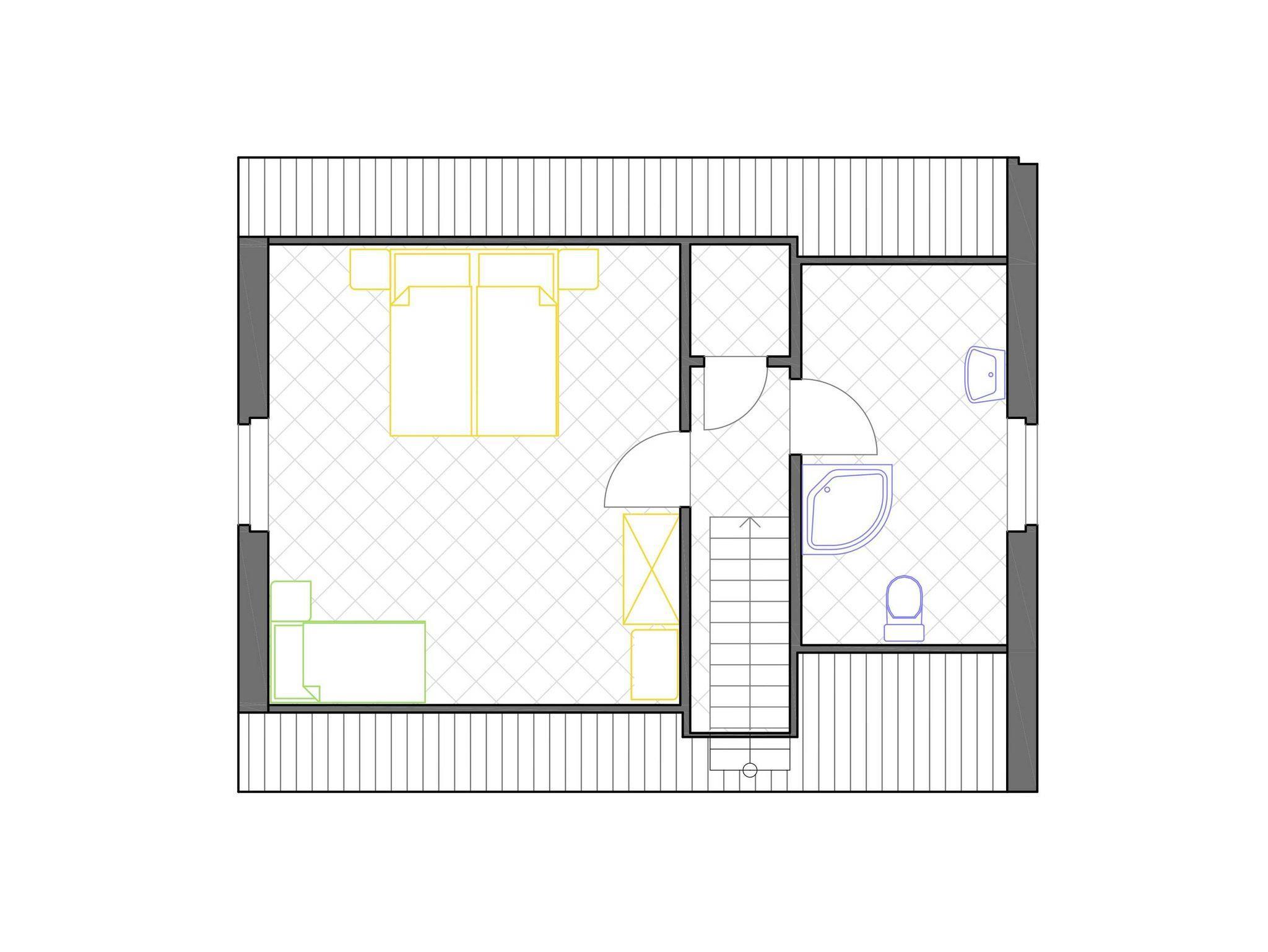 Durch die Treppe gelangen Sie ein Stockwerk höher in den Flur. Von dort aus gelangen Sie ins Badezimmer und ins Schlafzimmer. Im Schlafzimmer befindet sich ein Doppelbett, ein Einzelbett, Kleiderschrank und Kommode. Das Tageslicht Badezimmer hat eine Dusche und WC.