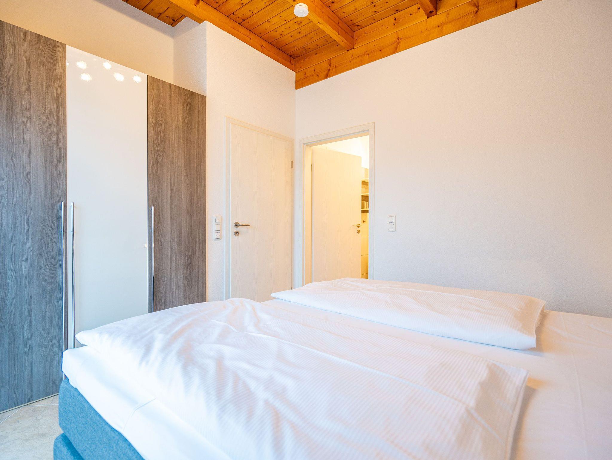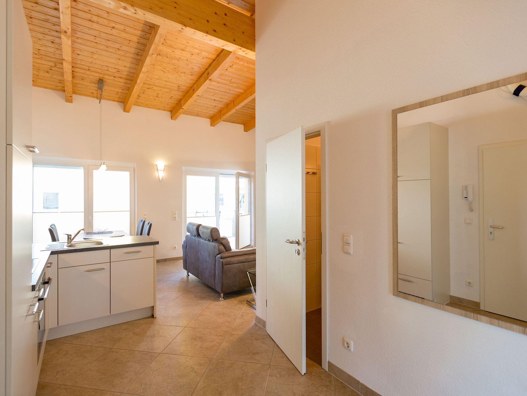 Der Urlaub mit der Familie oder den Freunden kann kommen. Denn in diesem 64 Quadratmeter großen Auszeitparadies im 1. Stock ist Platz für vier Personen und ein Kleinkind bis drei Jahre (im Kinderreisebett). Drei lichte und hohe Räume mit offener Balkendecke, modernes Design, die technische Ausstattung auf dem neuesten Stand und all das mit Liebe zu einem harmonischen Wohnkonzept vereint ? hier wird der Urlaub zum unvergesslichen Erlebnis. Auf zwei Balkonen (18 und 11 Quadratmeter groß) können Sie ausspannen und Sonne tanken. Sowohl das Wohnzimmer als auch beide Schlafzimmer haben Zugänge zu ihnen. Im Inneren wartet ein stylisches und sehr gemütliches Wohn-Esszimmer auf Sie. Die großen Fenster lassen viel Licht hinein. Kalte Füße gehören dank der Fußbodenheizung in allen Räumen der Vergangenheit an. Zwei moderne Sofas sorgen für viel Komfort beim Relaxen vor dem Echtholz-Kaminofen oder dem 3D-Flat-TV. Auf dem Blue-Ray-Player können problemlos alle Lieblingsfilme abgespielt werden. An dem großen Esstisch können sich alle zu gemeinsamen Muße- und Genussstunden zusammenfinden. Apropos Genuss ? den können Sie in der vollausgestatteten und offenen Küche dank hochwertiger Geräte und edlem Geschirr kinderleicht selbst zaubern. Vom Wohnzimmer aus können Sie auf den großzügigen Südbalkon hinaustreten. Zwei Schlafzimmer mit komfortablen Doppelbetten (1,80 m x 2,00 m)(1x mit Flat-TV) sind Rückzugsorte, in denen Sie neue Energie tanken können. Denn hier werden Sie schlafen wie Babys. Morgens werden Sie dann von der Sonne sanft geweckt. Begrüßen Sie den Tag gleich mal an der frischen Luft. Denn von den Schlafzimmern aus geht?s direkt auf den von der Morgensonne beschienen Ostbalkon mit Blick ins Grüne hinaus. Beide Schlafzimmer haben einen geräumigen Kleiderschrank. Das Appartement verfügt über zwei moderne Bäder mit Dusche und WC. Das Masterbad ist direkt von einem der beiden Schlafzimmer aus begehbar. Bei Ankunft sind die Betten bezogen und Handtücher liegen bereit. In der Tiefgarage ist ein Stellplatz für das Appartement vorgesehen. Auf Wunsch stellen wir für unsere kleinen Gäste ein Kinderreisebett (ohne zusätzliche Matratze [&] Bettzeug) und einen Kinderhochstuhl (gegen einen Aufpreis) zur Verfügung.