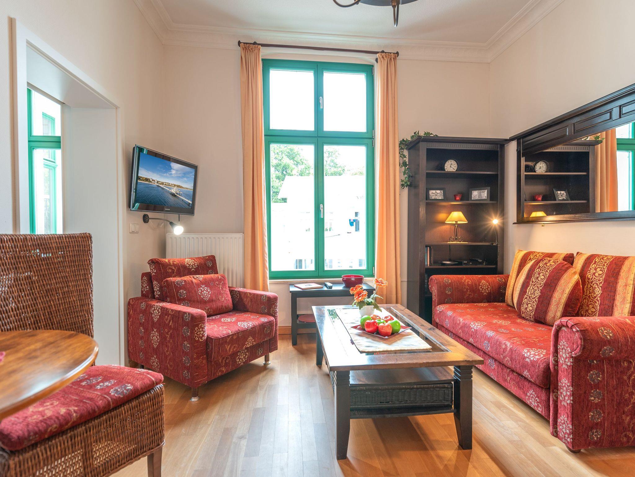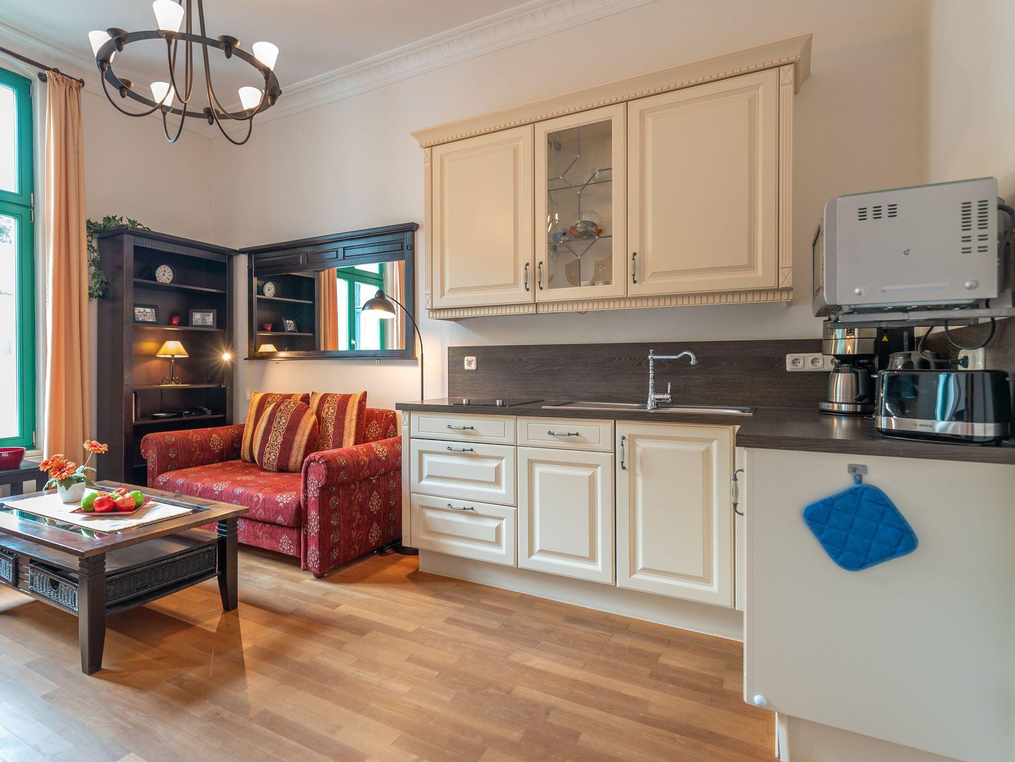 Die gemütliche Sitzecke lädt zum Entspannen oder Lesen ein. Ein Flachbild-TV sorgt für Unterhaltung. Die integrierte Landhausküche ist vollständig ausgestattet. Die Mikrowelle verfügt über eine Backfunktion. Ein kleiner Esstisch befindet sich direkt in Küchennähe.