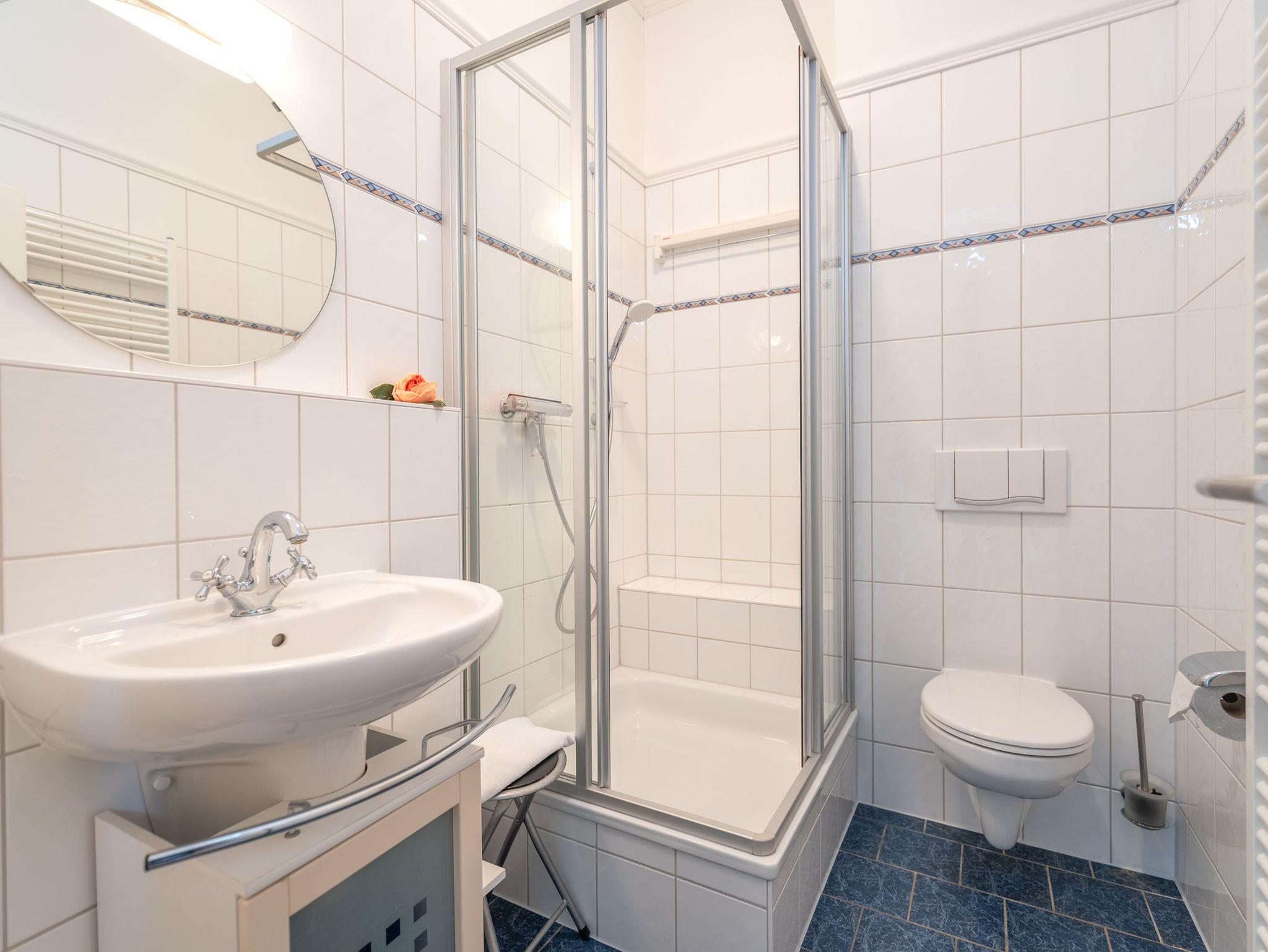 Das Badezimmer ist ausgestattet mit Dusche, WC, Waschbecken und Fön. Zusätzlich stehen gemeinschaftliche Waschmaschine und Trockner (gegen Gebühr) sowie eine Fahrradabstellmöglichkeit im Keller (mit Steckdosen fürs E-bike) zur Verfügung. Das Grundstück ist umzäunt und durch ein elektrisches Tor gesichert, sodass Privatsphäre und Sicherheit gewährleistet sind.