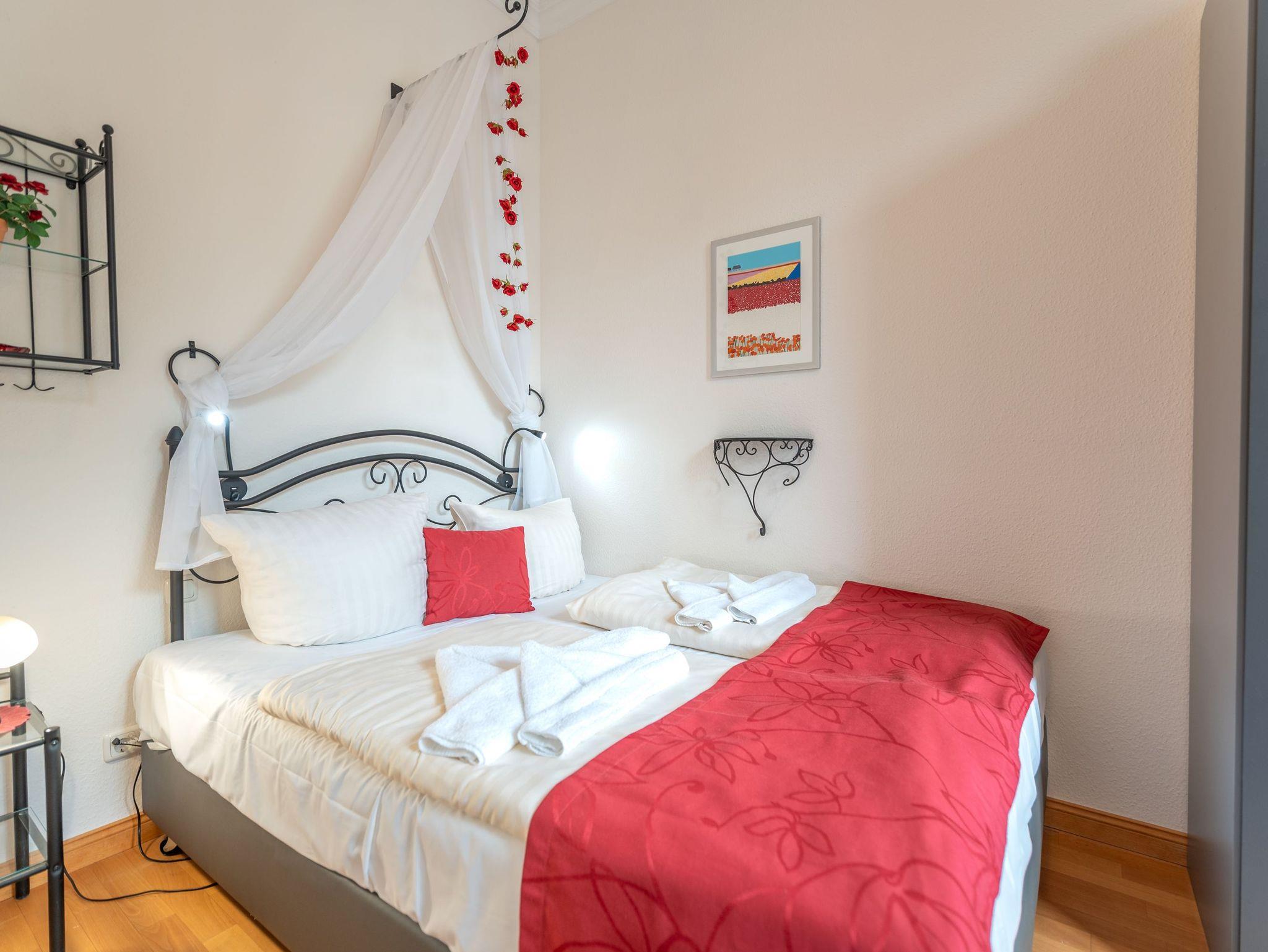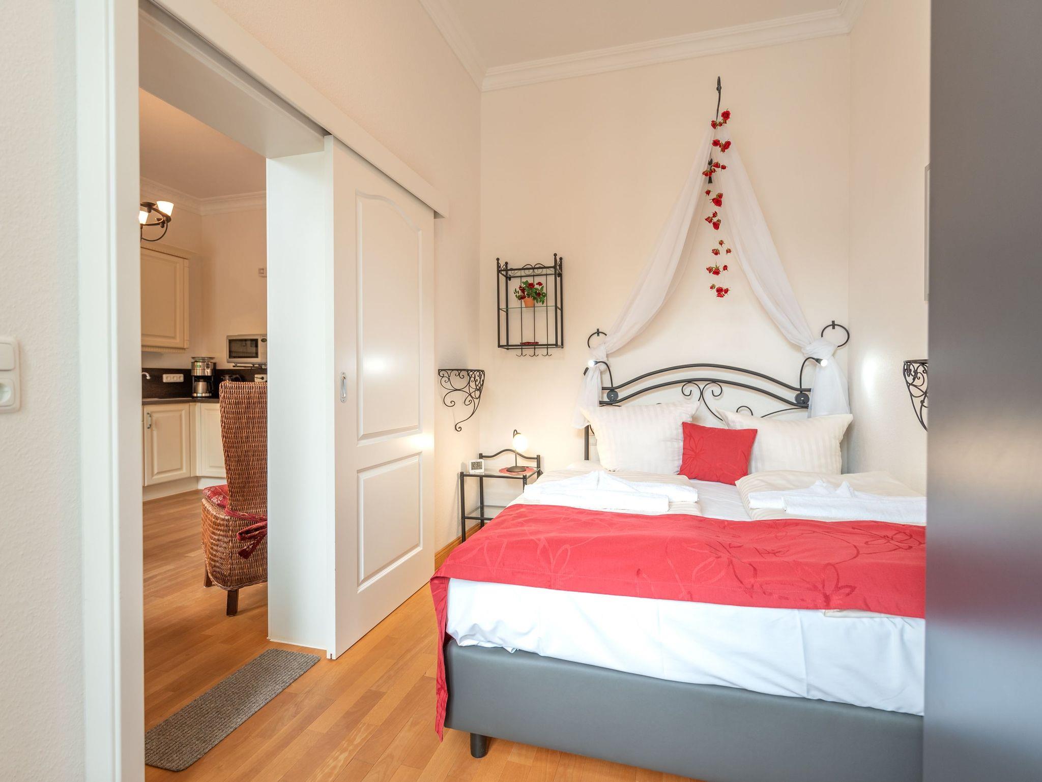 Das separate Schlafzimmer verfügt über ein Boxspringbett (ca. 1,60 m x 2,00 m). Ein Reisebett für ein Kind steht kostenfrei zur Verfügung. Ein Kleiderschrank bietet ausreichend Stauraum. Das Babyreisebett lässt sich ideal im Schlafzimmer direkt rechts vor dem Fenster aufstellen. So genießen Eltern und Kind einen erholsamen Schlaf in angenehmer Atmosphäre.